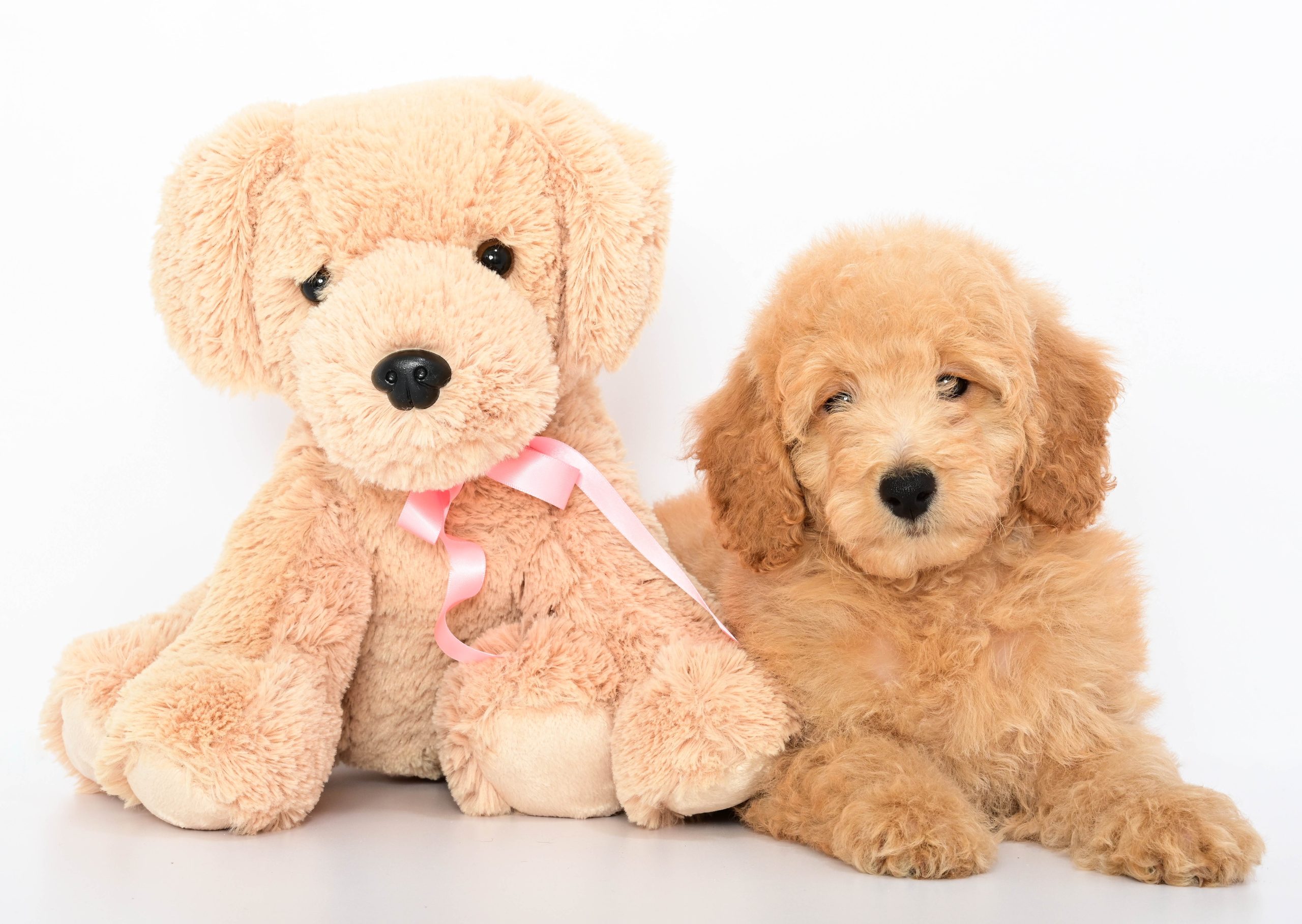 English Goldendoodles can inherit a variety of coat types, ranging from straight to wavy to curly. The majority have a wavy coats, which is soft, and sheds minimally, if at all. This is the most popular type and what we strive to breed towards, as it provides the “teddy bear” look while still being relatively low-maintenance compared to tighter curls. We can tell a puppies coat type through DNA testing or by seven weeks of age, and an experienced breeder can help families choose the coat that will best suit their lifestyle.