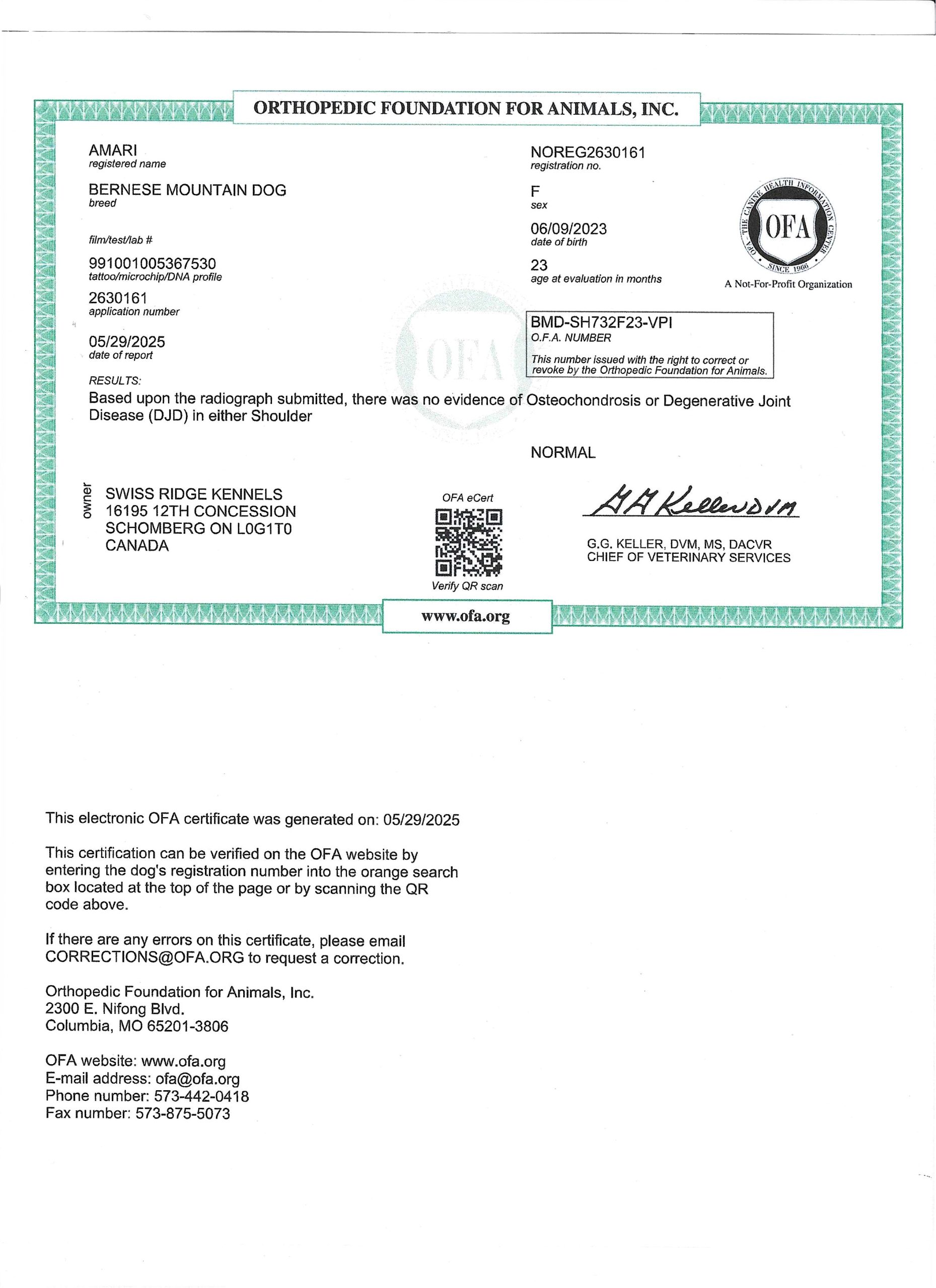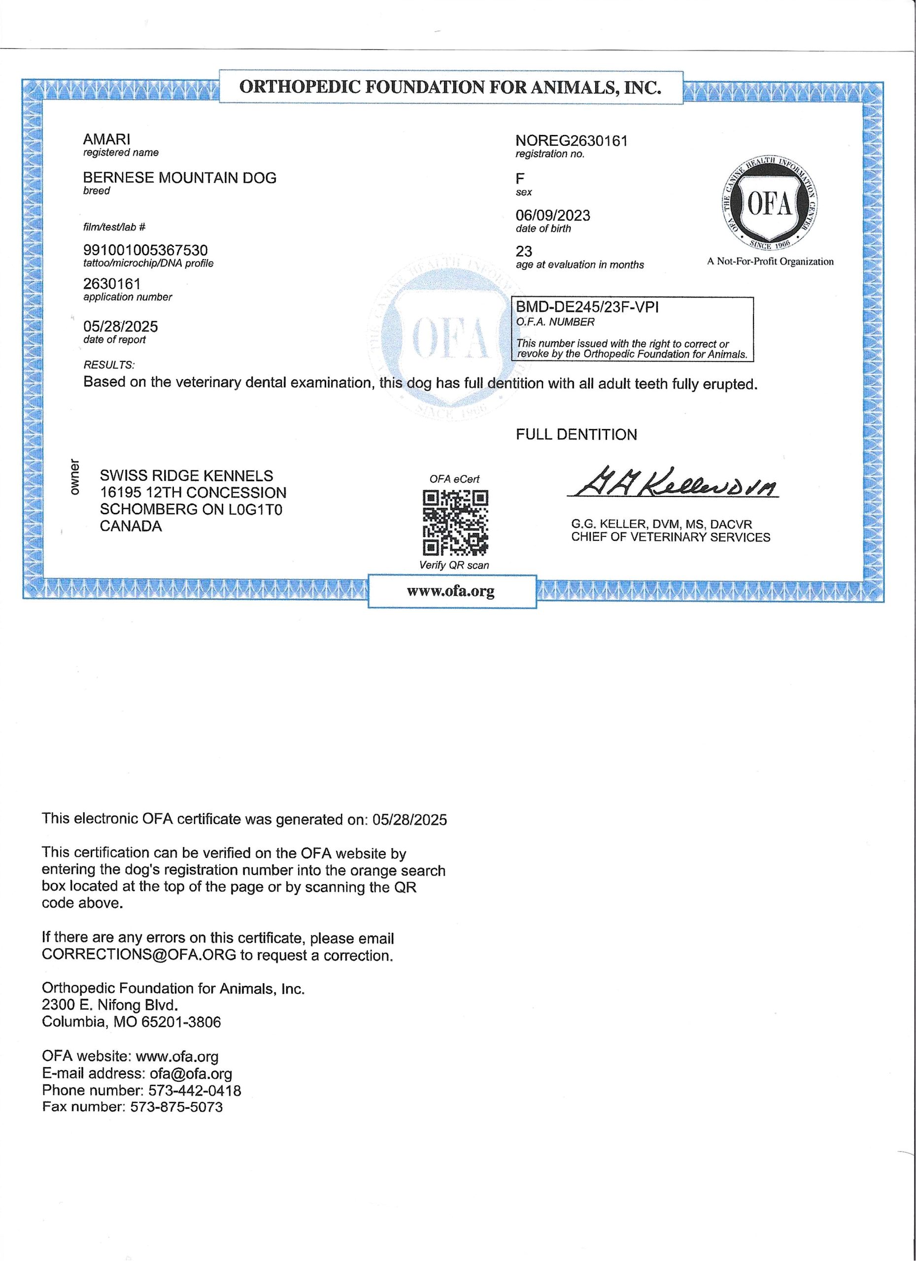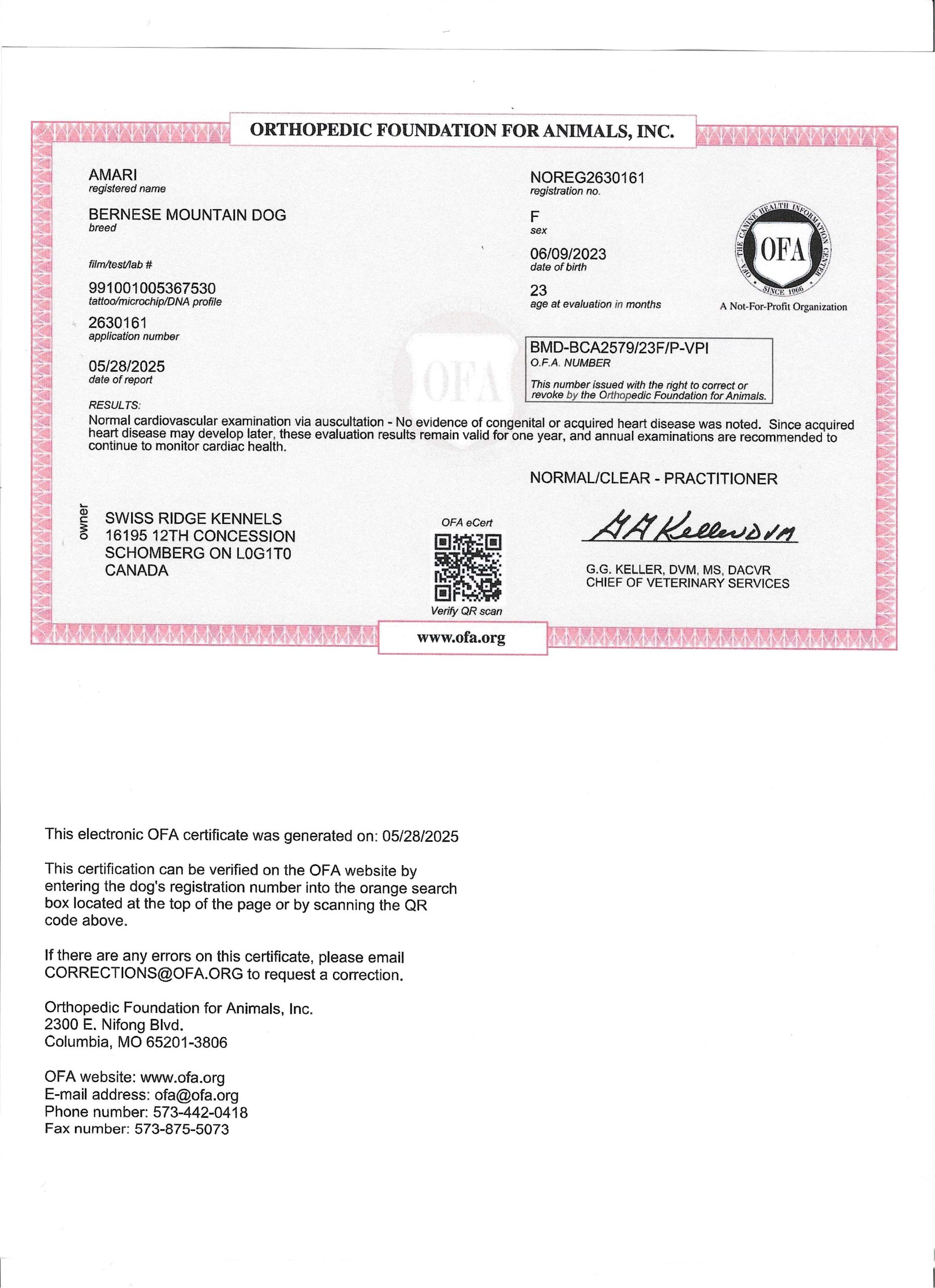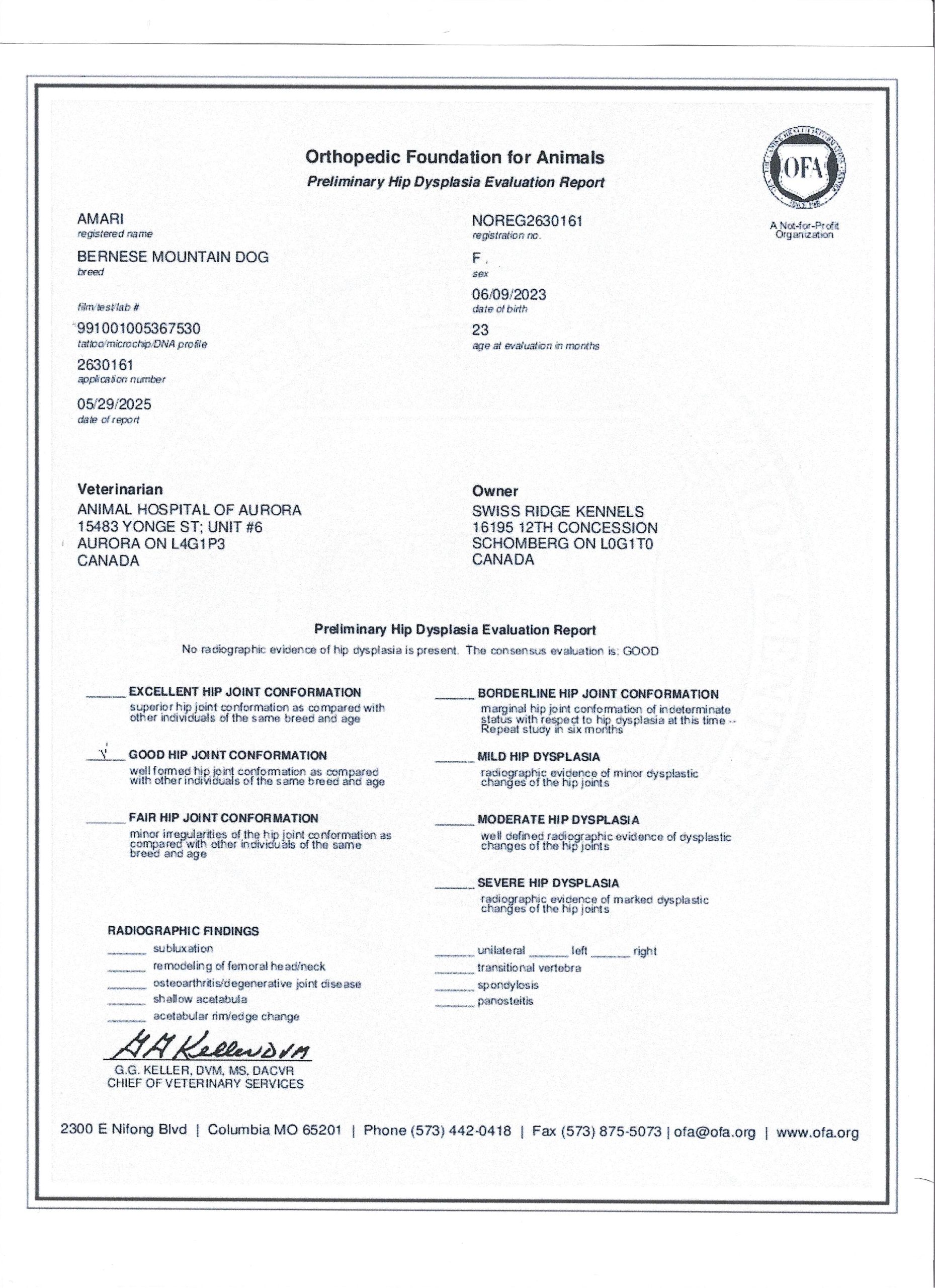 Amari has been fully health tested, and her health certificates are attached for your review. She has also been screened through Embark for over 250 genetic health conditions. At SwissRidge, we complete thorough health testing on all of our dogs, including x-rays, DNA testing, and physical exams performed by a licensed veterinarian to ensure we are breeding only the healthiest dogs who will go on to produce strong, healthy puppies.