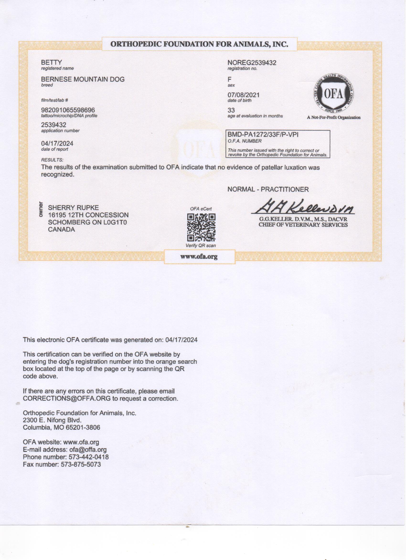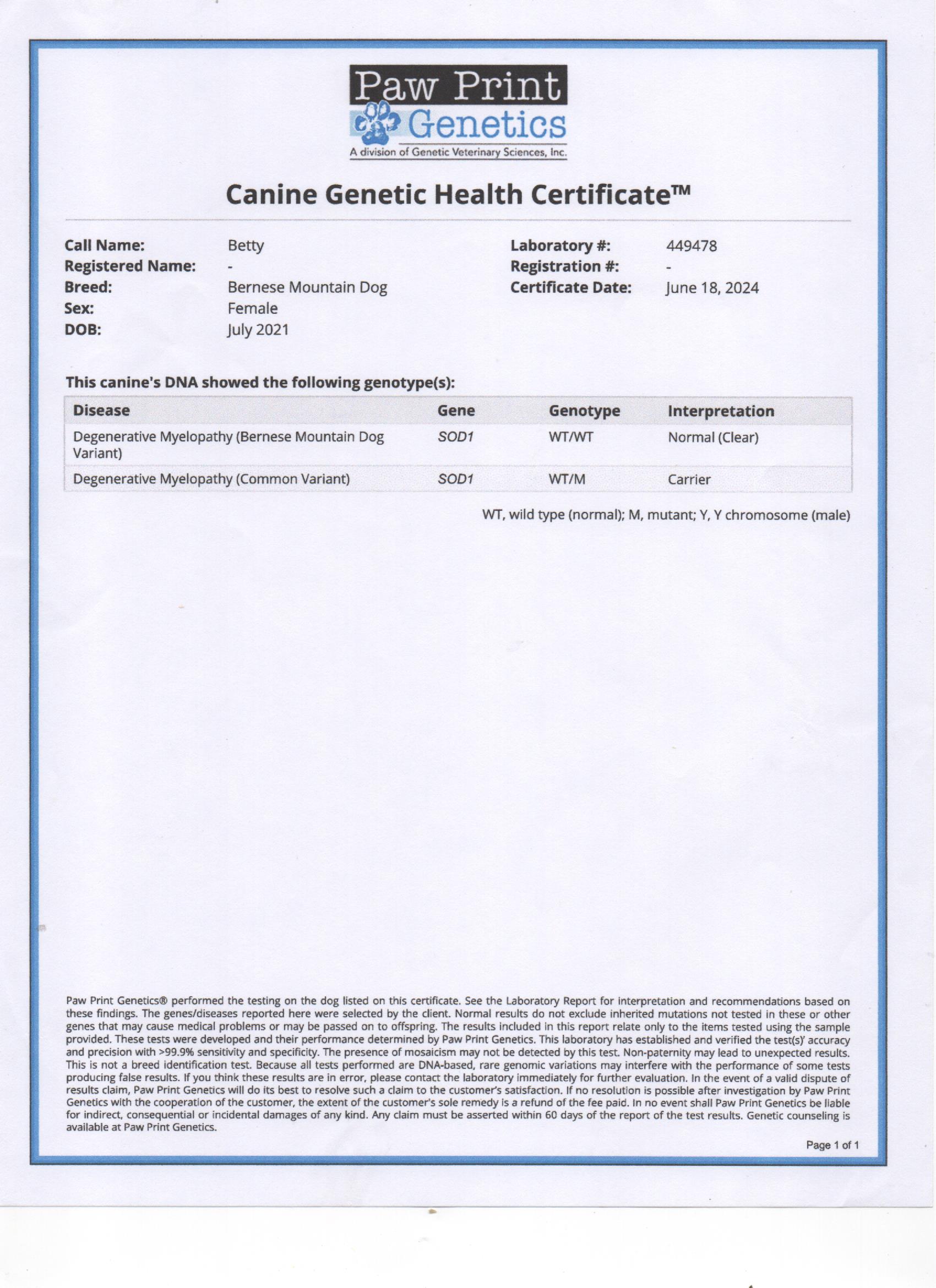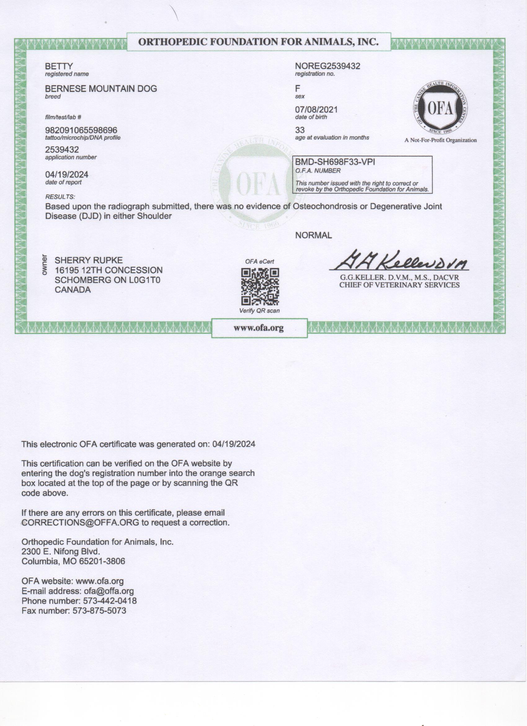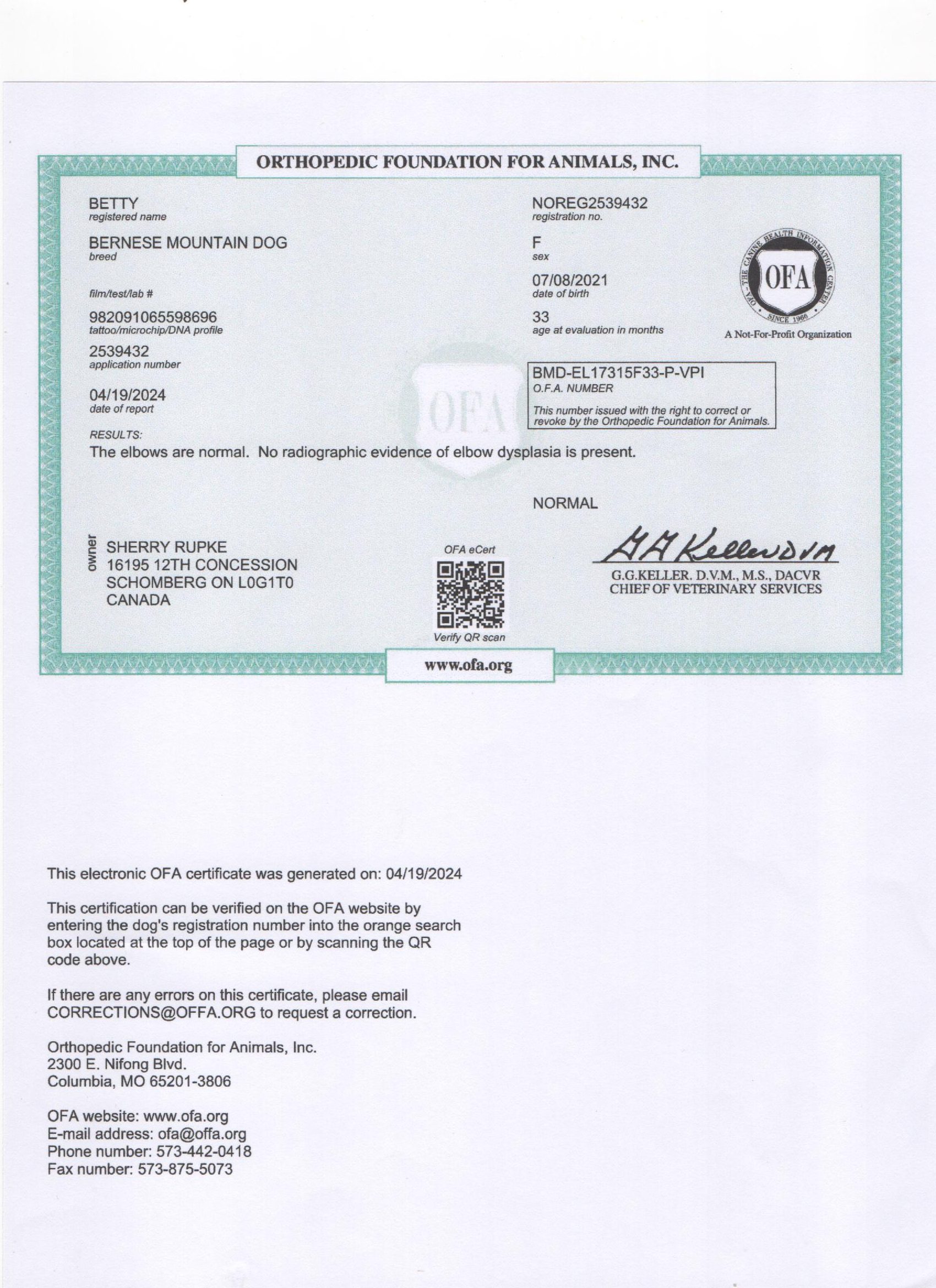 Betty has been fully health tested, and her health certificates are attached for your review. At SwissRidge, we complete thorough health testing on all of our dogs, including x-rays, DNA testing, and physical exams performed by a licensed veterinarian to ensure we are breeding only the healthiest dogs who will go on to produce strong, healthy puppies.
