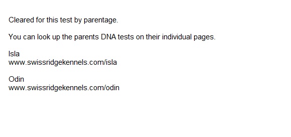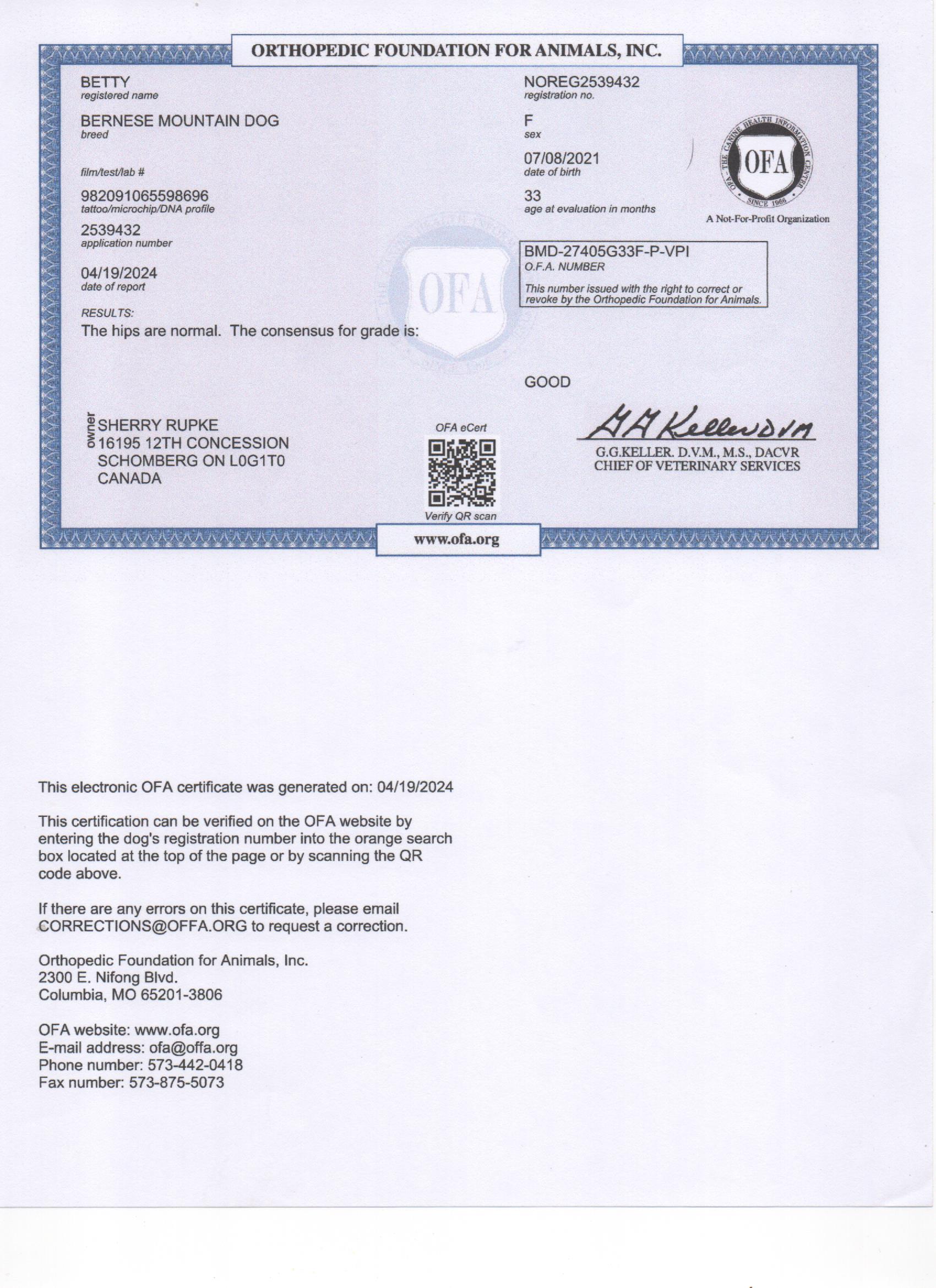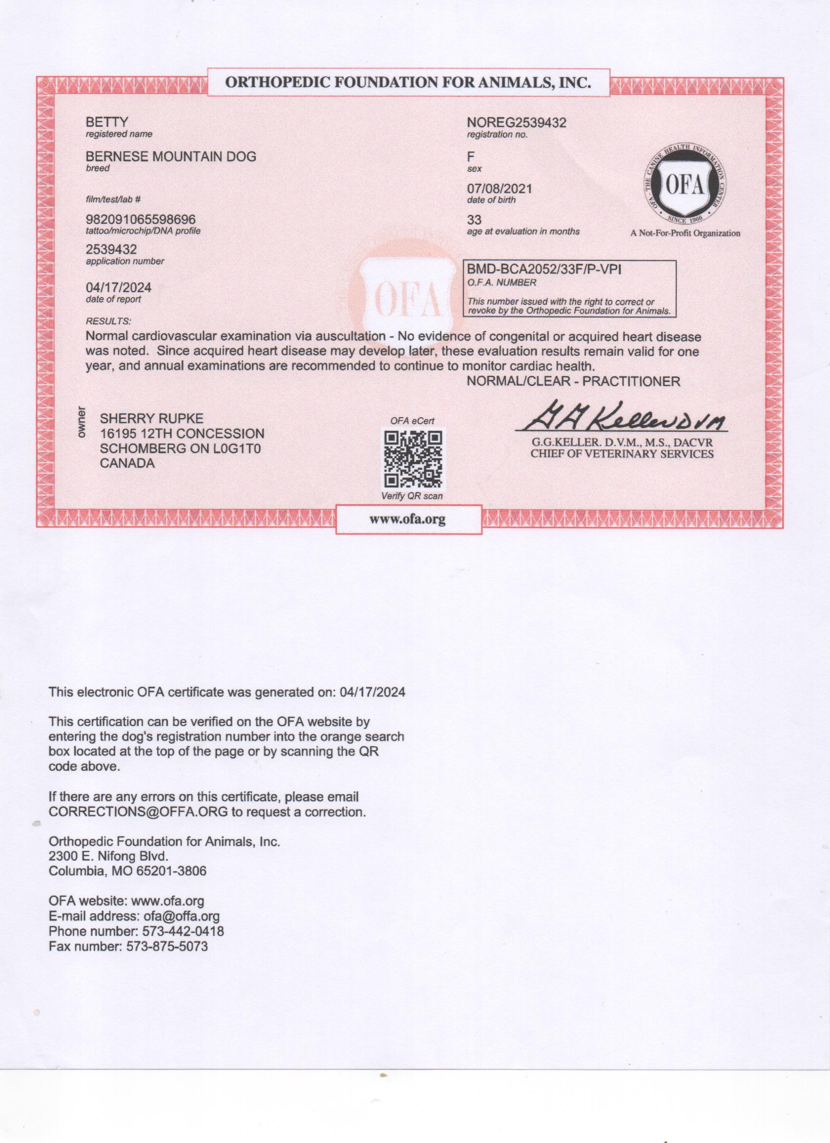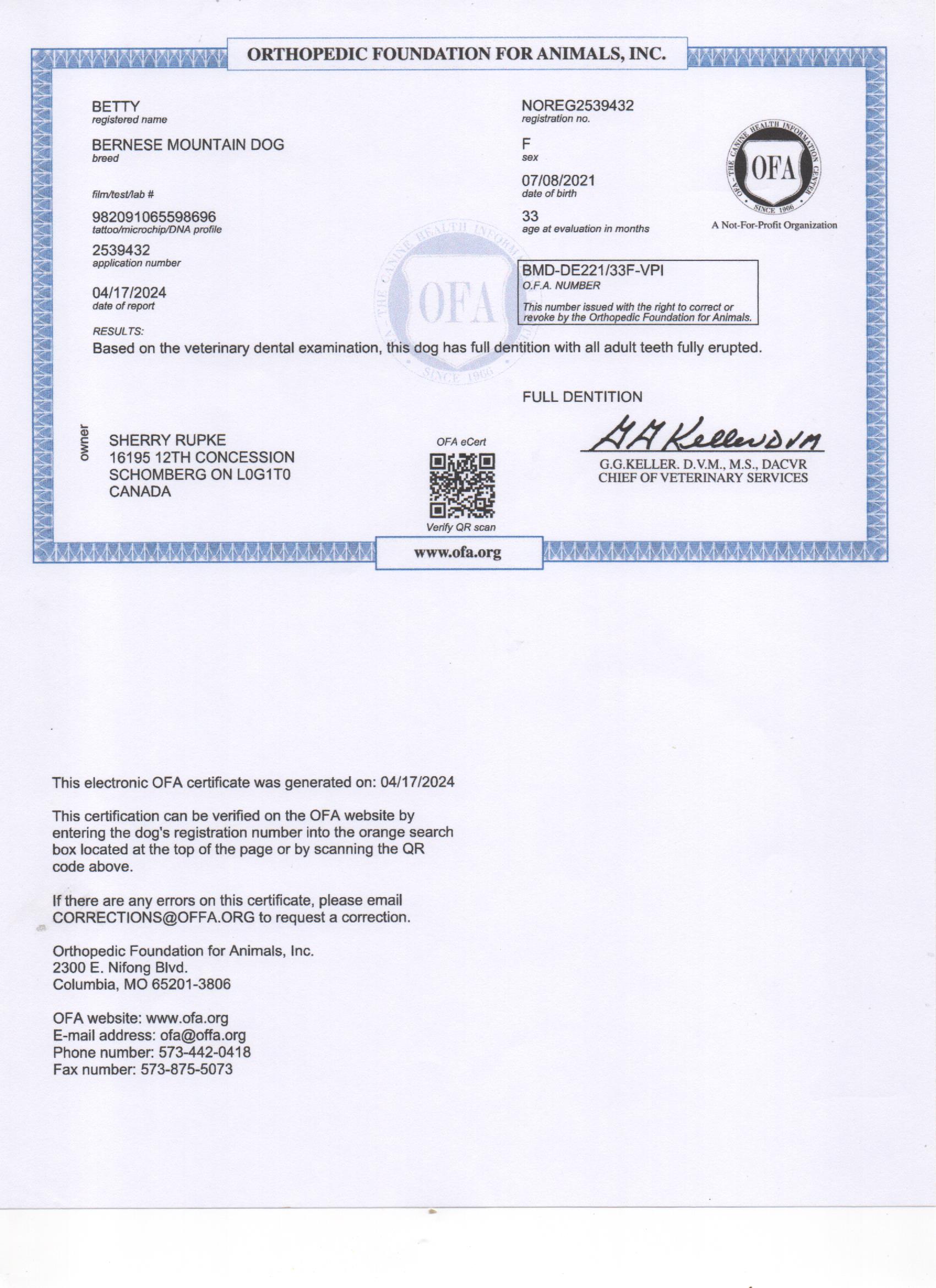 Betty has been fully health tested, and her health certificates are attached for your review. At SwissRidge, we complete thorough health testing on all of our dogs, including x-rays, DNA testing, and physical exams performed by a licensed veterinarian to ensure we are breeding only the healthiest dogs who will go on to produce strong, healthy puppies.