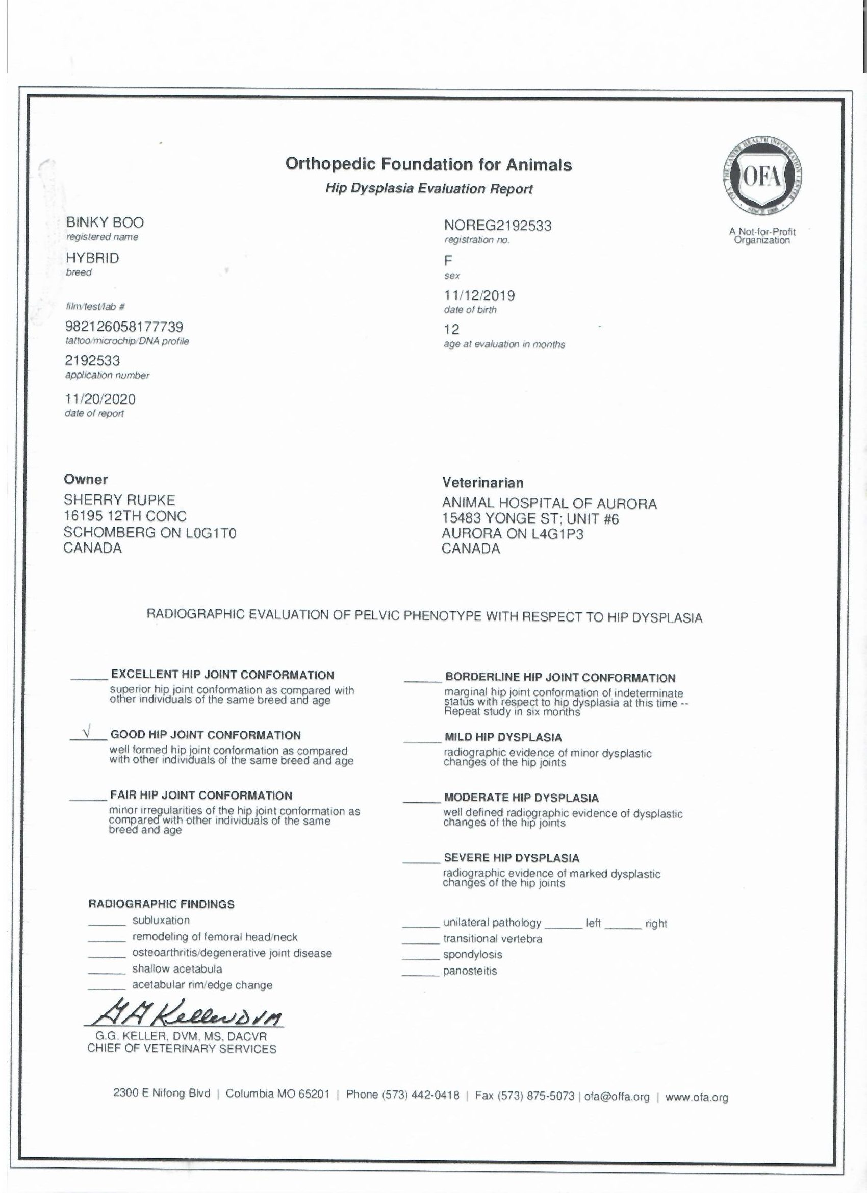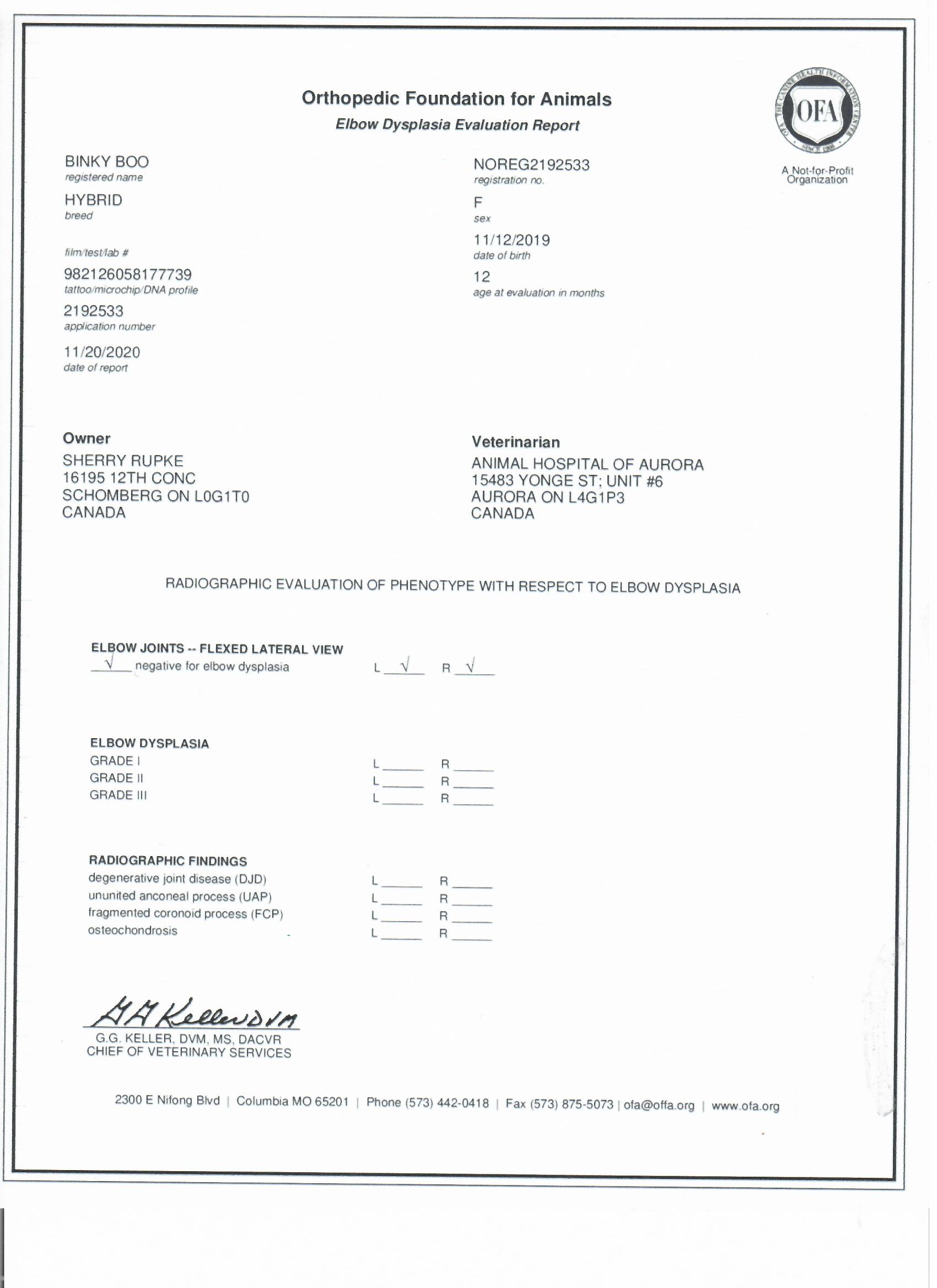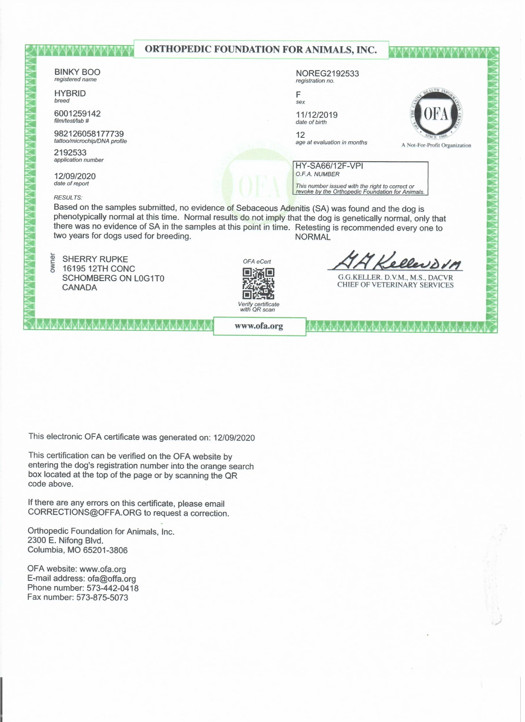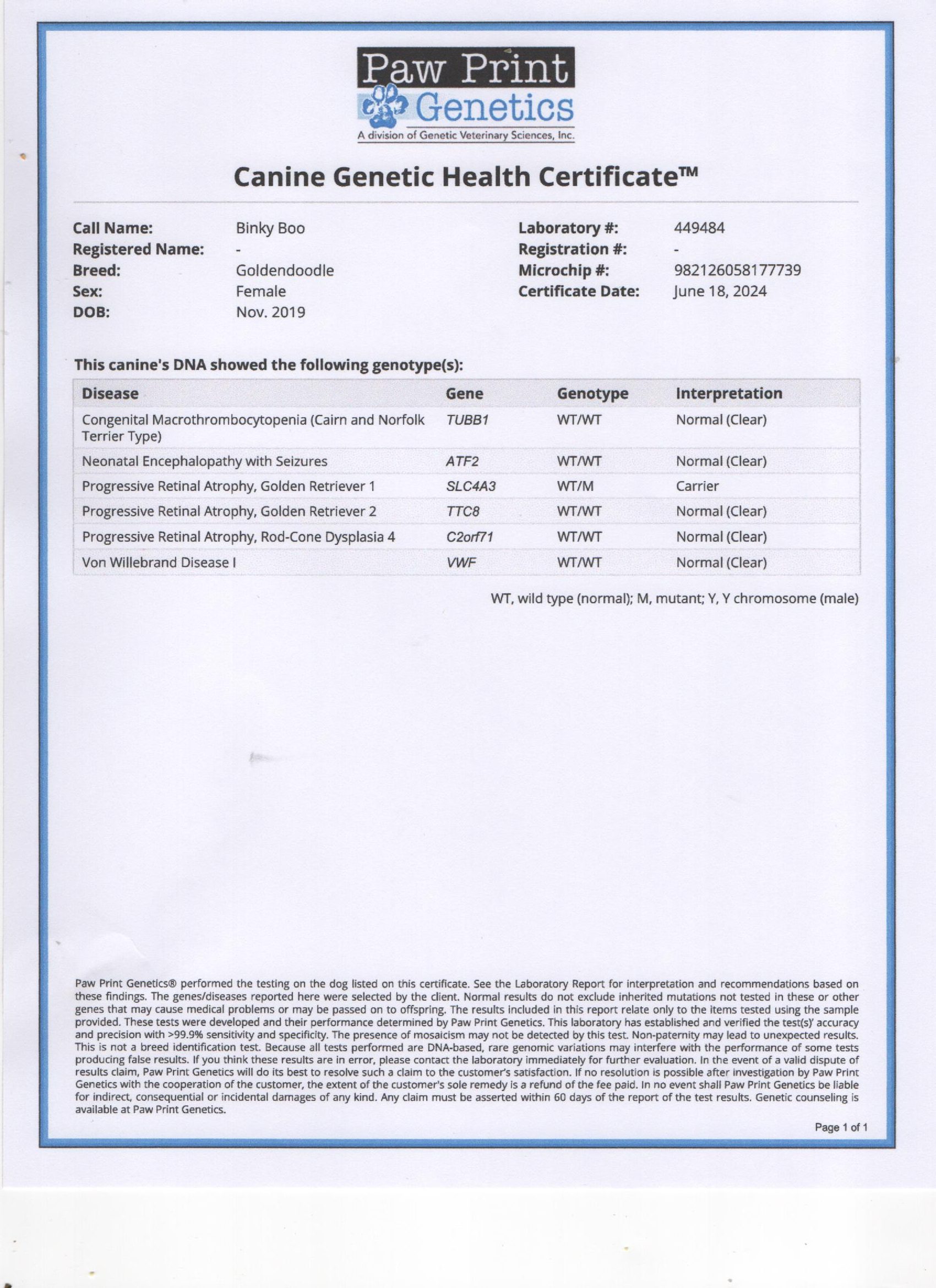 Binky Boo has been fully health tested, and her health certificates are attached for your review. At SwissRidge, we complete thorough health testing on all of our dogs, including x-rays, DNA testing, and physical exams performed by a licensed veterinarian to ensure we are breeding only the healthiest dogs who will go on to produce strong, healthy puppies.