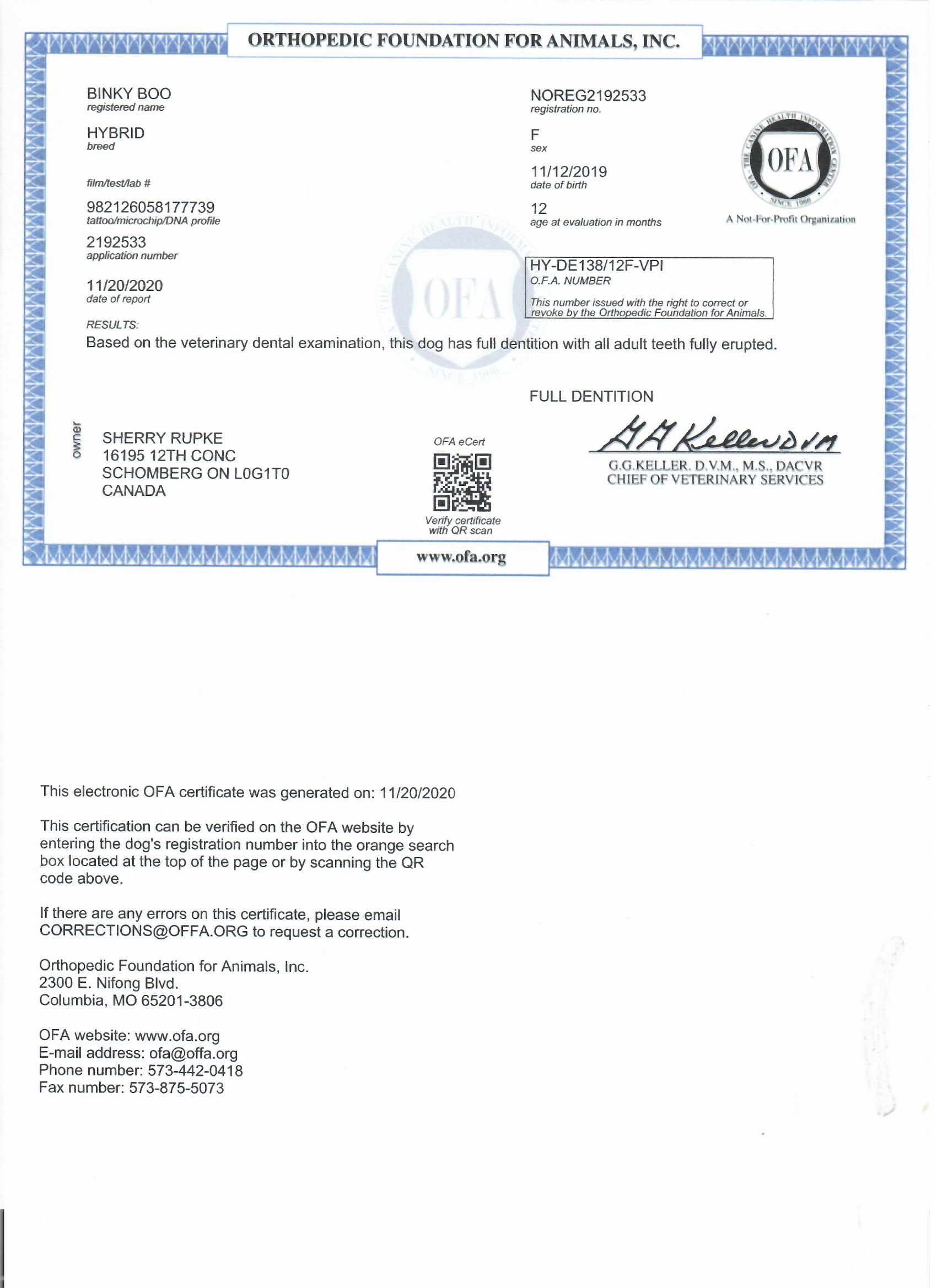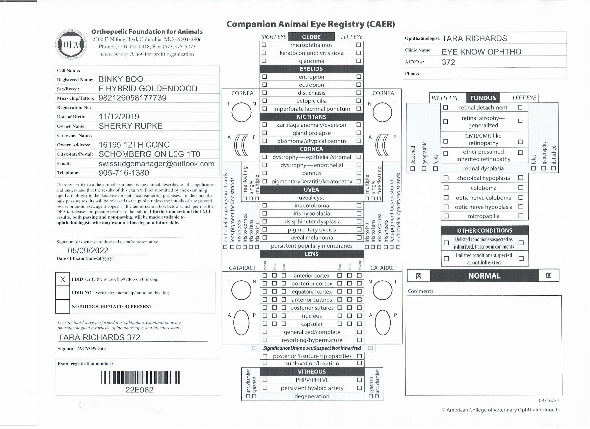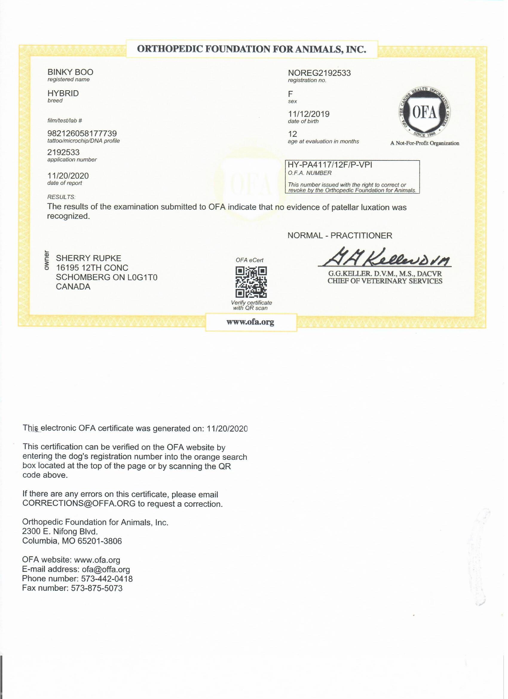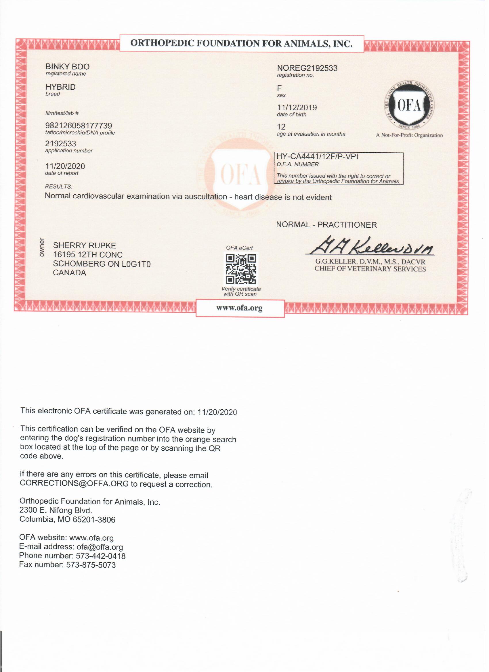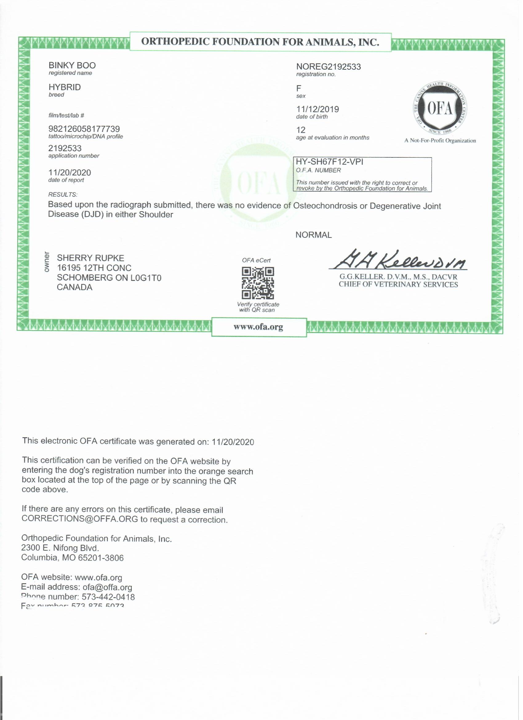Binky Boo has been fully health tested, and her health certificates are attached for your review. At SwissRidge, we complete thorough health testing on all of our dogs, including x-rays, DNA testing, and physical exams performed by a licensed veterinarian to ensure we are breeding only the healthiest dogs who will go on to produce strong, healthy puppies.