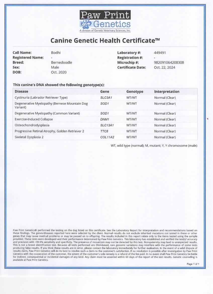 Bodhi has been fully health tested, and his health certificates are attached for your review. He has also been screened through Embark for over 270 genetic health conditions. At SwissRidge, we complete thorough health testing on all of our dogs, including x-rays, DNA testing, and comprehensive physical exams performed by a licensed veterinarian to ensure we are breeding only the healthiest dogs who will go on to produce strong, healthy puppies.