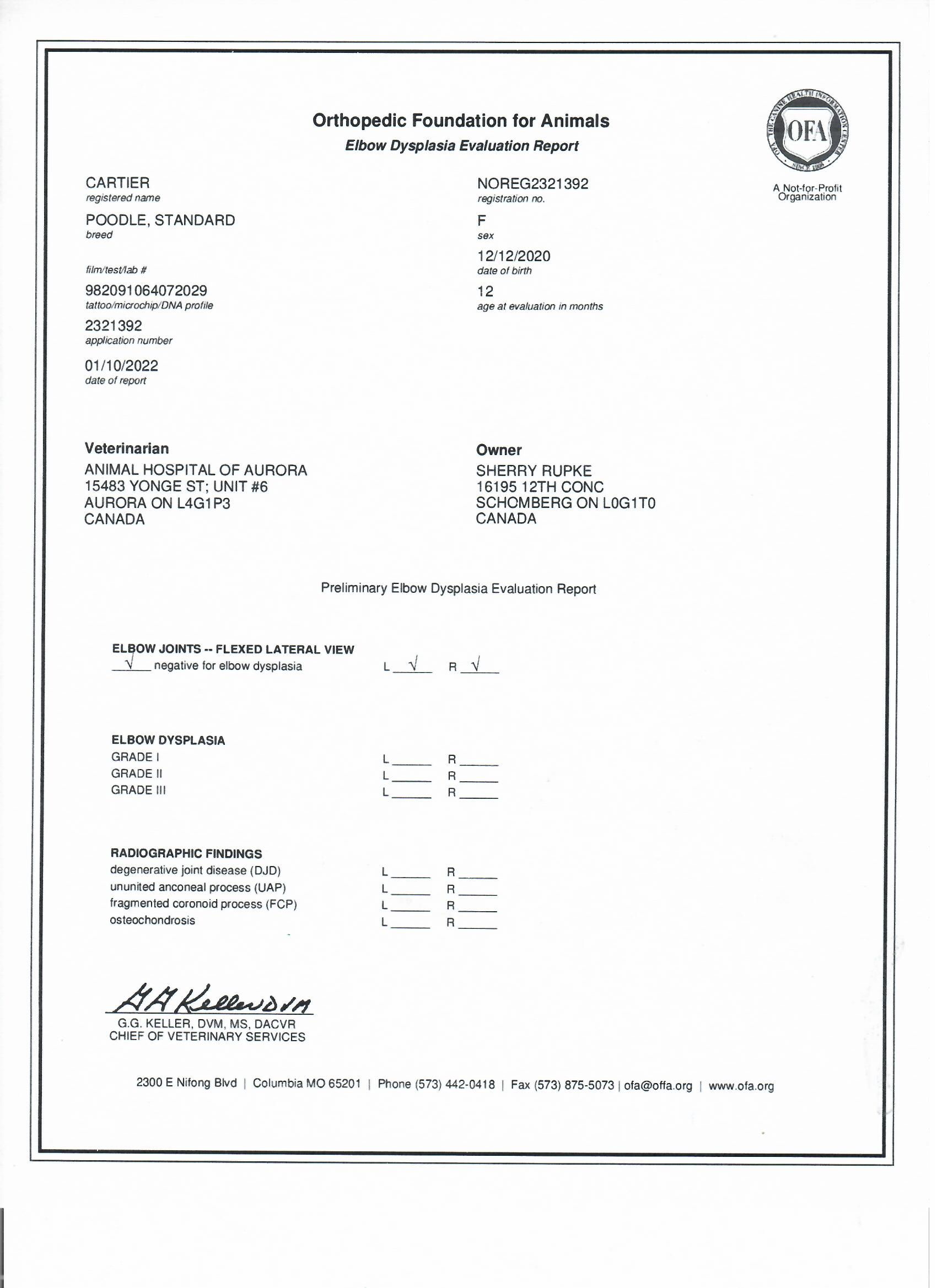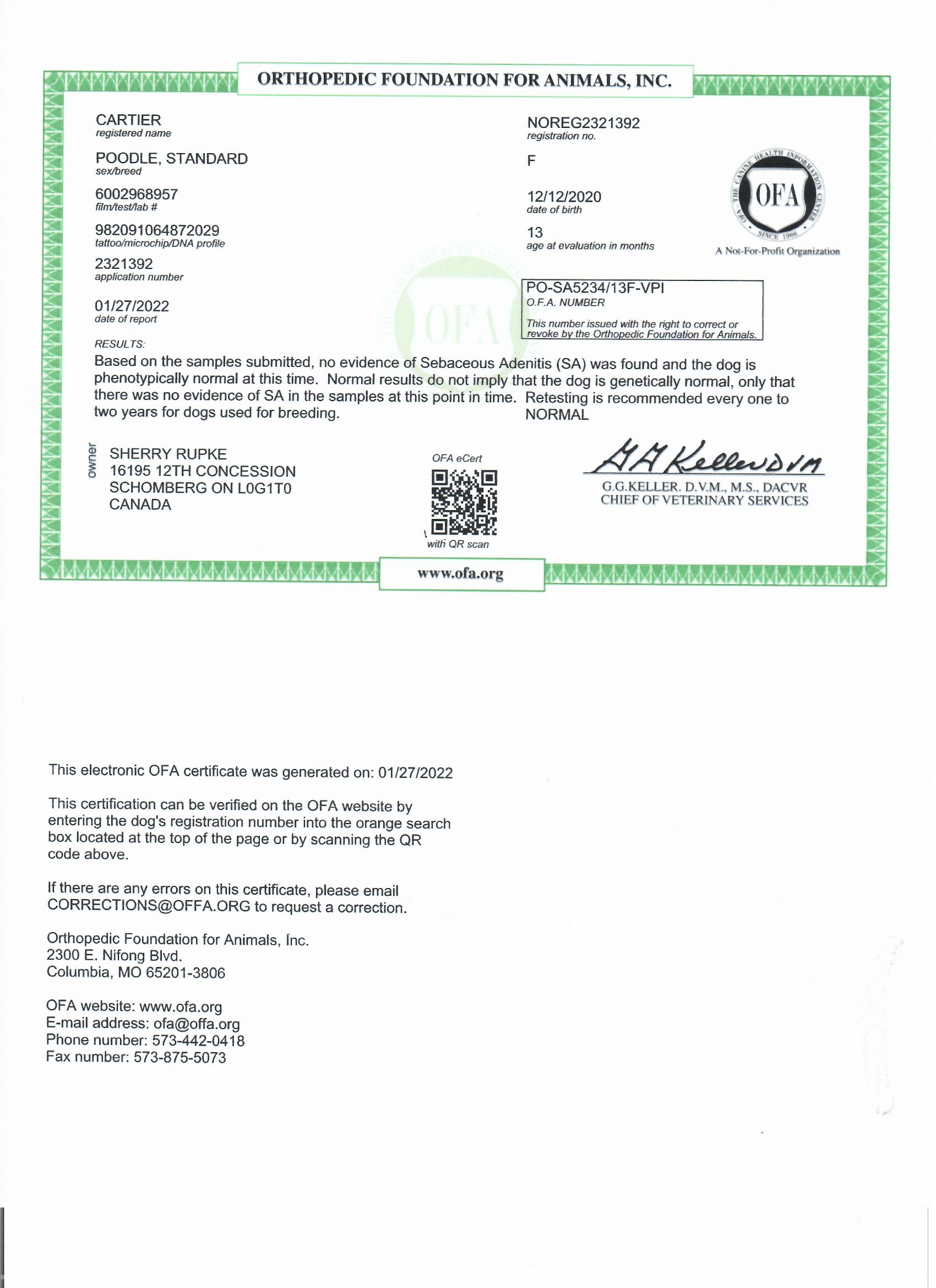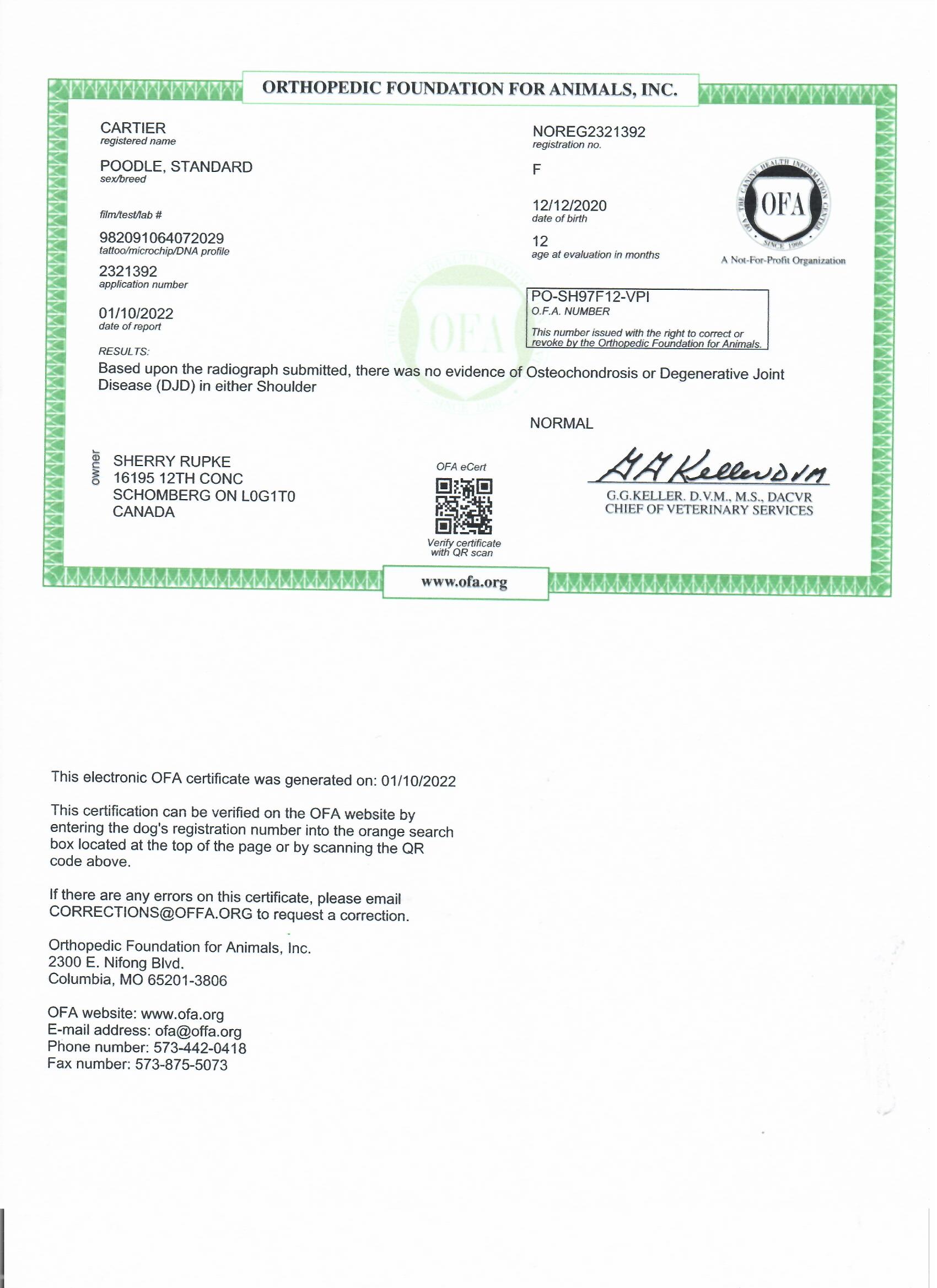 Cartier has been fully health tested, and her health certificates are attached for your review. At SwissRidge, we complete thorough health testing on all of our dogs, including x-rays, DNA testing, and comprehensive physical exams performed by a licensed veterinarian to ensure we are breeding only the healthiest dogs who will go on to produce strong, healthy puppies.