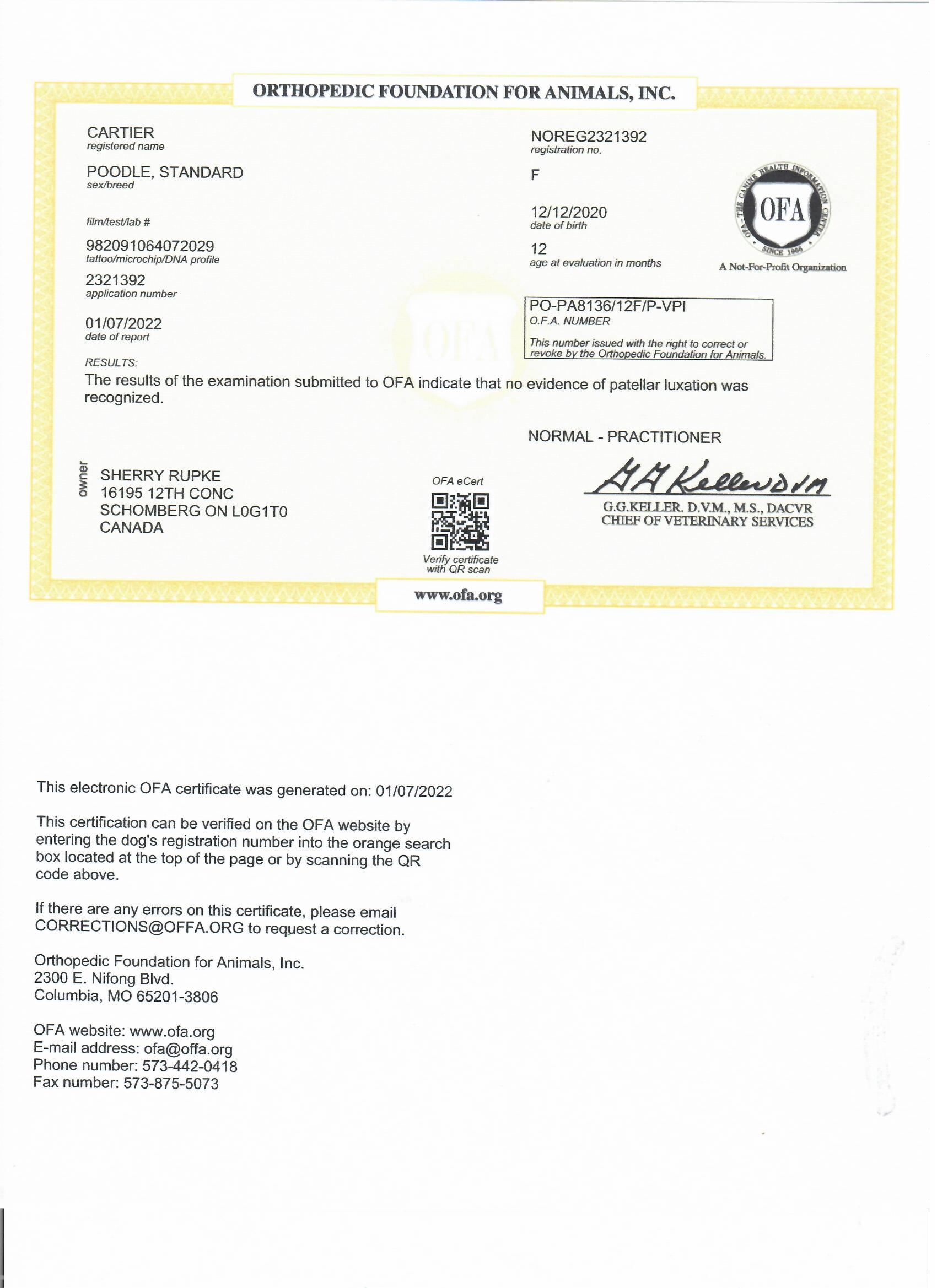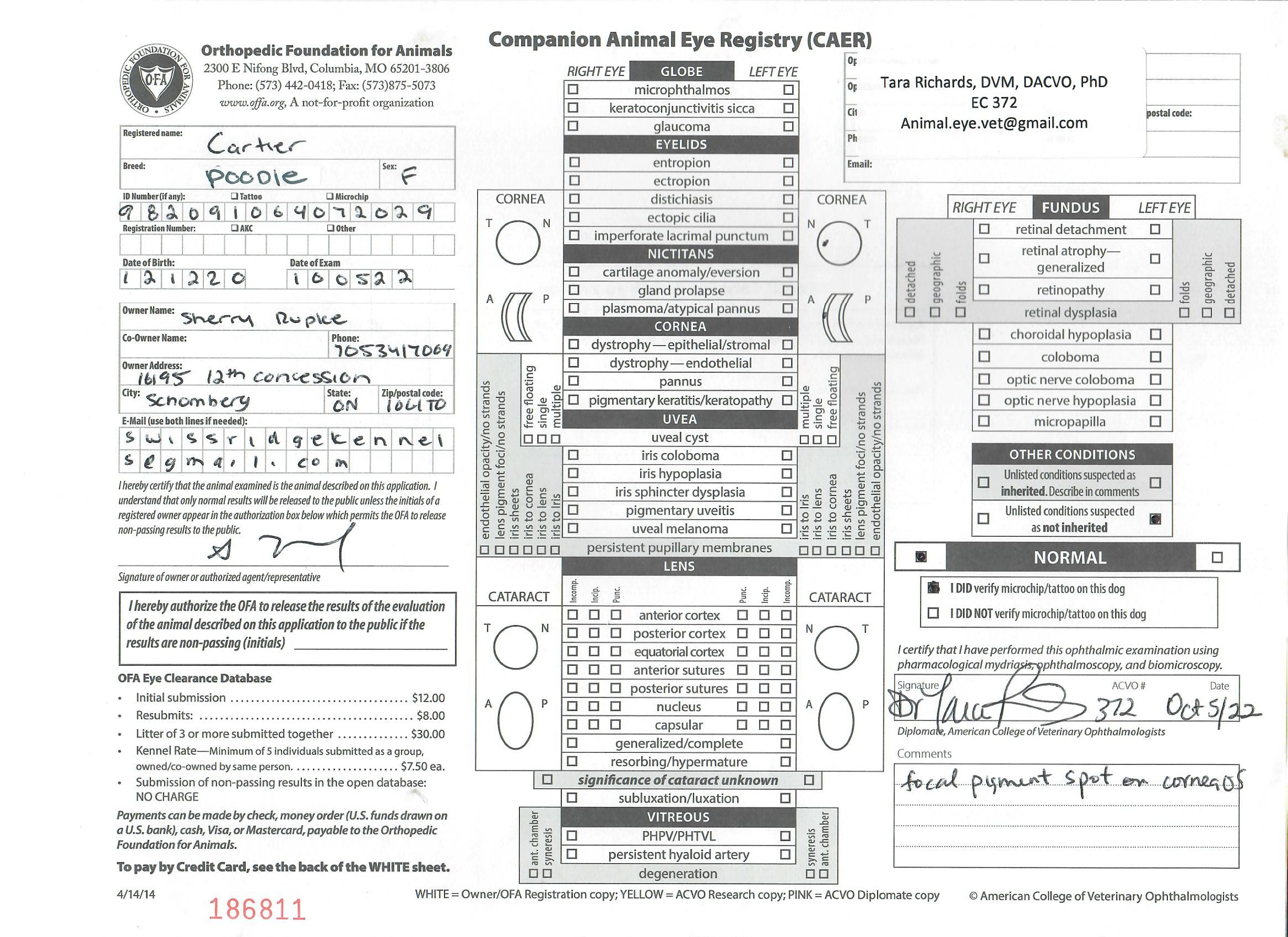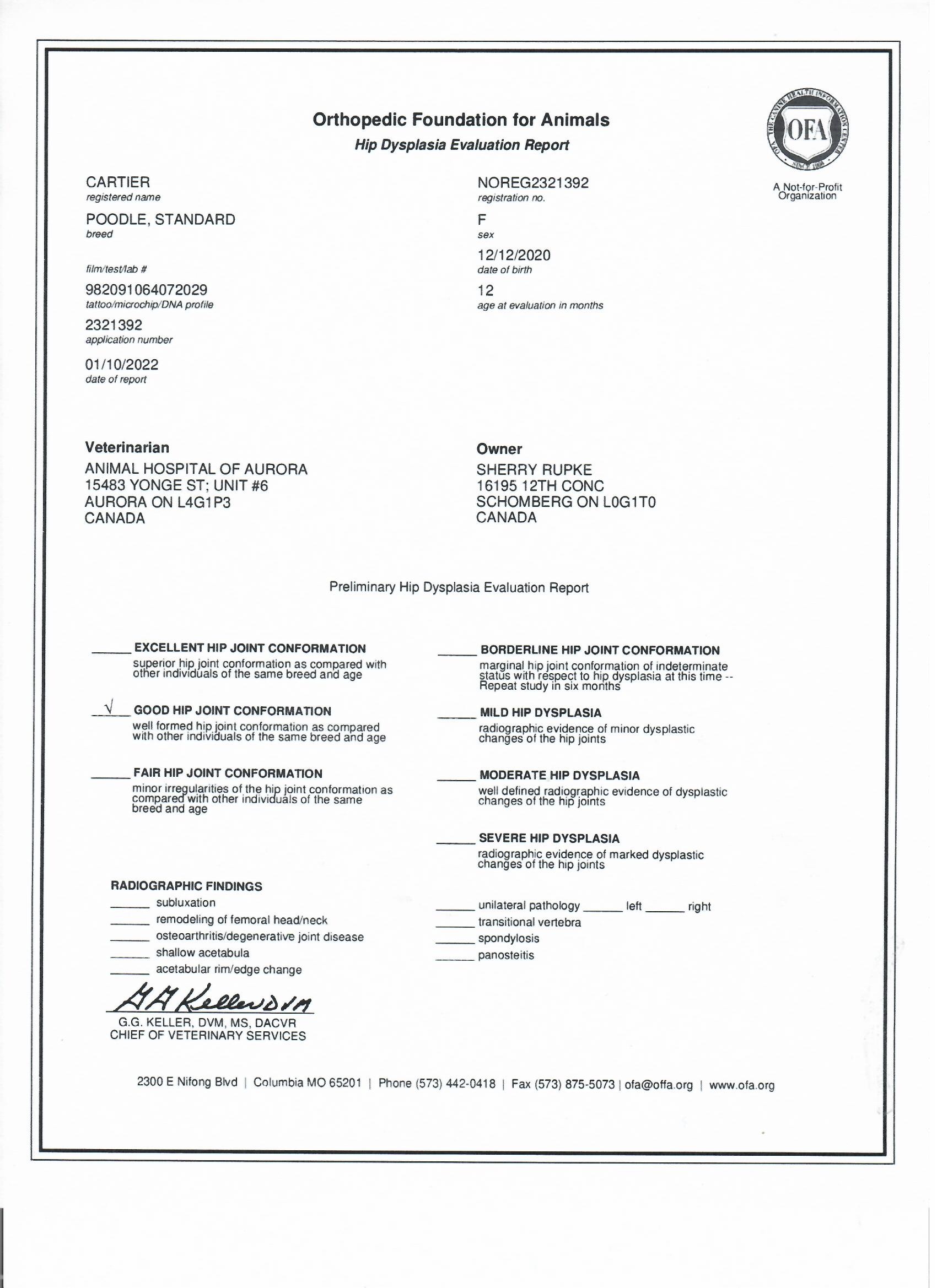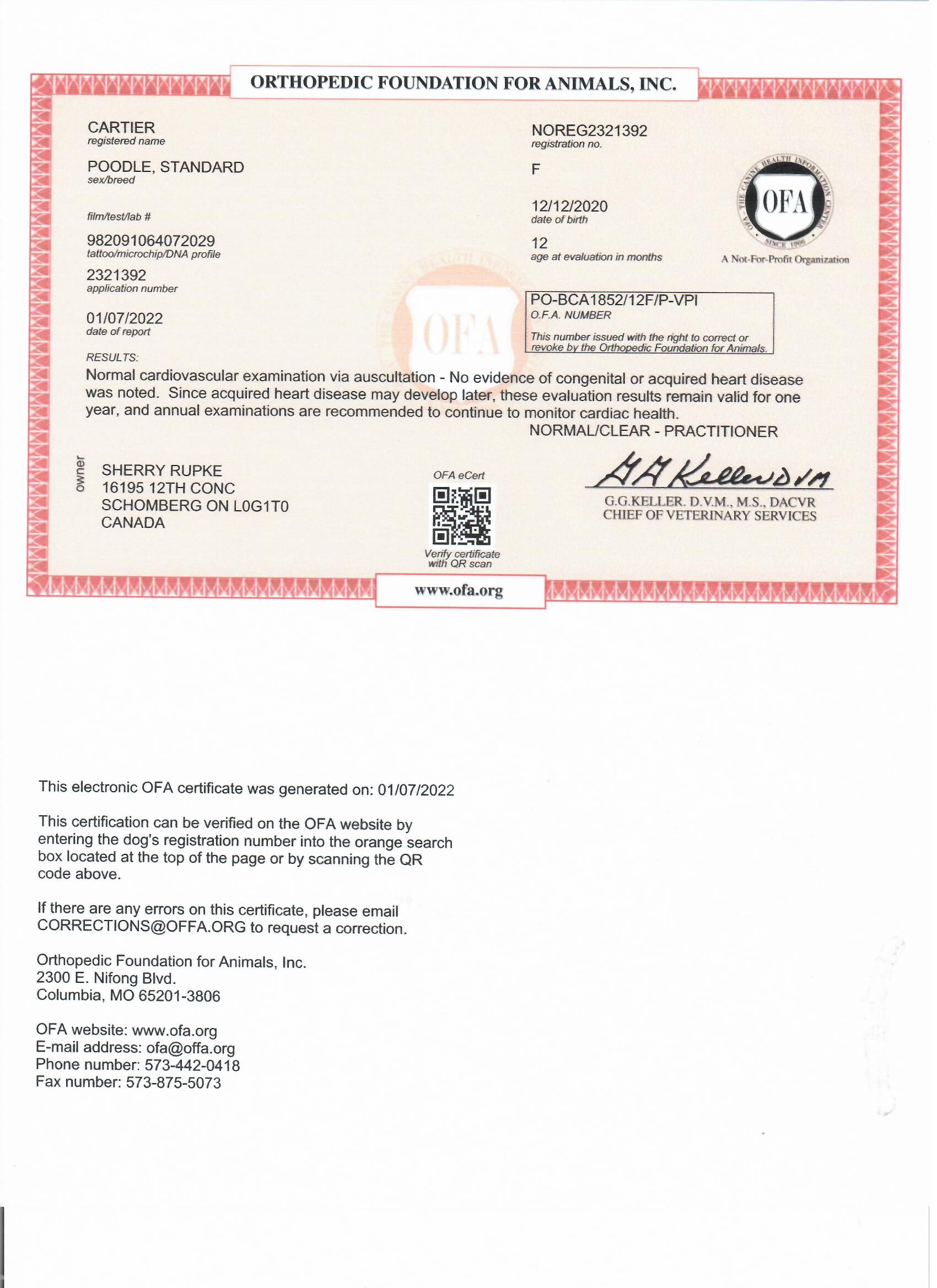 Cartier has been fully health tested, and her health certificates are attached for your review. At SwissRidge, we complete thorough health testing on all of our dogs, including x-rays, DNA testing, and comprehensive physical exams performed by a licensed veterinarian to ensure we are breeding only the healthiest dogs who will go on to produce strong, healthy puppies.
