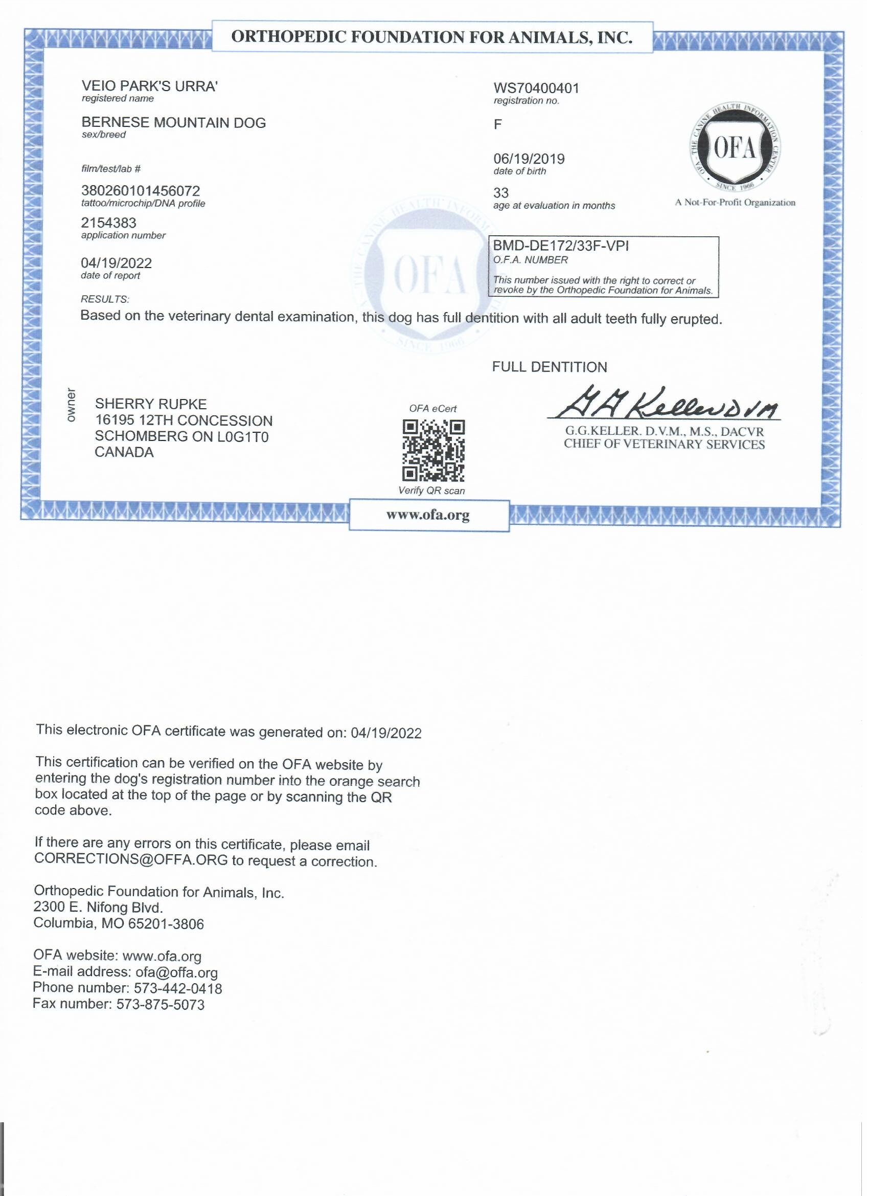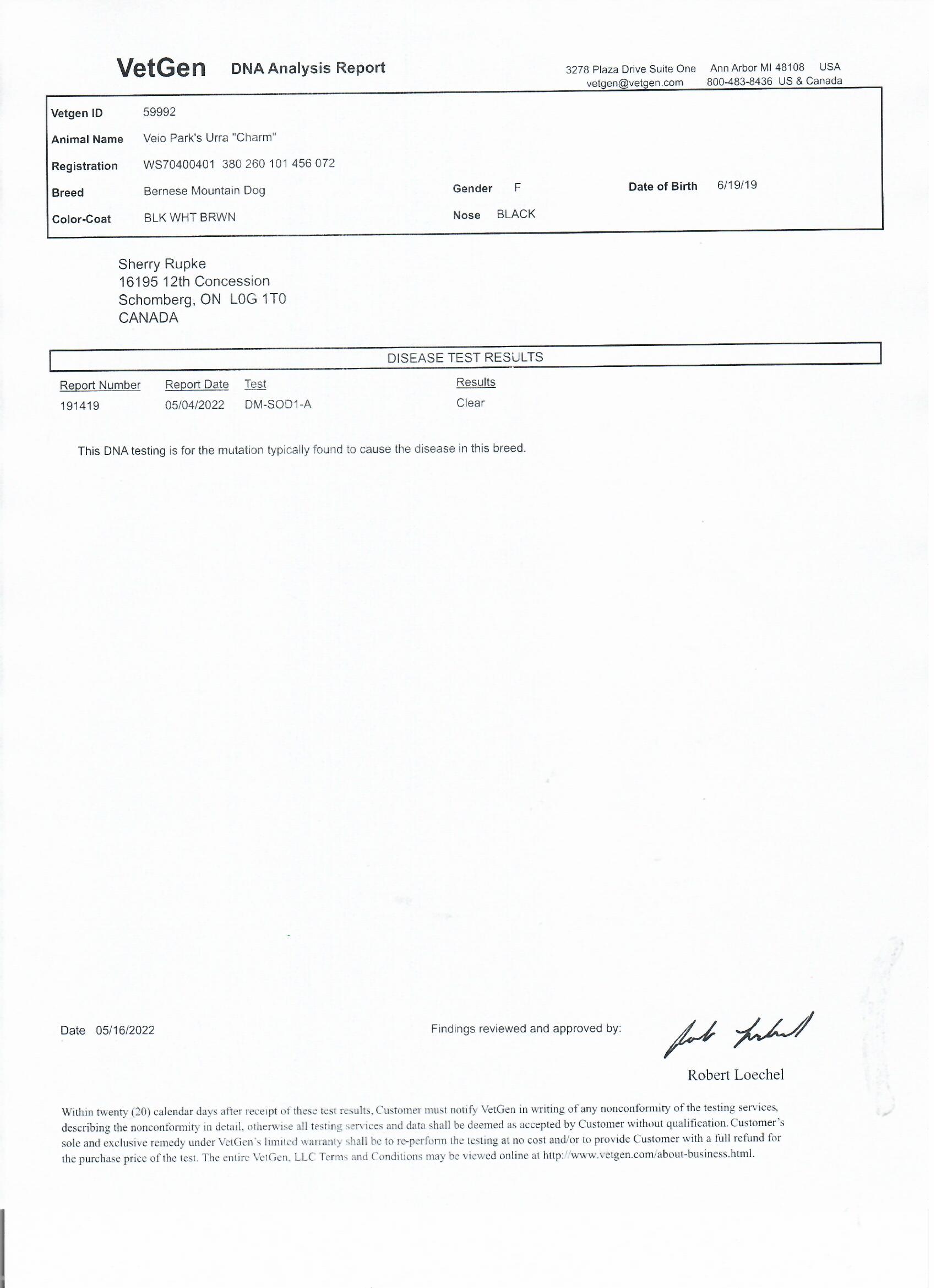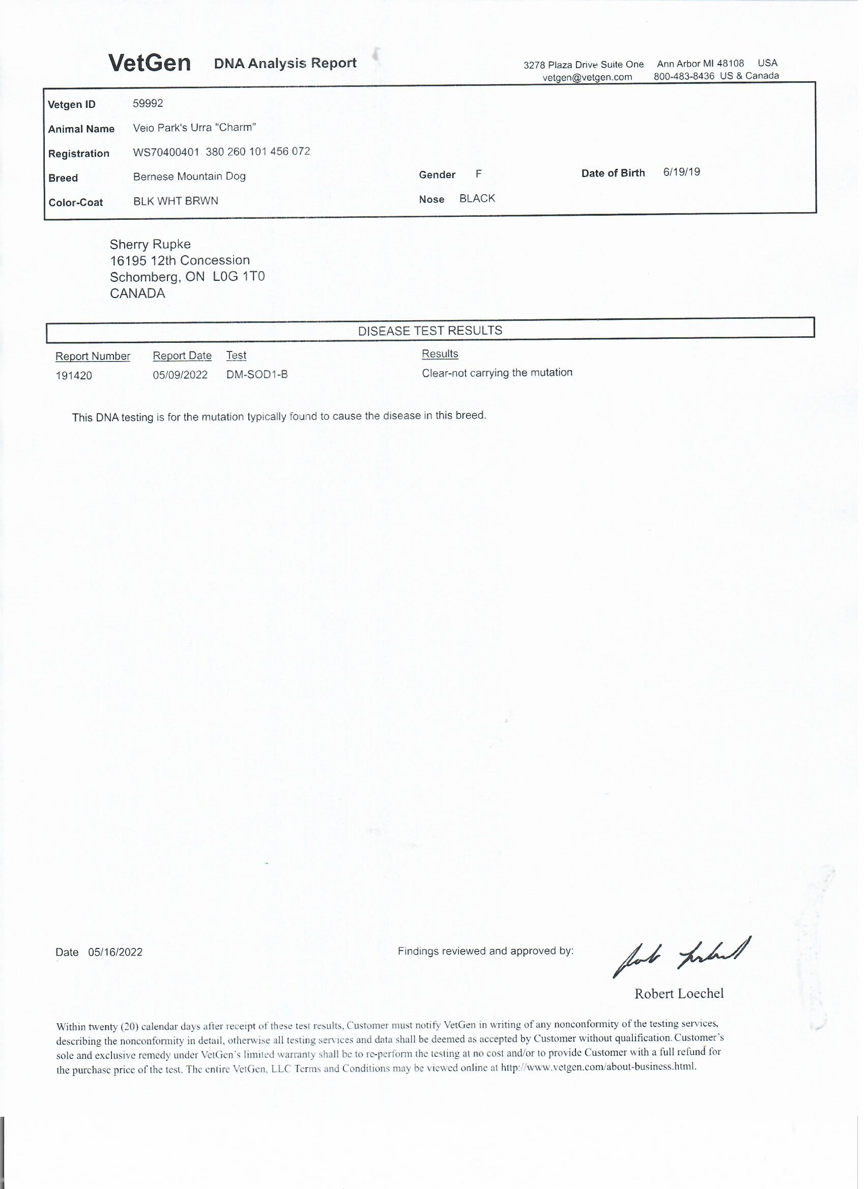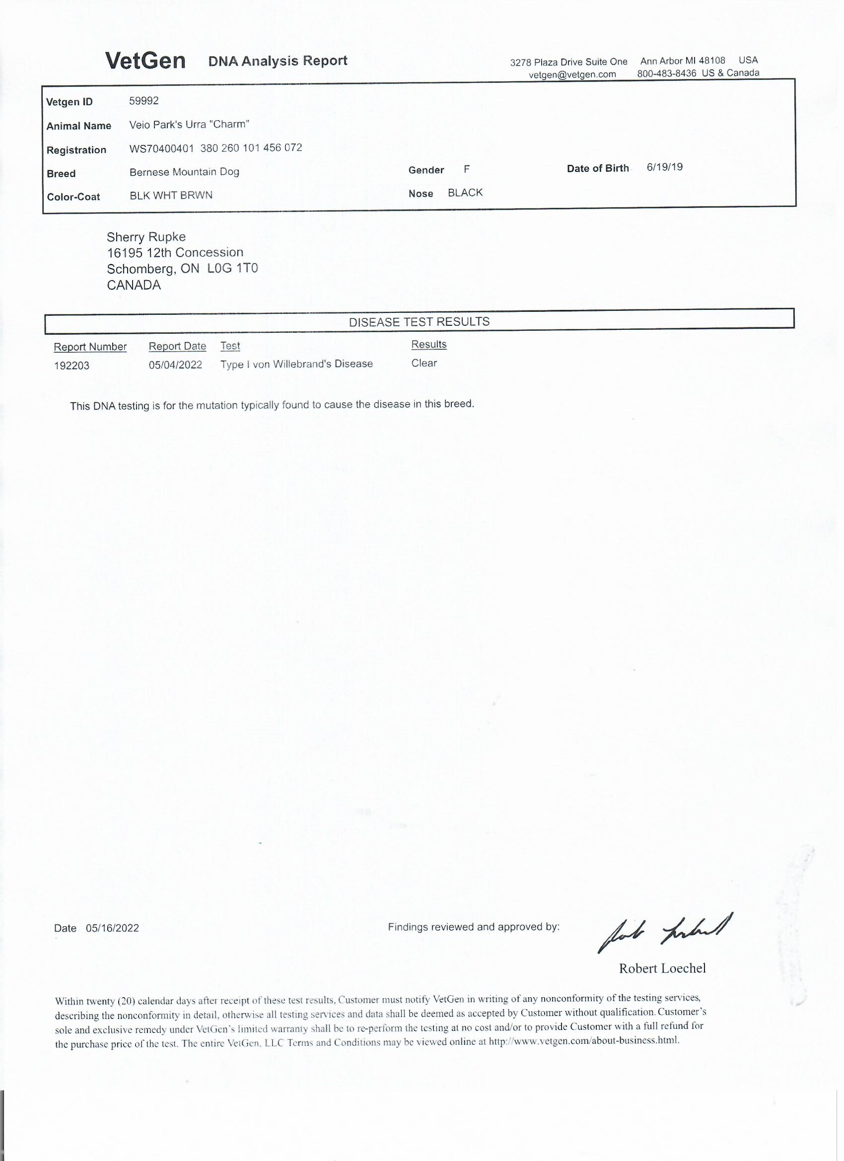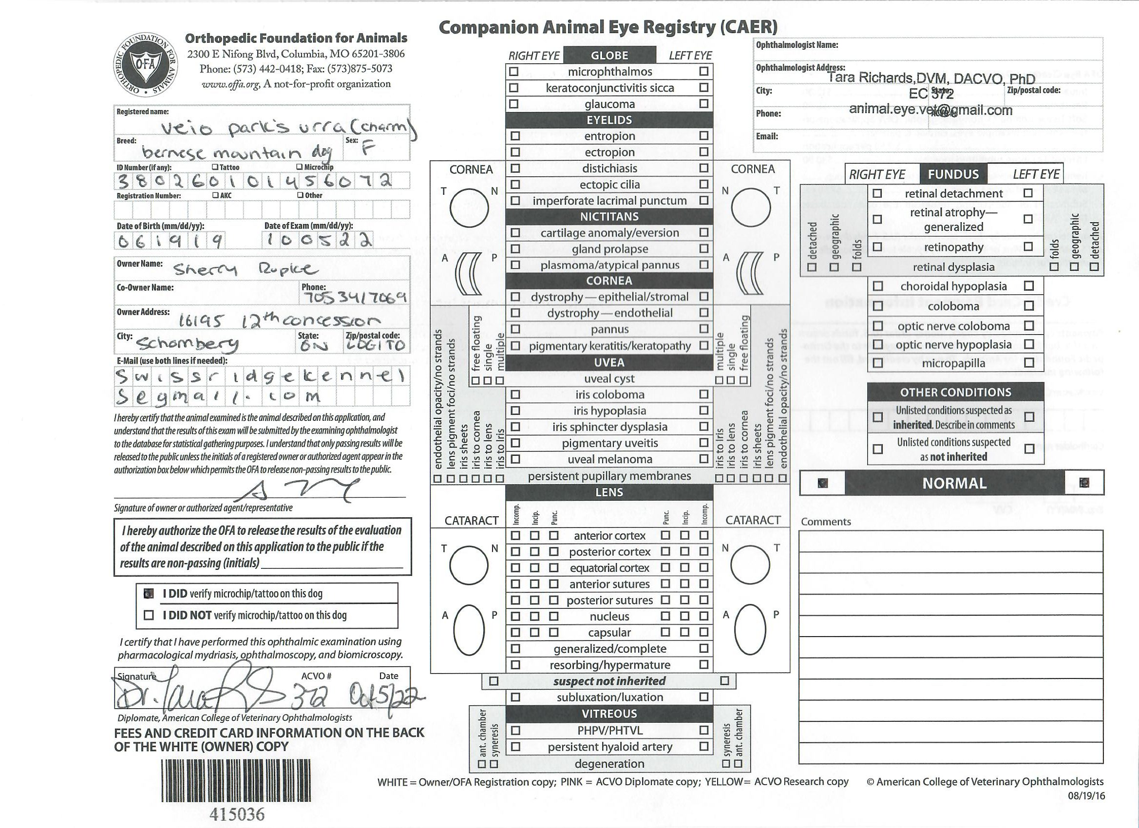 Charm has been fully health tested, and her health certificates are attached for your review. At SwissRidge, we complete thorough health testing on all of our dogs, including x-rays, DNA testing, and comprehensive physical exams performed by a licensed veterinarian to ensure we are breeding only the healthiest dogs who will go on to produce strong, healthy puppies.