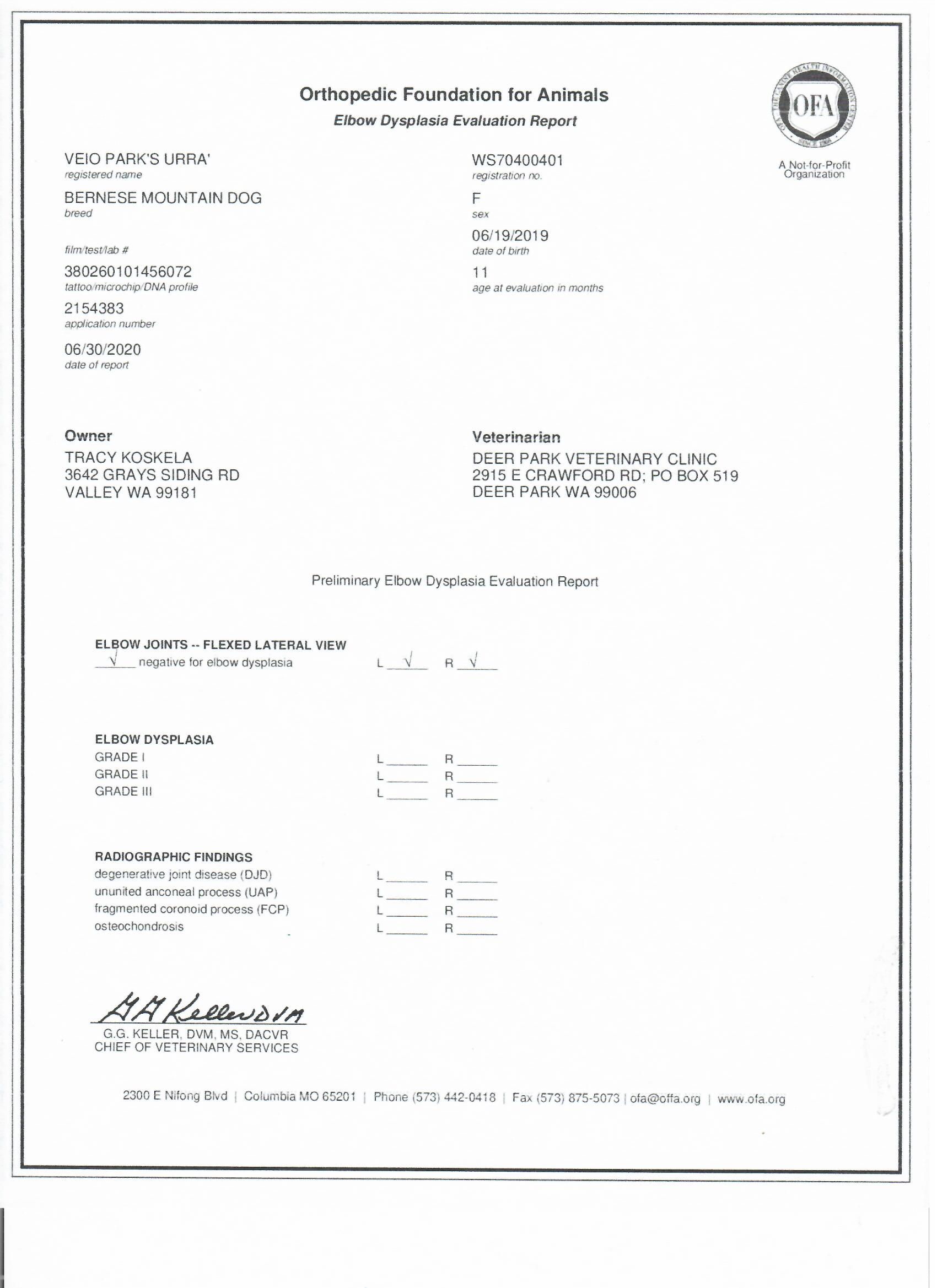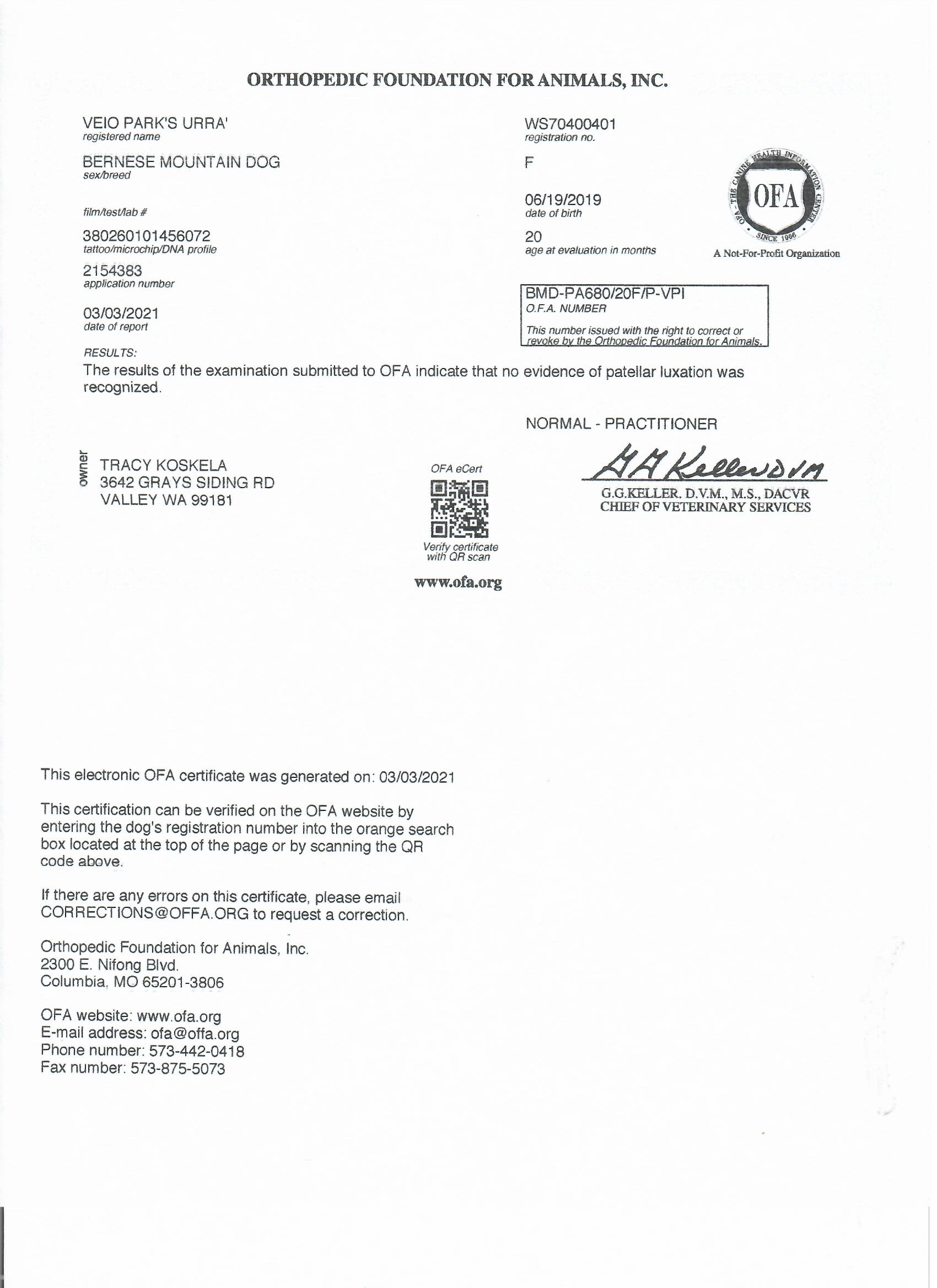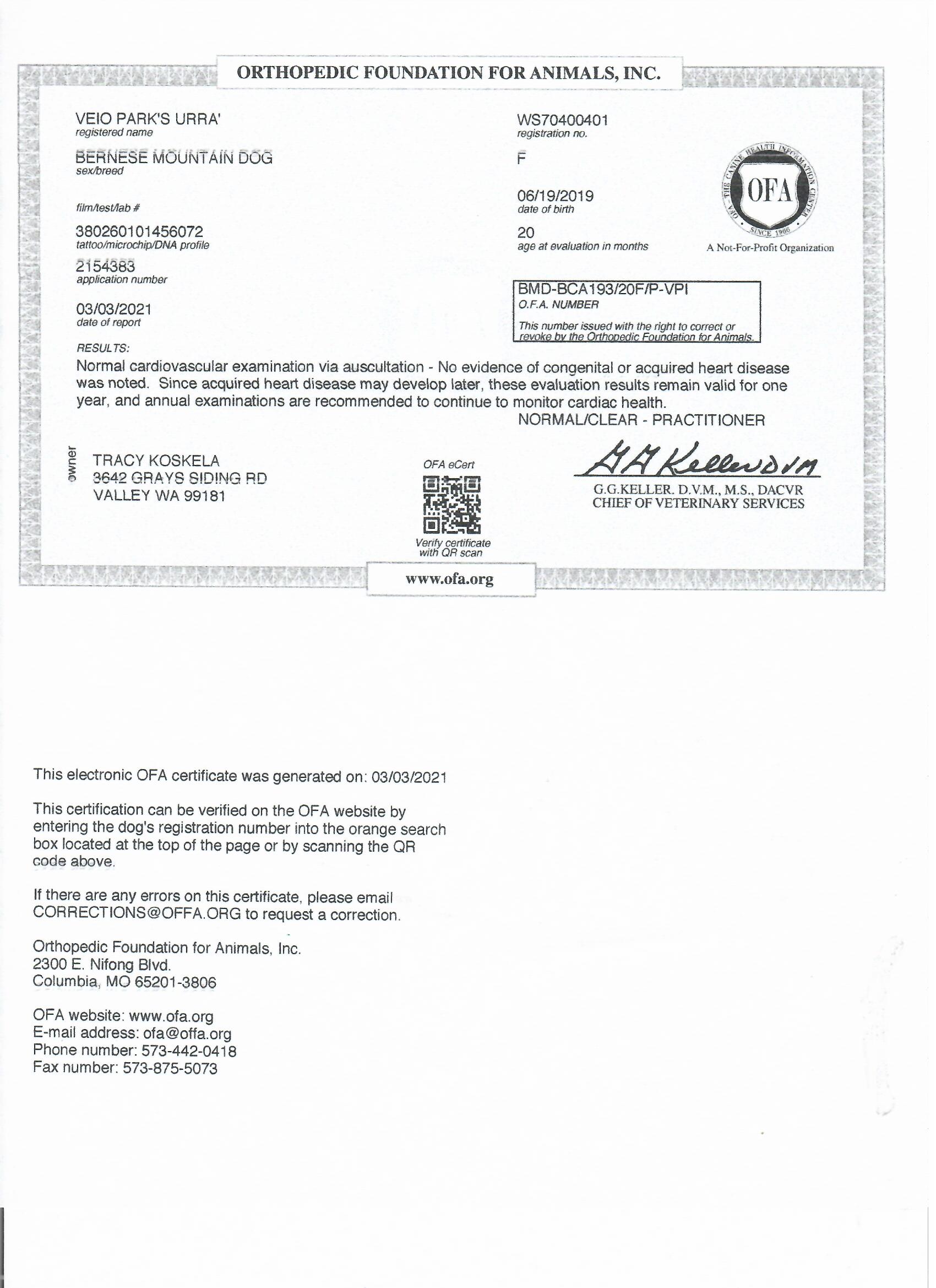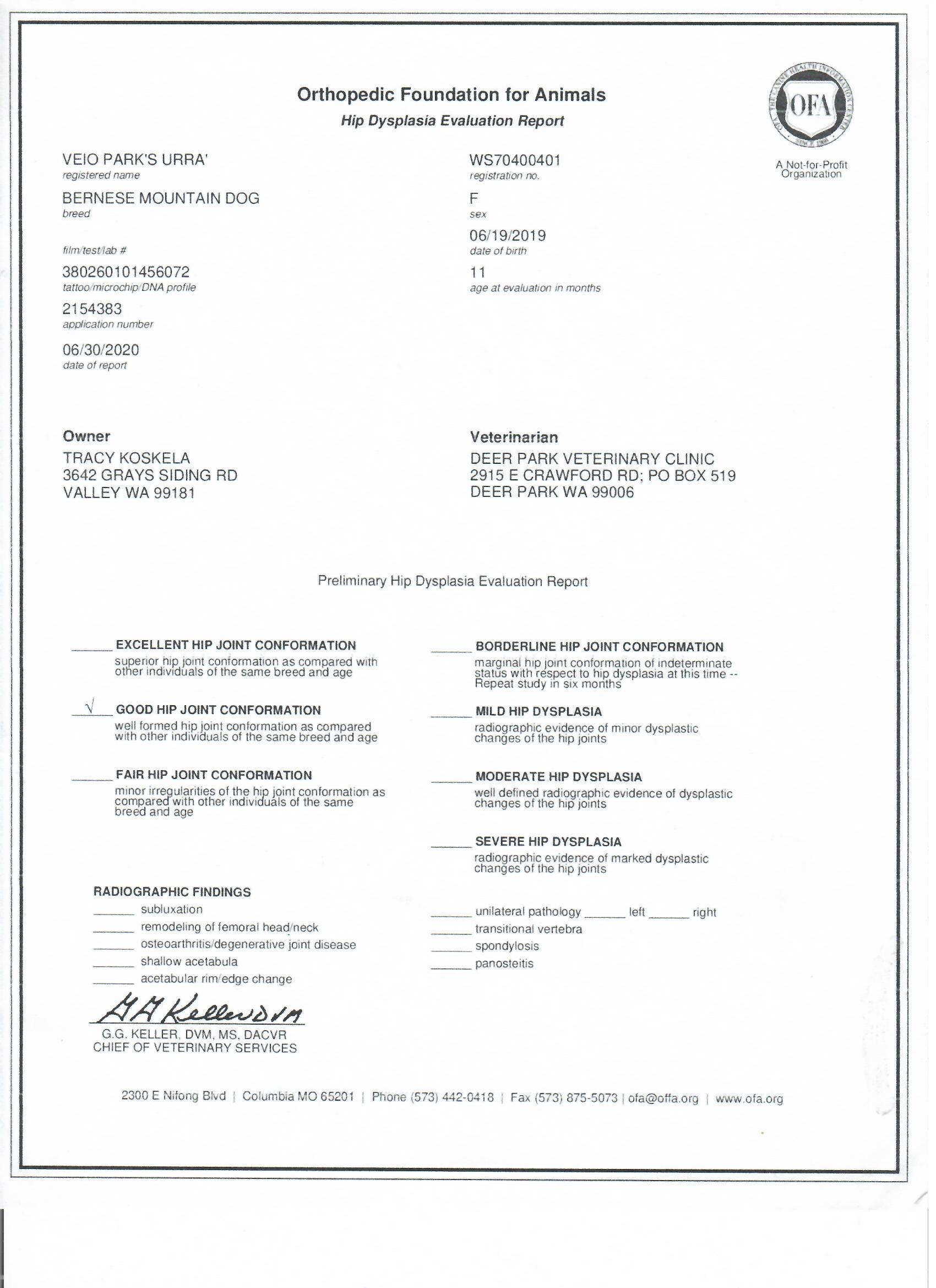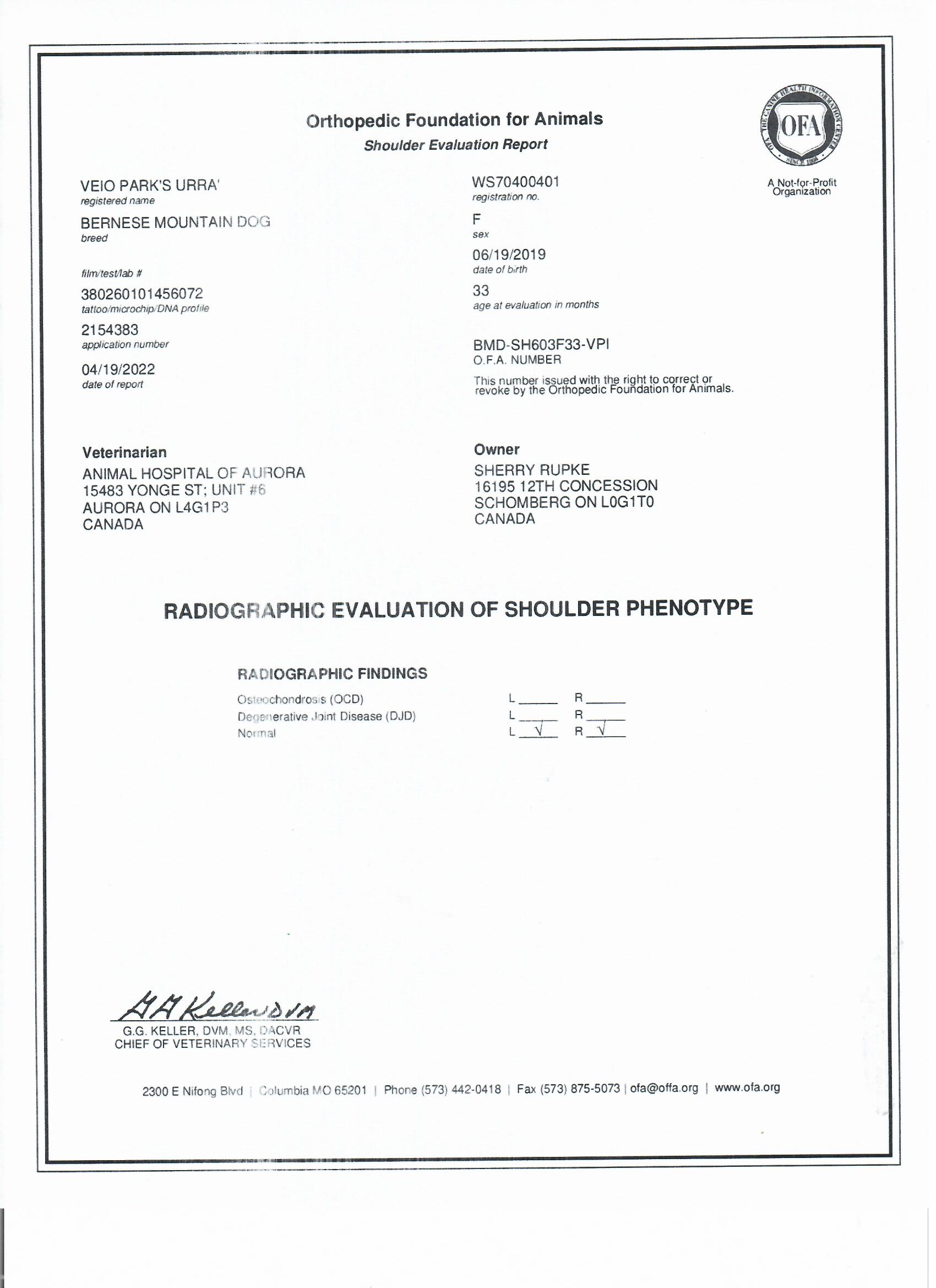 Charm has been fully health tested, and her health certificates are attached for your review. At SwissRidge, we complete thorough health testing on all of our dogs, including x-rays, DNA testing, and comprehensive physical exams performed by a licensed veterinarian to ensure we are breeding only the healthiest dogs who will go on to produce strong, healthy puppies.