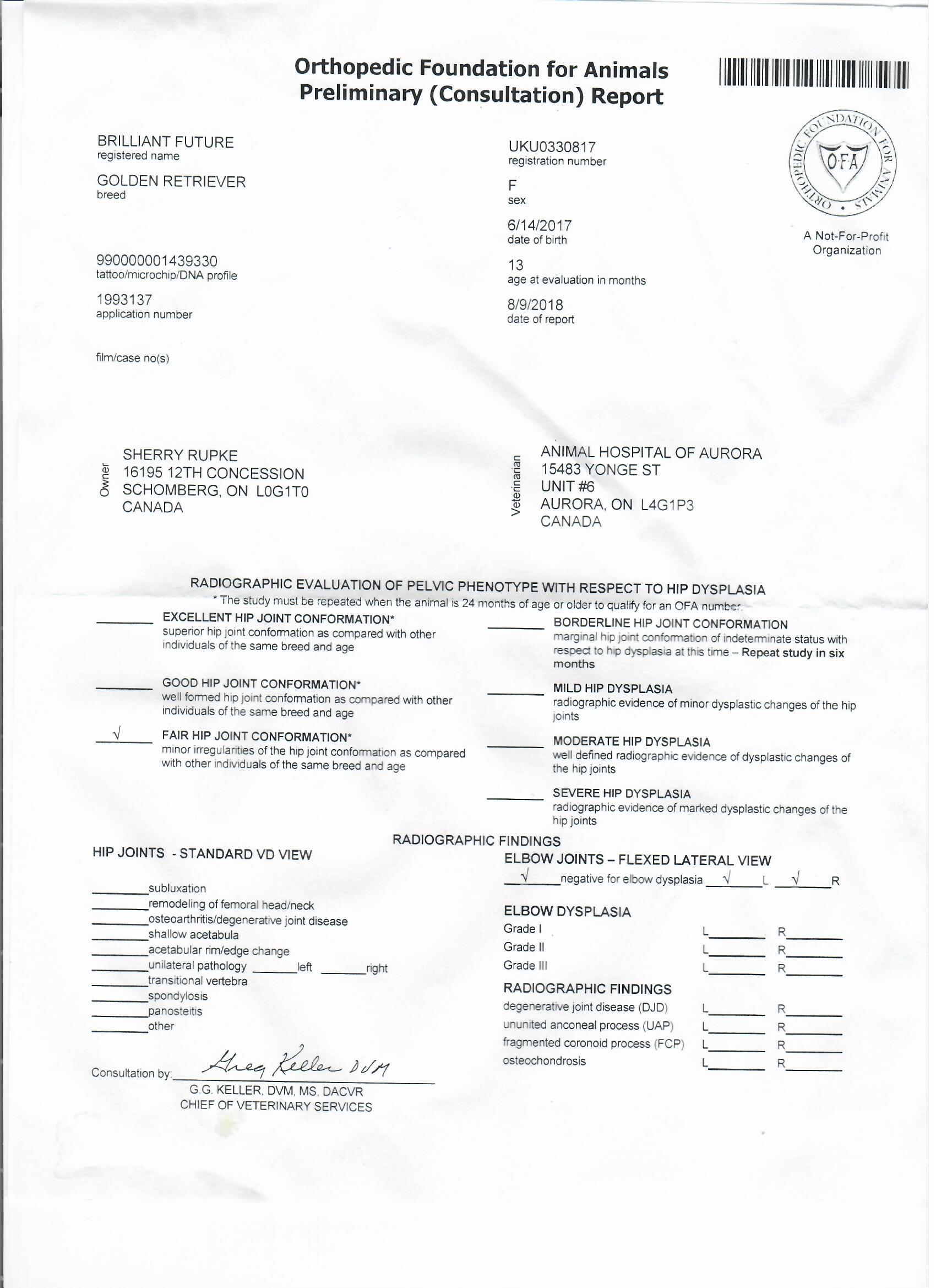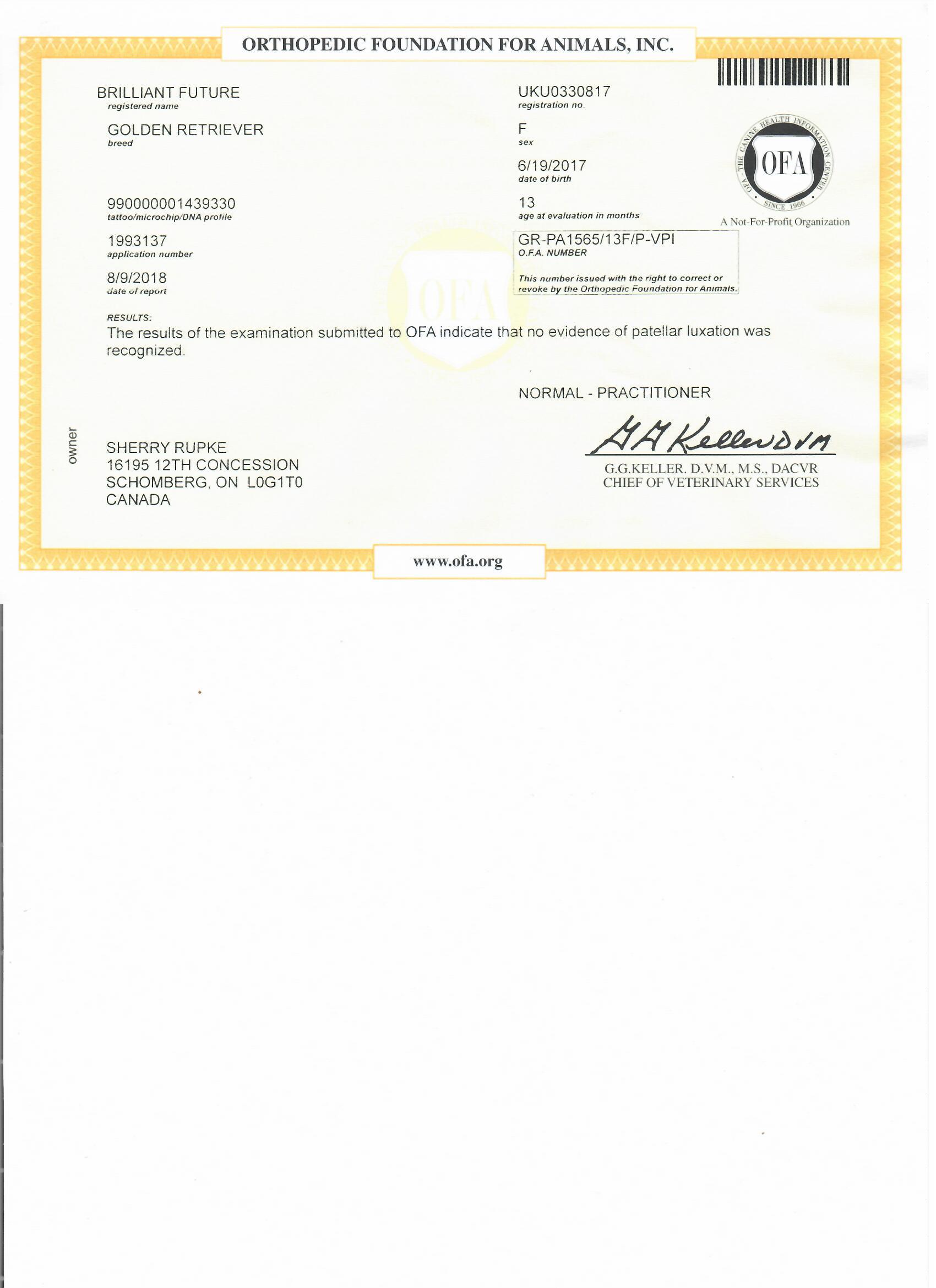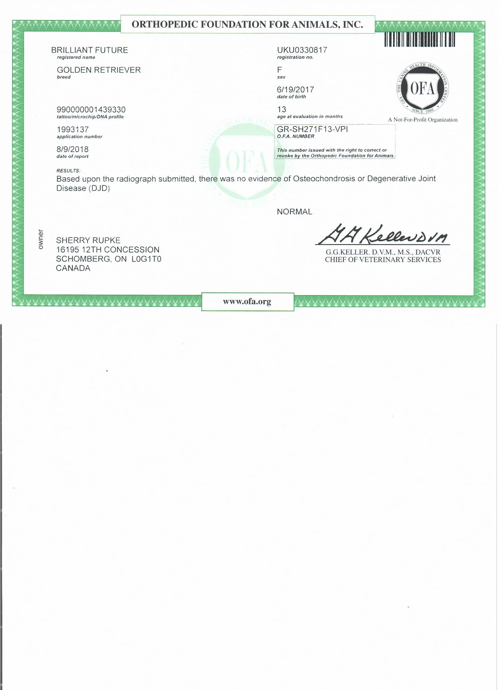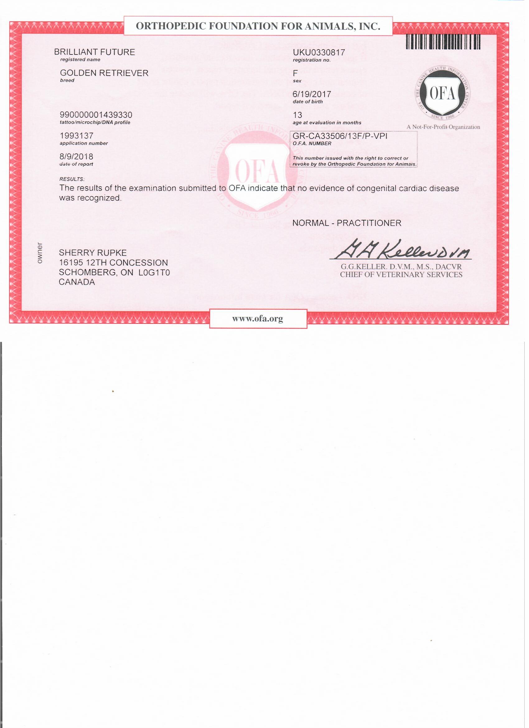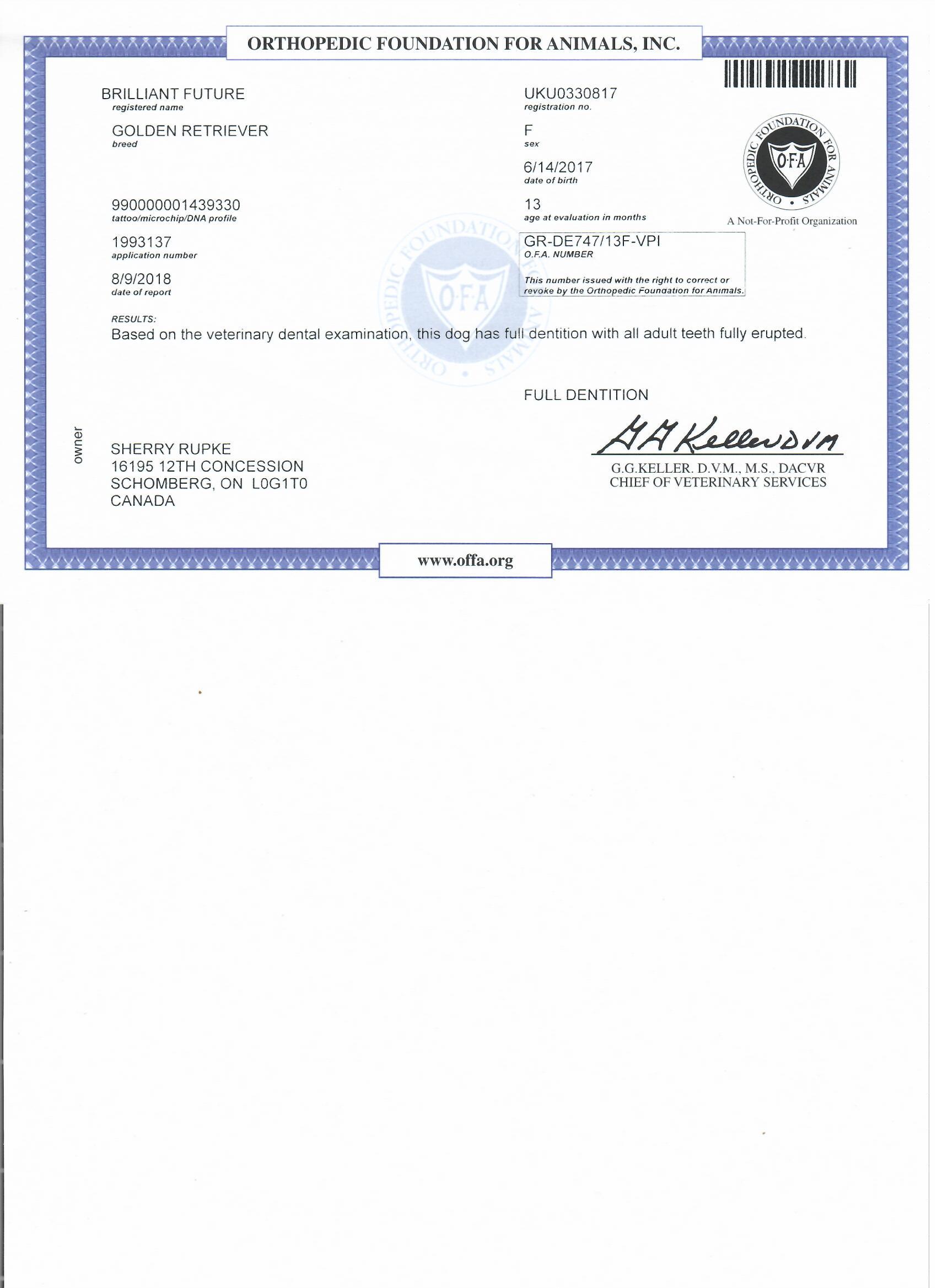 Daenerys has been fully health tested, and her health certificates are attached for your review. At SwissRidge, we complete thorough health testing on all of our dogs, including x-rays, DNA testing, and comprehensive physical exams performed by a licensed veterinarian to ensure we are breeding only the healthiest dogs who will go on to produce strong, healthy puppies.