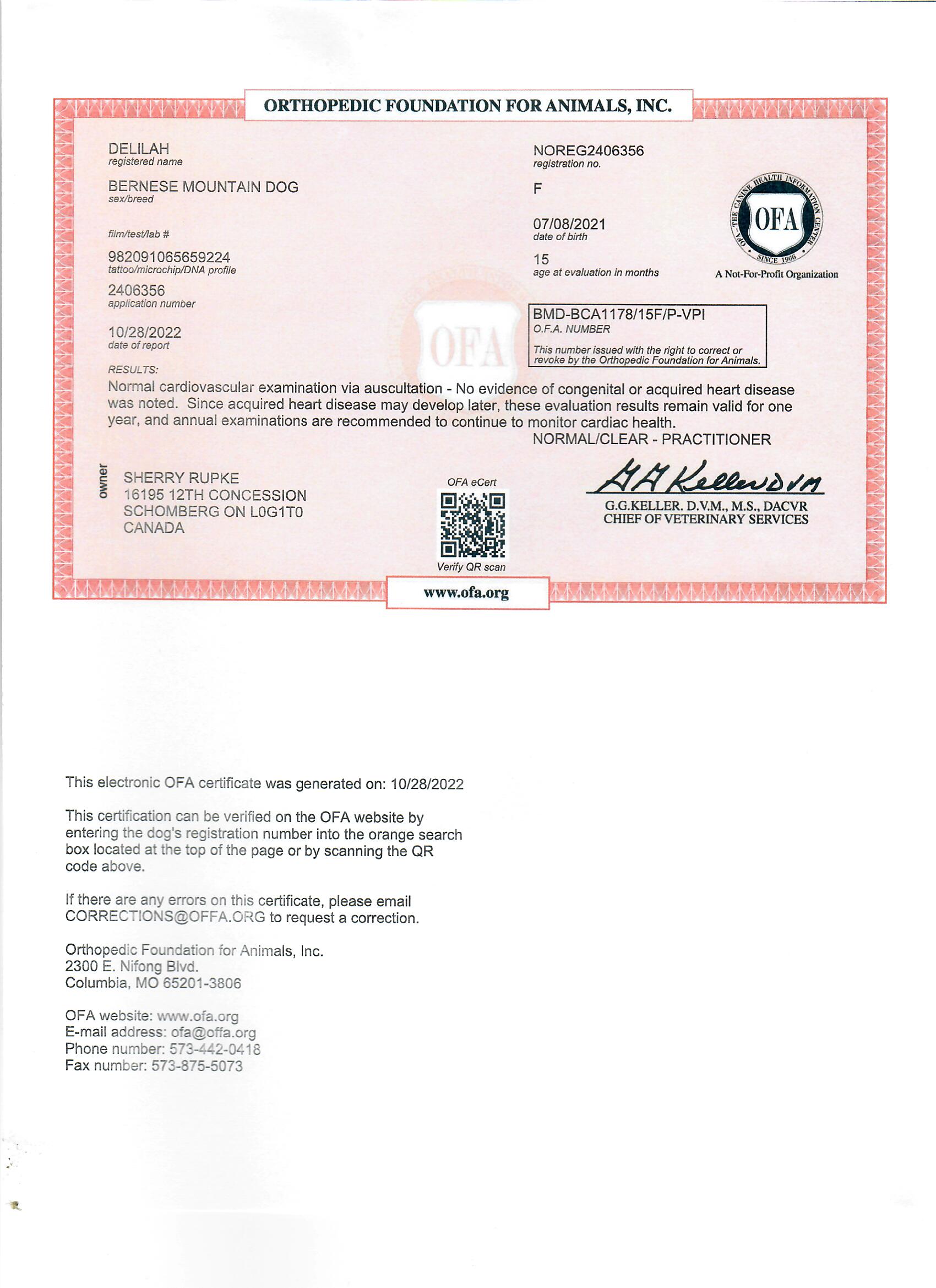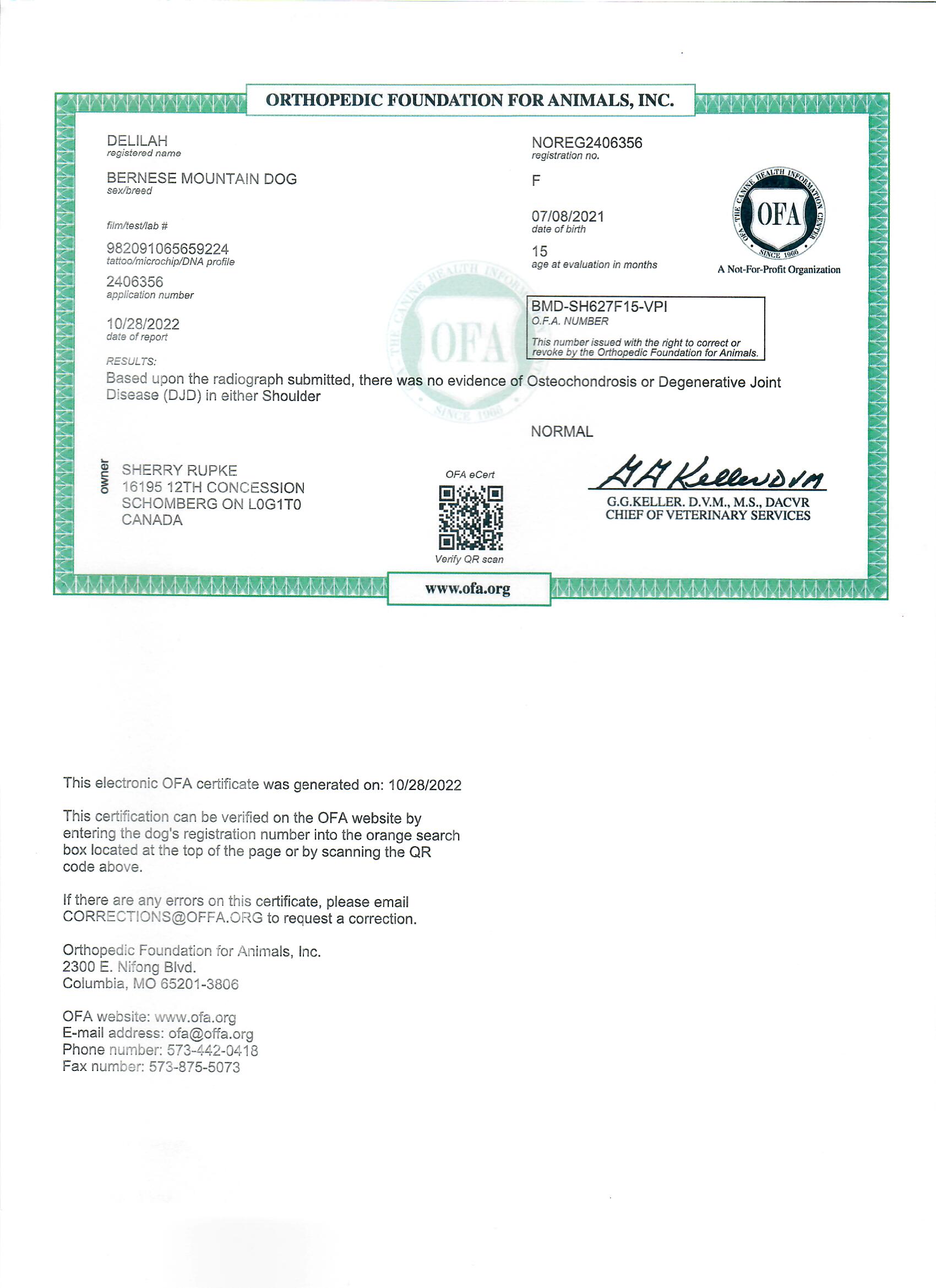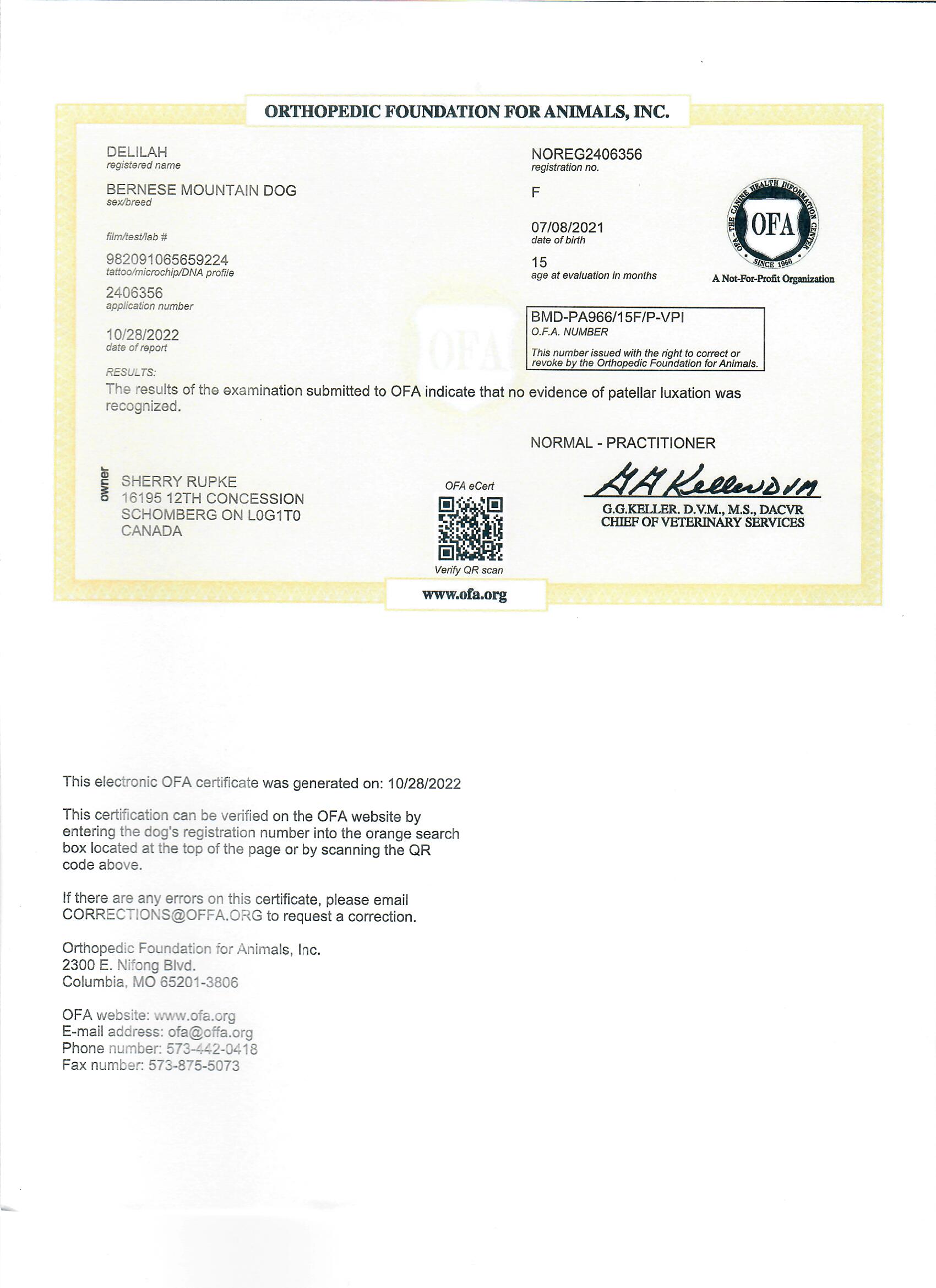 Dalilah has been fully health tested, and her health certificates are attached for your review. At SwissRidge, we complete thorough health testing on all of our dogs, including x-rays, DNA testing, and comprehensive physical exams performed by a licensed veterinarian to ensure we are breeding only the healthiest dogs who will go on to produce strong, healthy puppies.