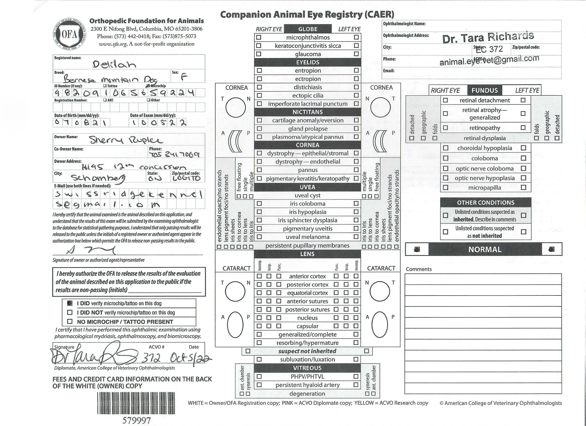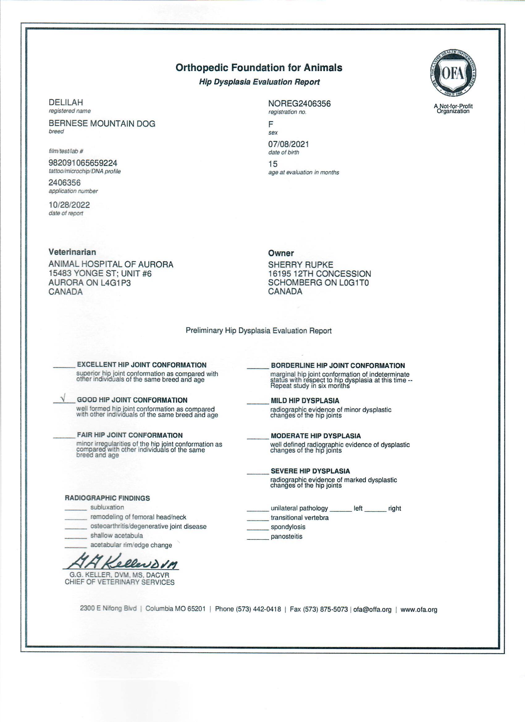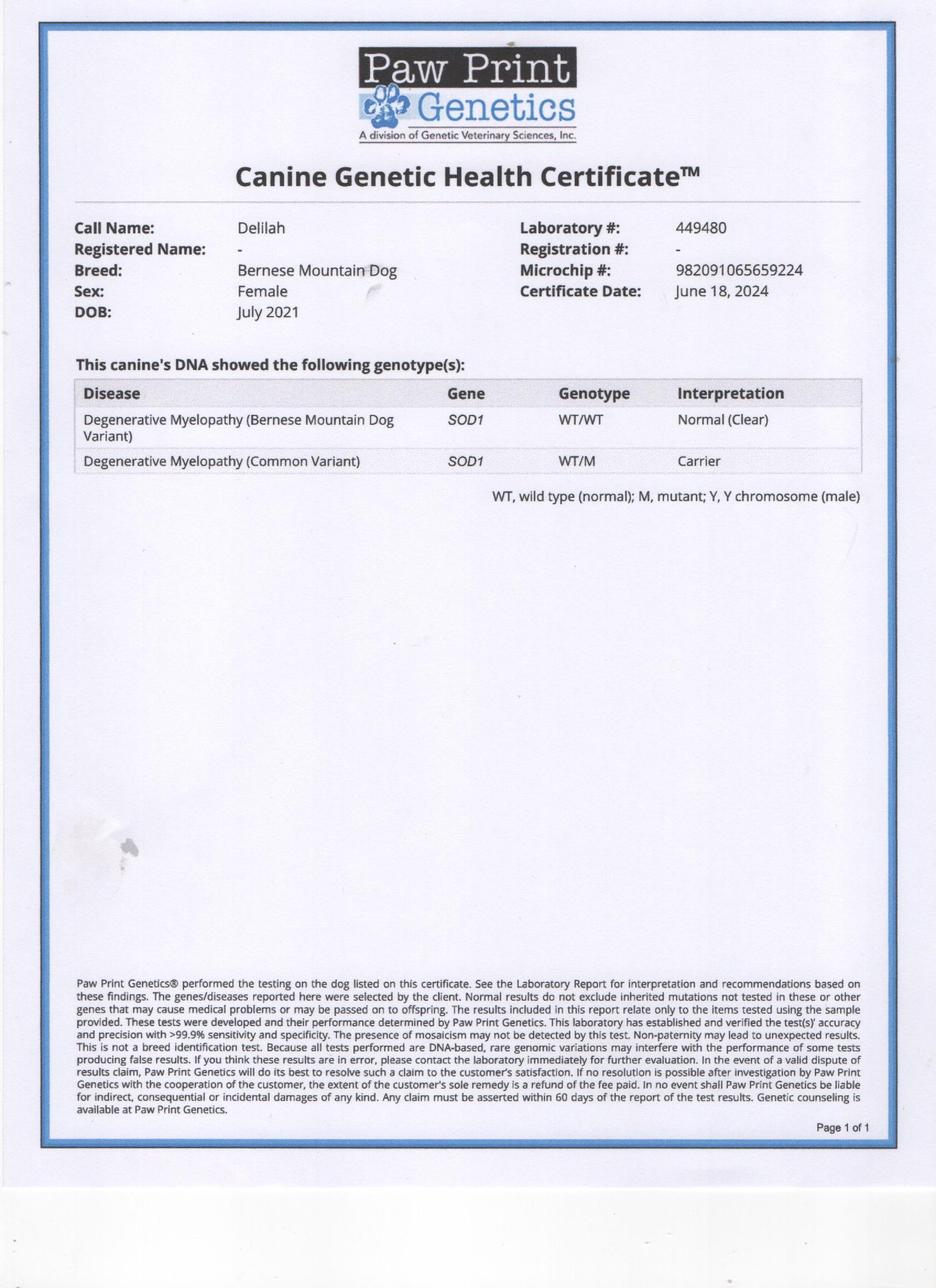 Dalilah has been fully health tested, and her health certificates are attached for your review. At SwissRidge, we complete thorough health testing on all of our dogs, including x-rays, DNA testing, and comprehensive physical exams performed by a licensed veterinarian to ensure we are breeding only the healthiest dogs who will go on to produce strong, healthy puppies.