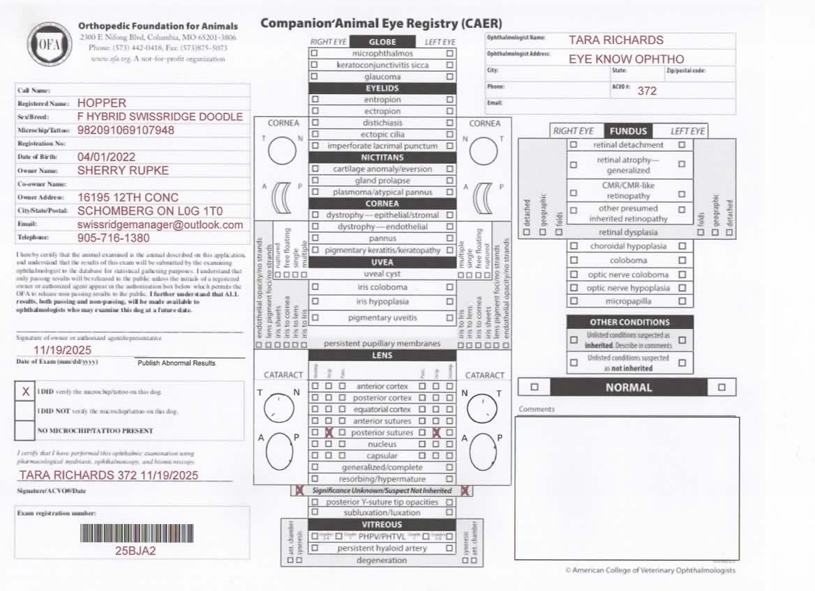 Hopper has been fully health tested, and her health certificates are attached for your review. At SwissRidge, we complete thorough health testing on all of our dogs, including x-rays, DNA testing, and comprehensive physical exams performed by a licensed veterinarian to ensure we are breeding only the healthiest dogs who will go on to produce strong, healthy puppies.