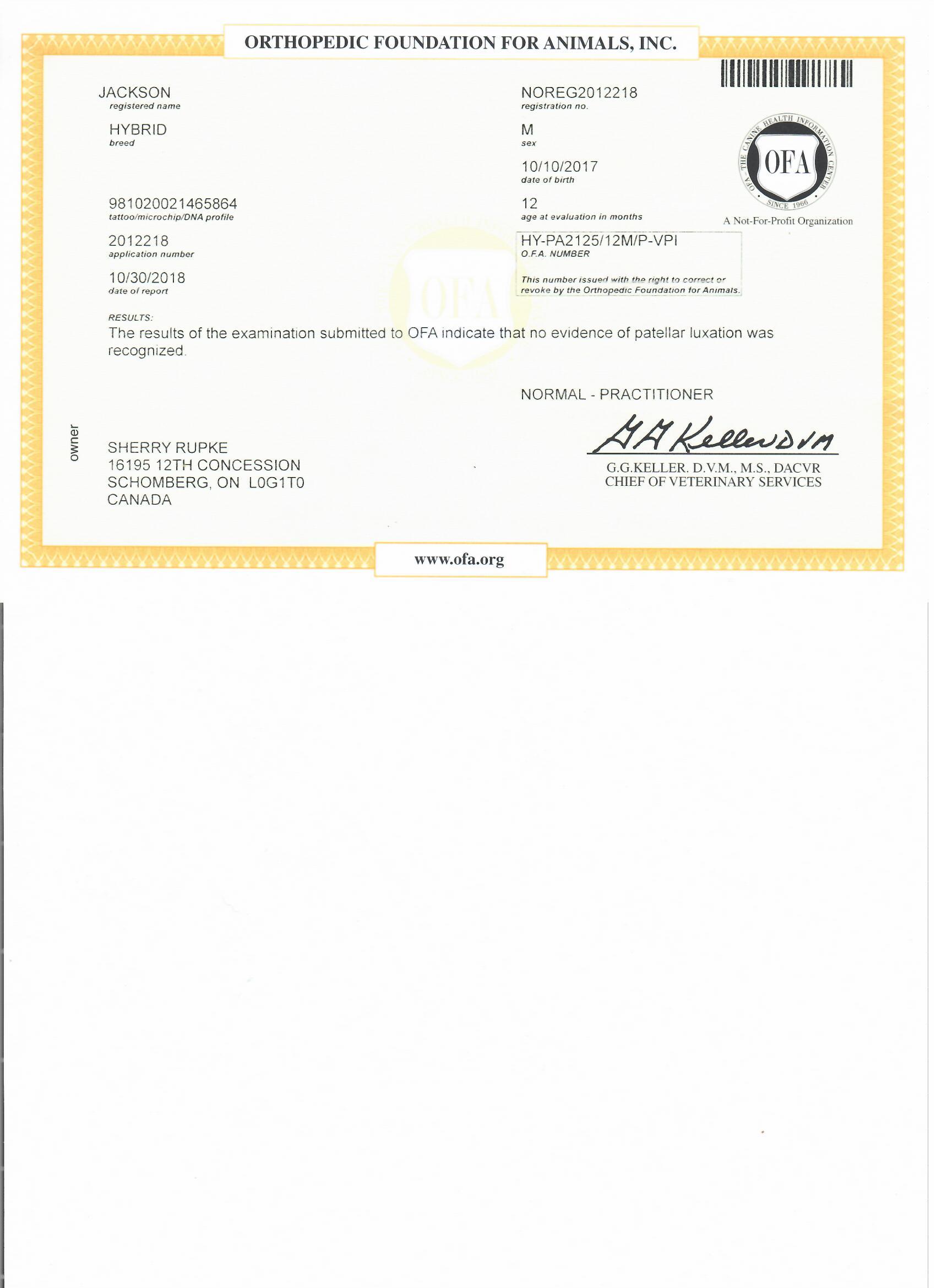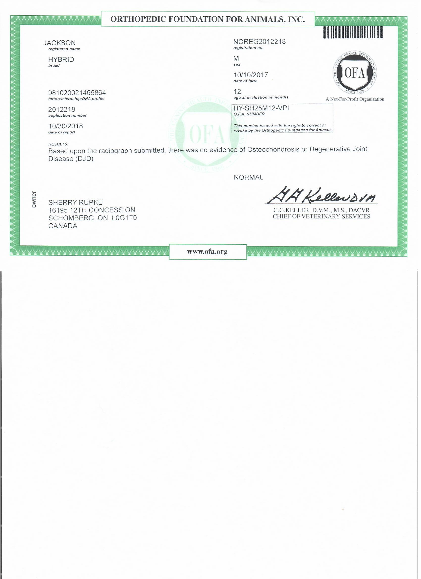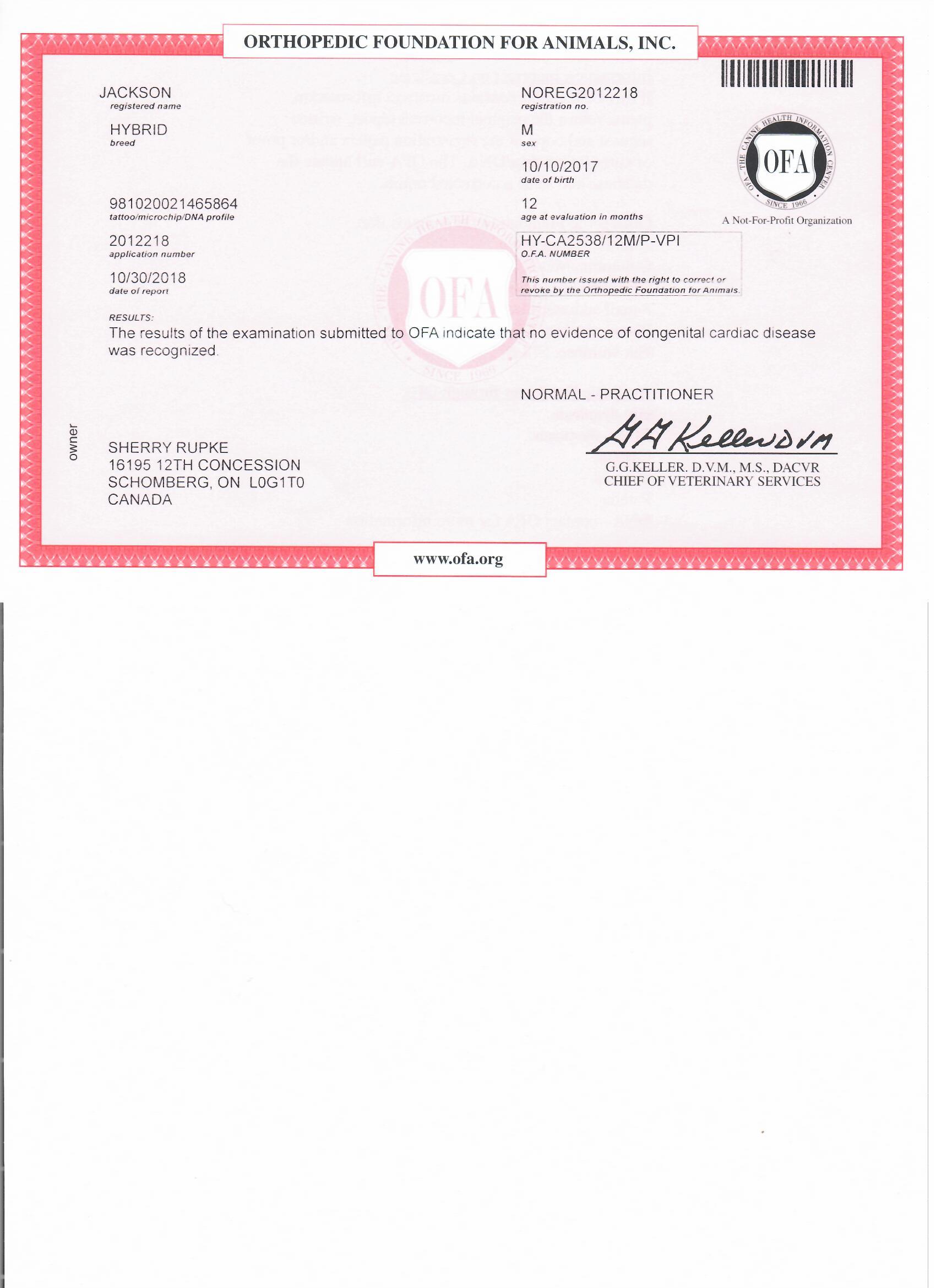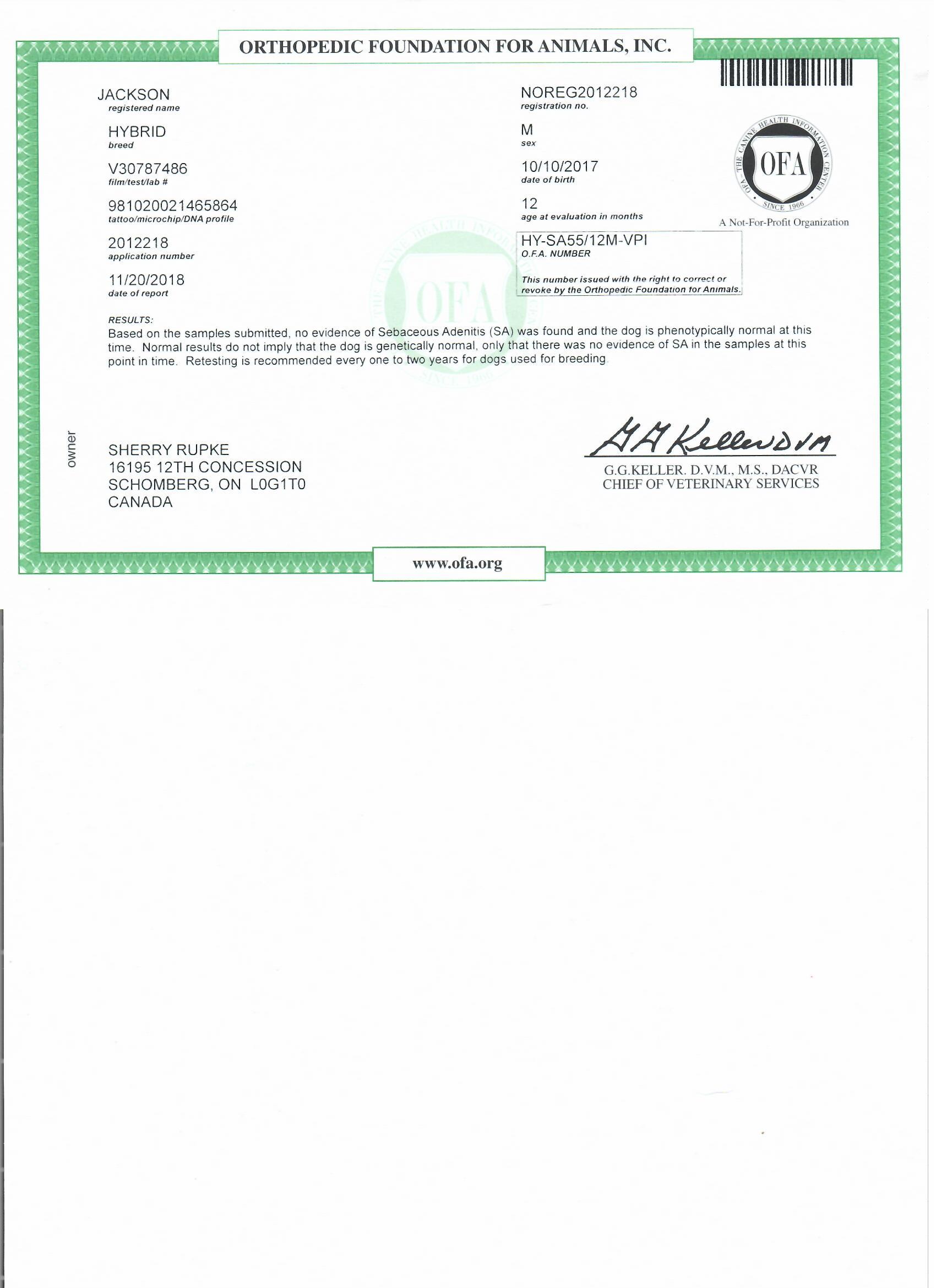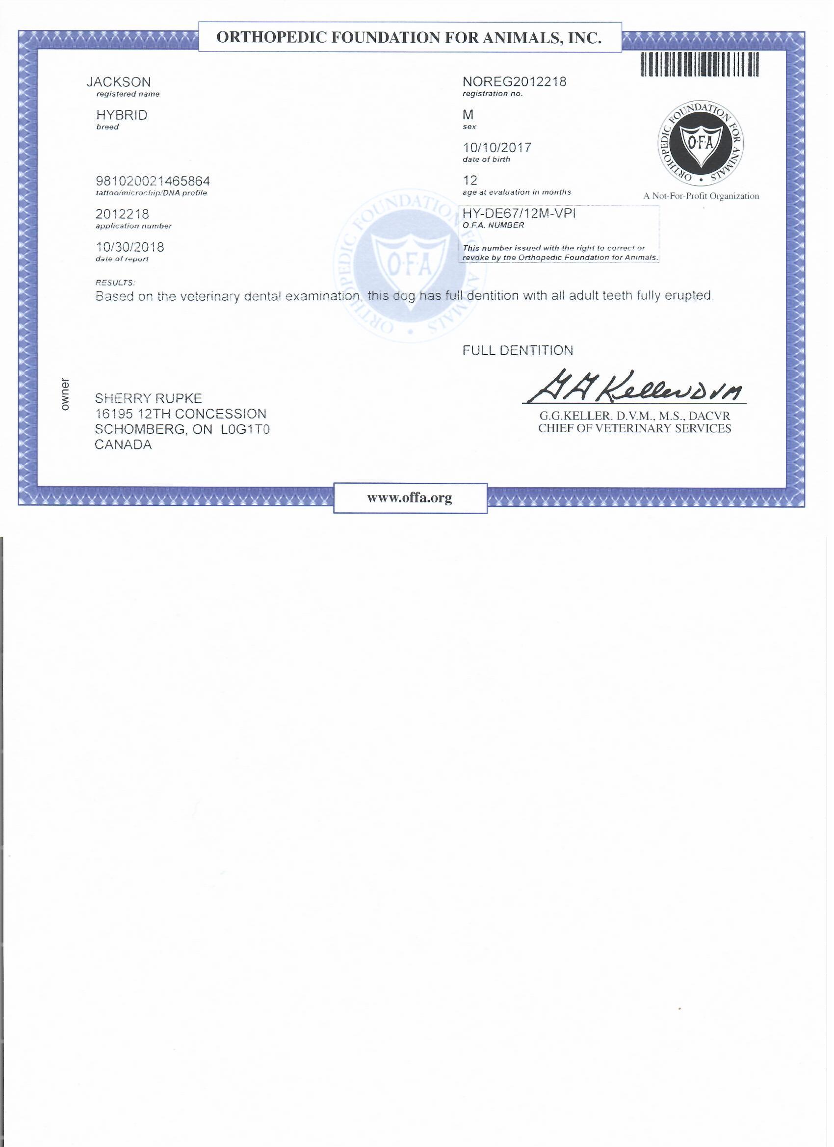 Jackson has been fully health tested, and his health certificates are attached for your review. At SwissRidge, we complete thorough health testing on all of our dogs, including x-rays, DNA testing, and comprehensive physical exams performed by a licensed veterinarian to ensure we are breeding only the healthiest dogs who will go on to produce strong, healthy puppies.