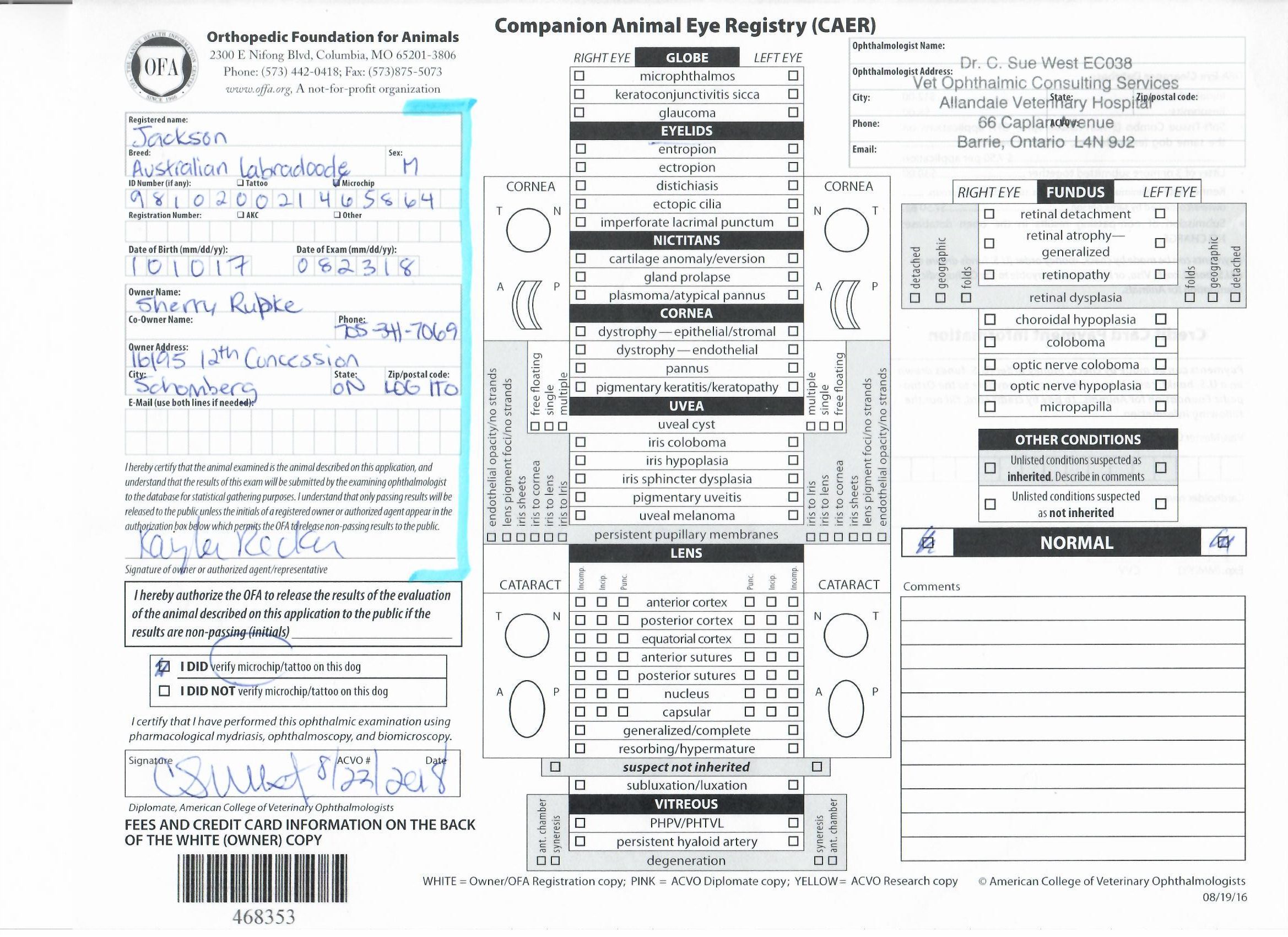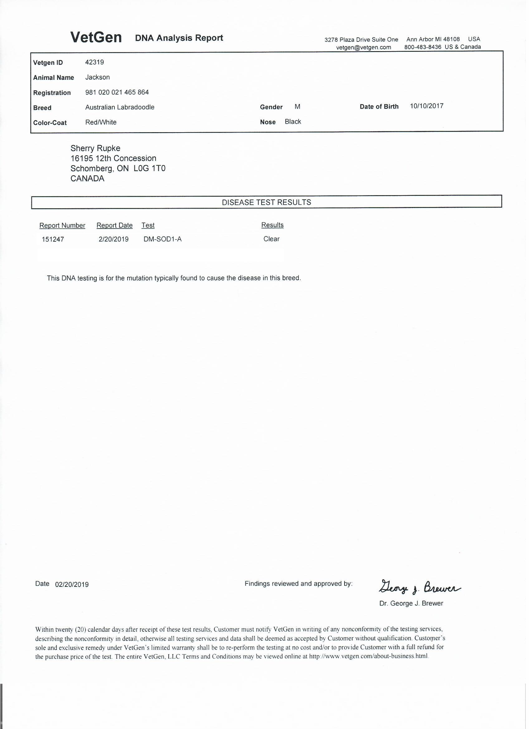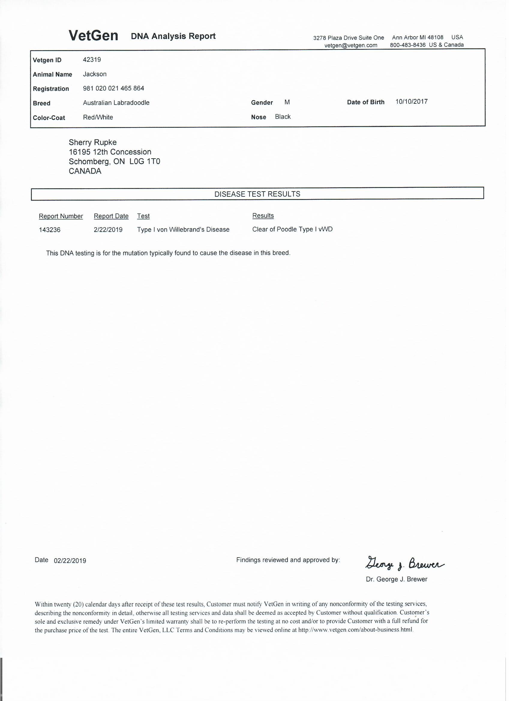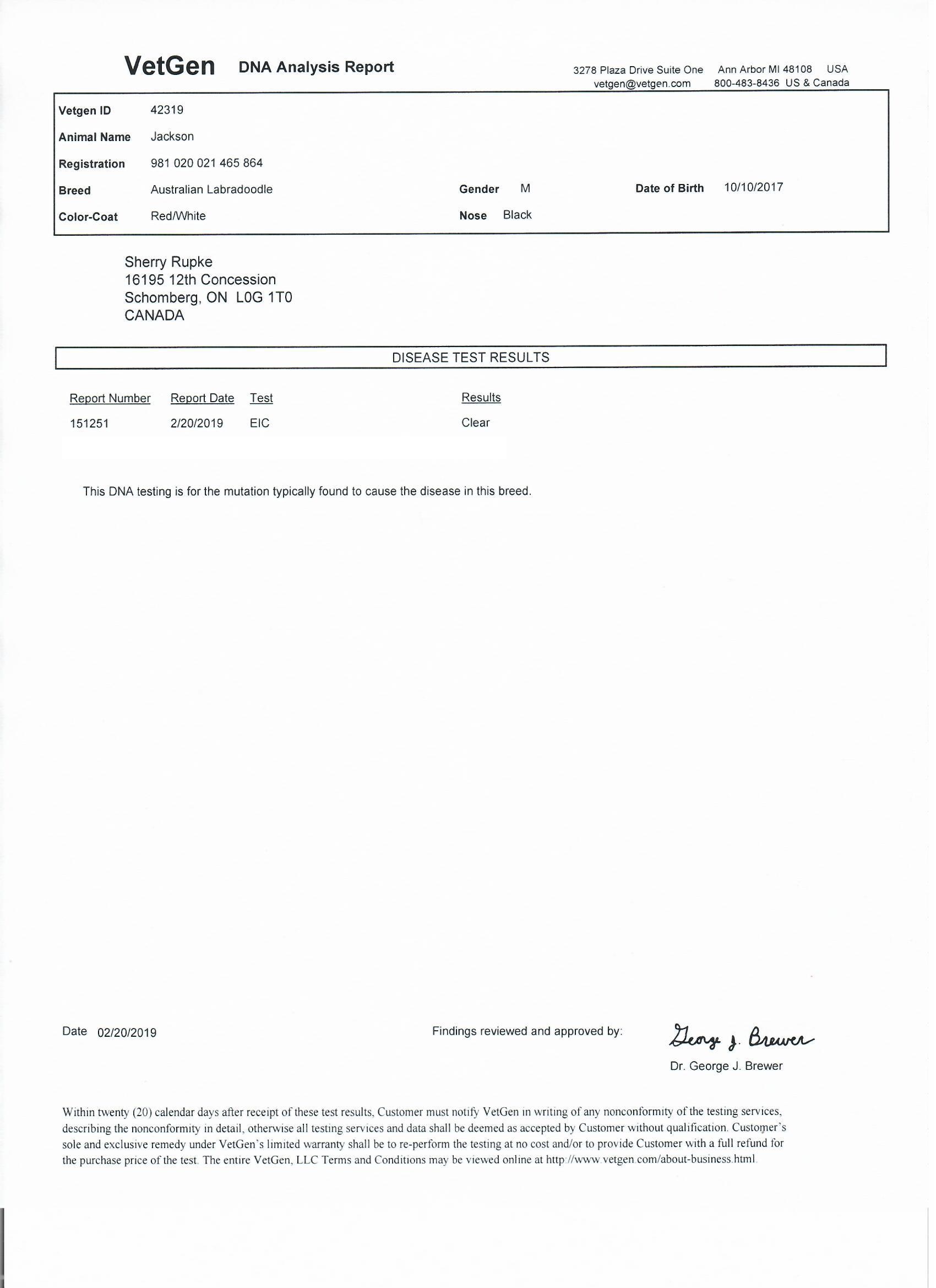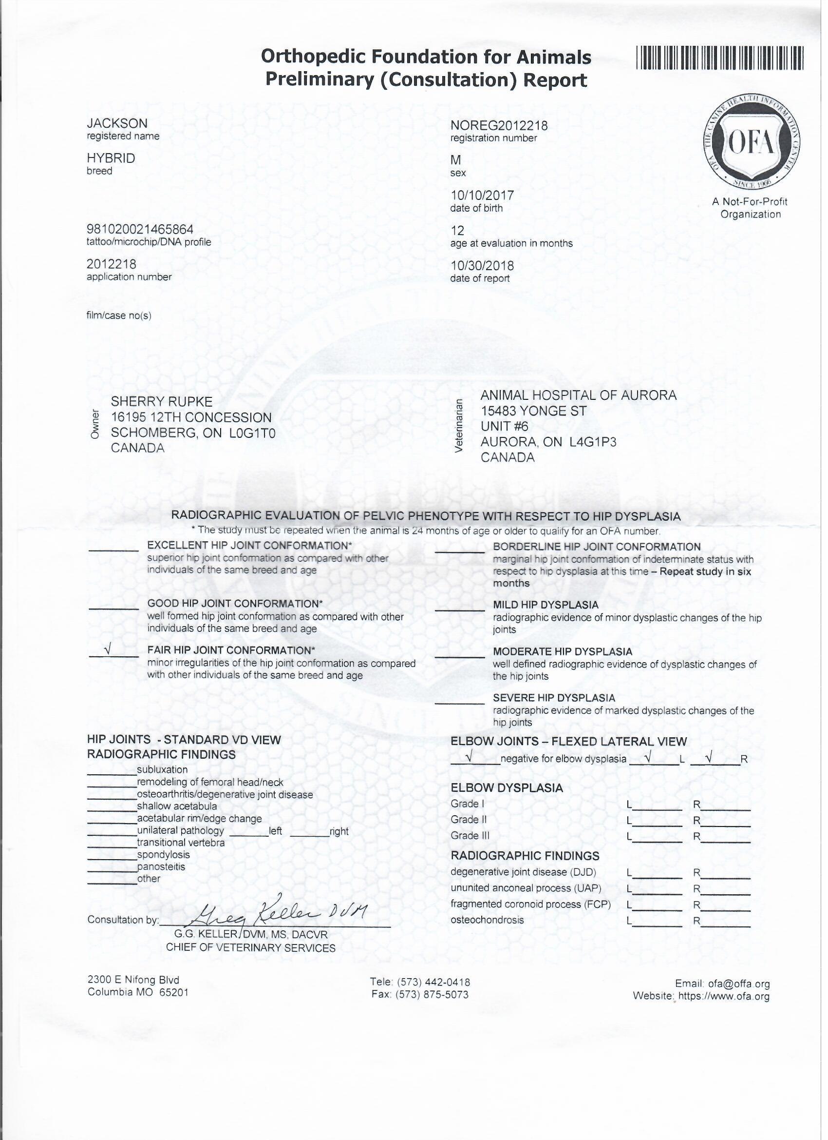 Jackson has been fully health tested, and his health certificates are attached for your review. At SwissRidge, we complete thorough health testing on all of our dogs, including x-rays, DNA testing, and comprehensive physical exams performed by a licensed veterinarian to ensure we are breeding only the healthiest dogs who will go on to produce strong, healthy puppies.