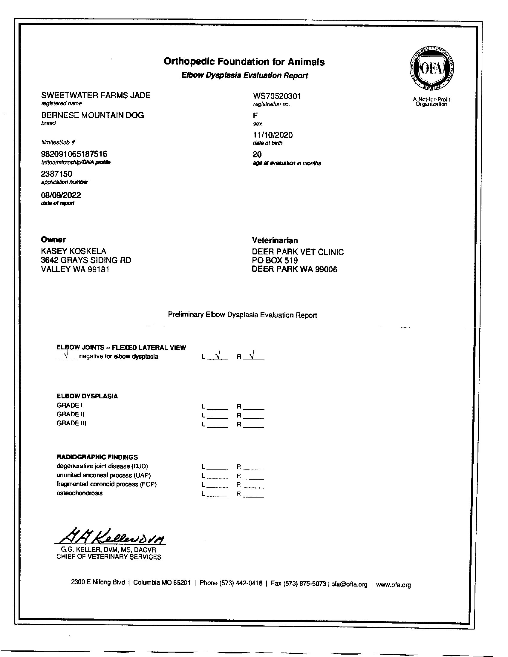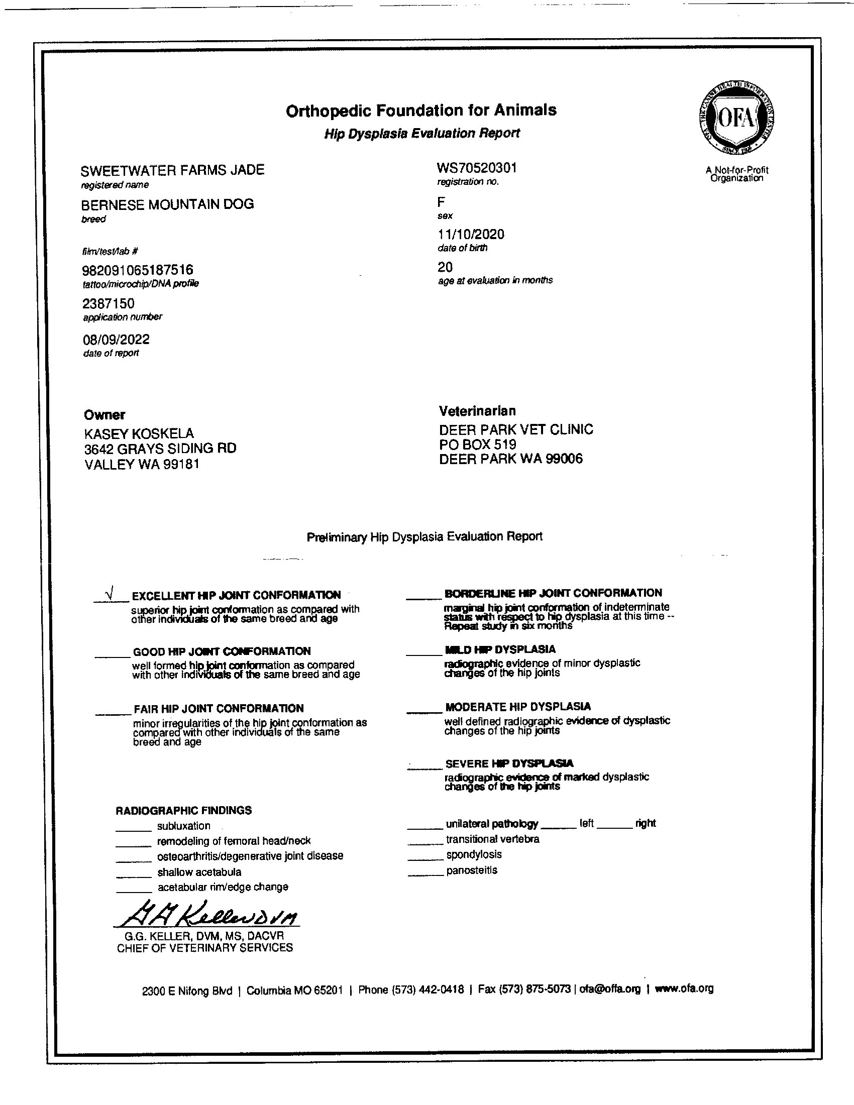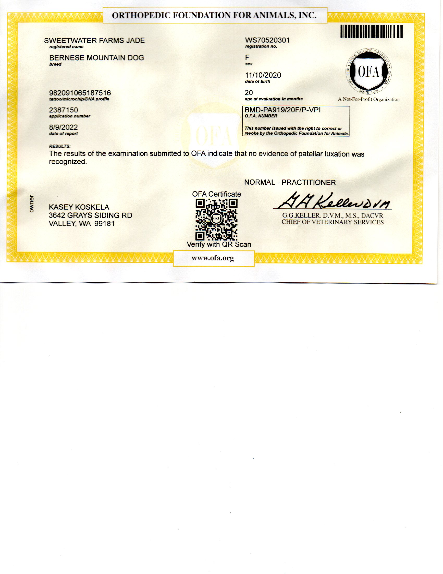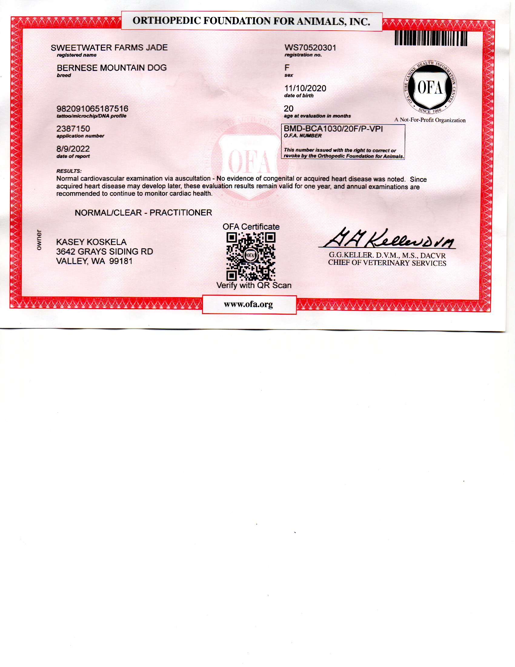 Jade has been fully health tested, and her health certificates are attached for your review. She has also been screened through Embark for over 250 genetic health conditions. At SwissRidge, we complete thorough health testing on all of our dogs, including x-rays, DNA testing, and comprehensive physical exams performed by a licensed veterinarian to ensure we are breeding only the healthiest dogs who will go on to produce strong, healthy puppies.