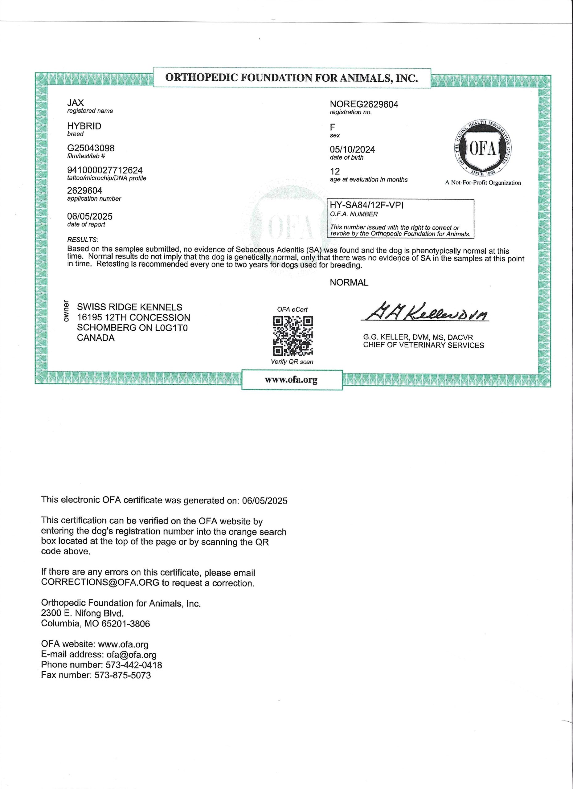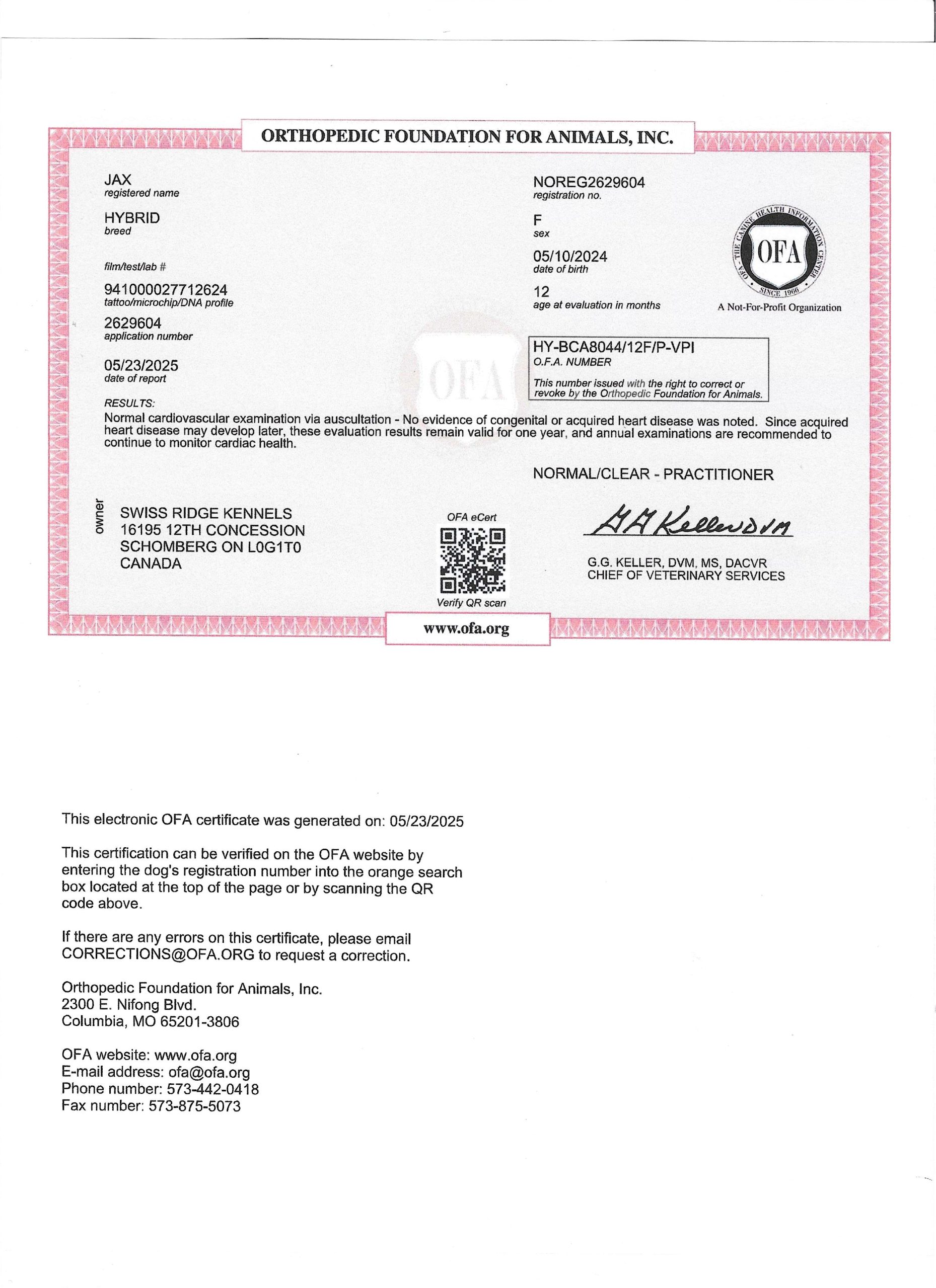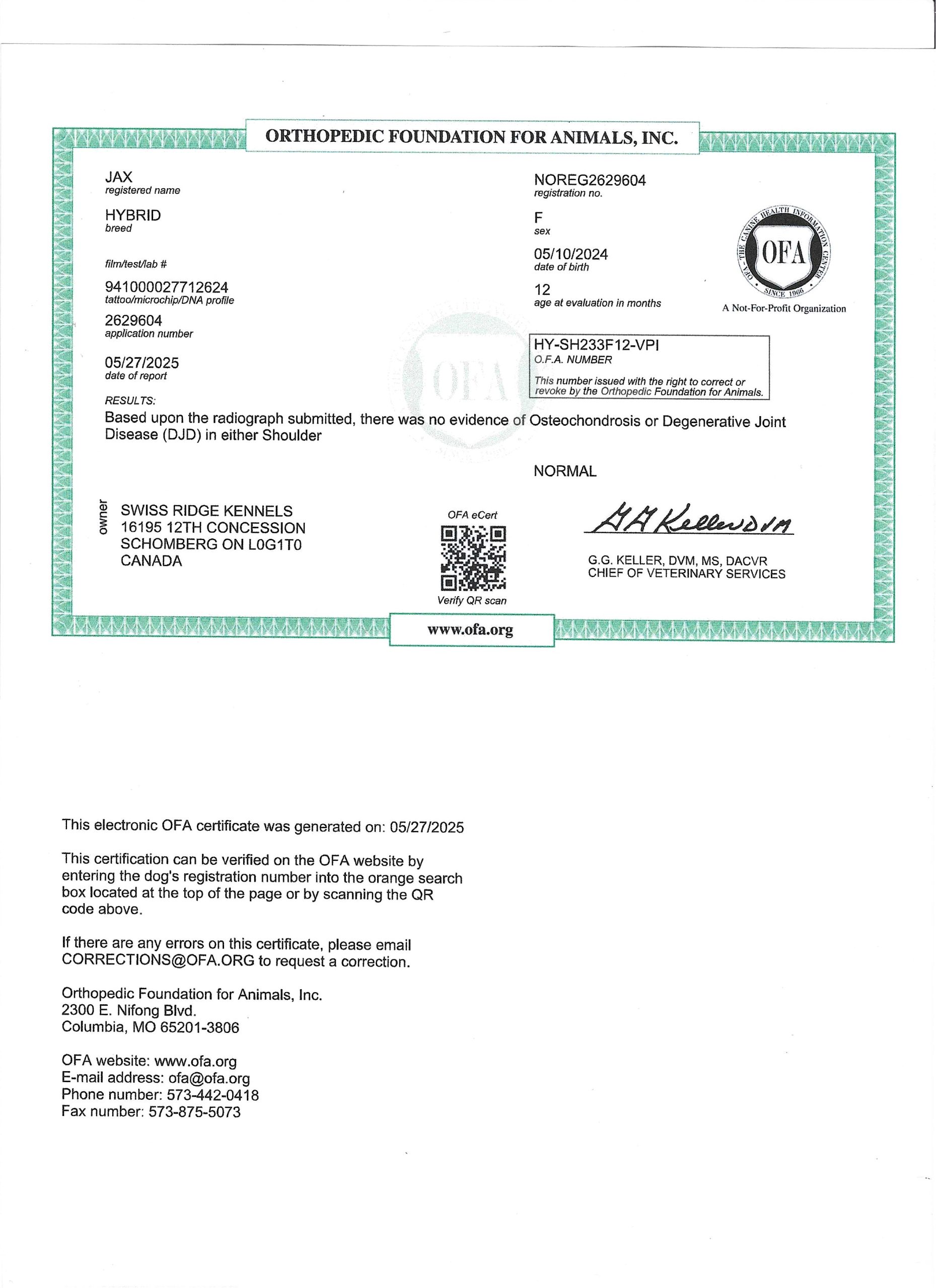 Jax has been fully health tested, and her health certificates are attached for your review. She has also been screened through Embark for over 250 genetic health conditions. At SwissRidge, we complete thorough health testing on all of our dogs, including x-rays, DNA testing, and comprehensive physical exams performed by a licensed veterinarian to ensure we are breeding only the healthiest dogs who will go on to produce strong, healthy puppies.