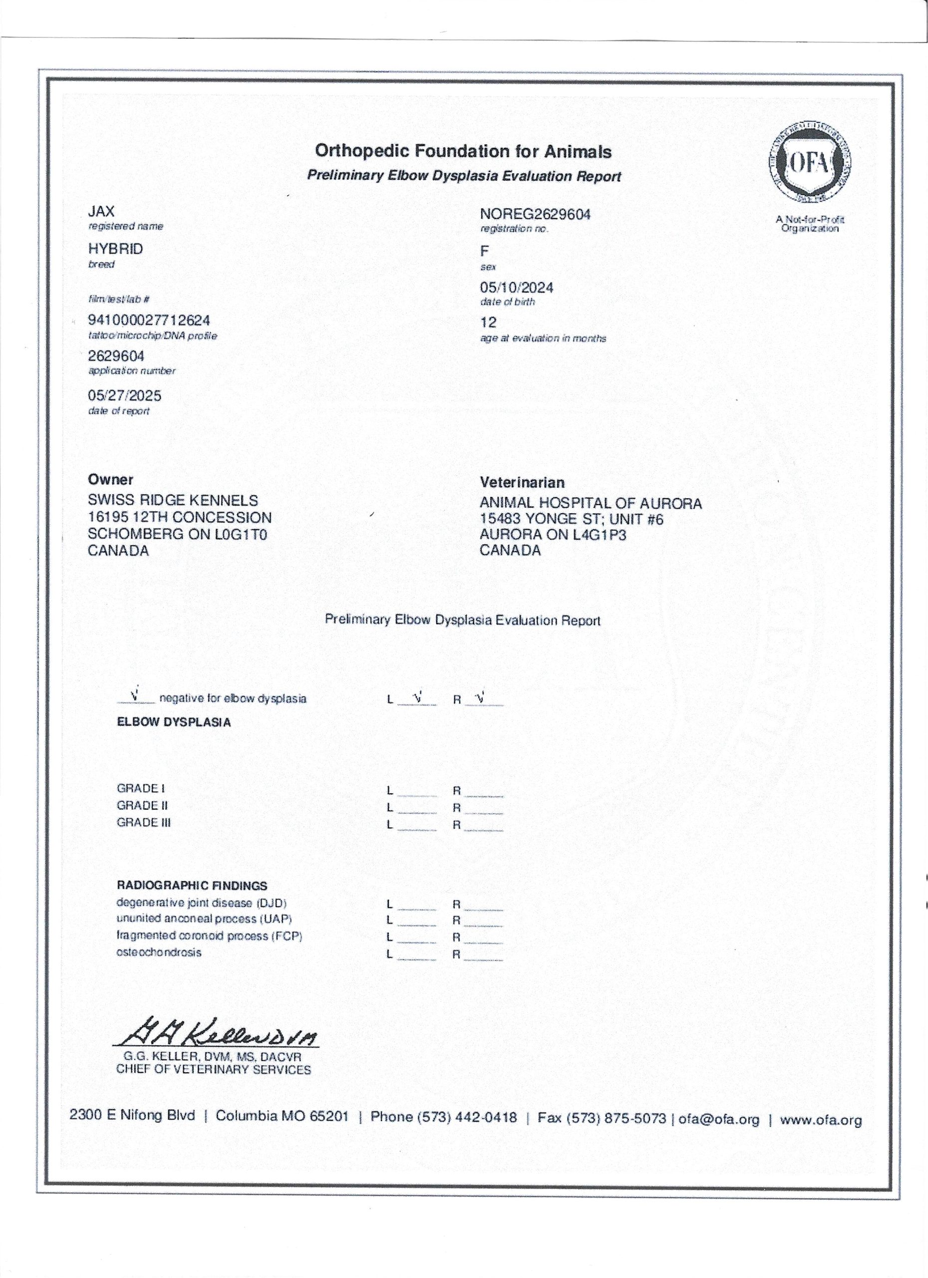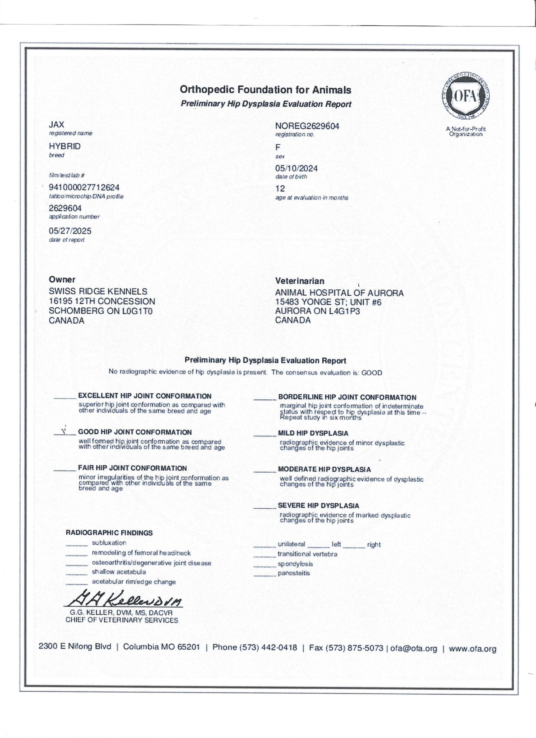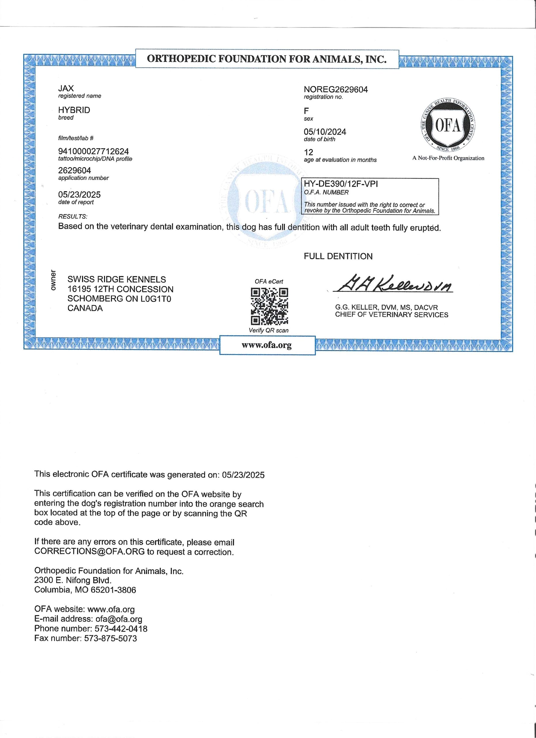 Jax has been fully health tested, and her health certificates are attached for your review. She has also been screened through Embark for over 250 genetic health conditions. At SwissRidge, we complete thorough health testing on all of our dogs, including x-rays, DNA testing, and comprehensive physical exams performed by a licensed veterinarian to ensure we are breeding only the healthiest dogs who will go on to produce strong, healthy puppies.