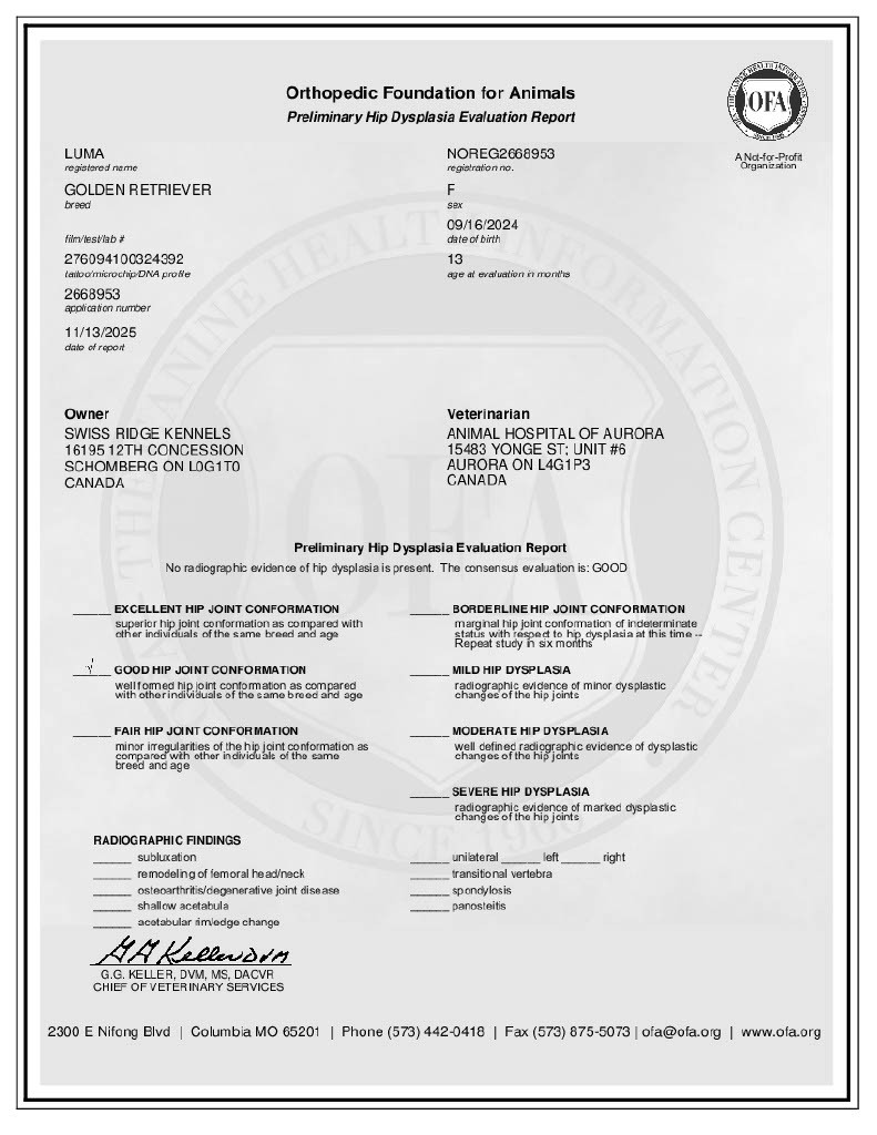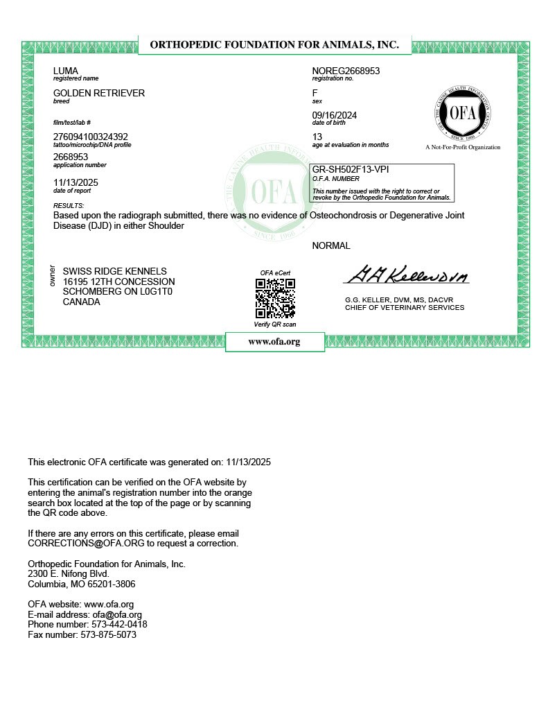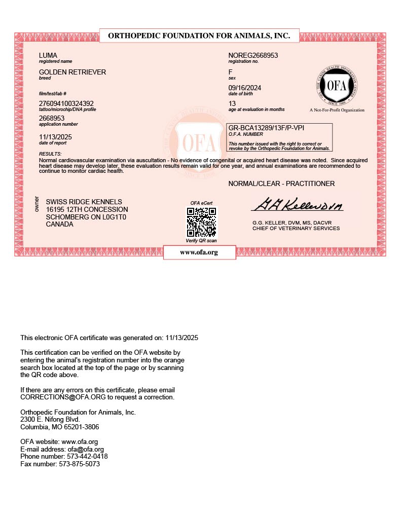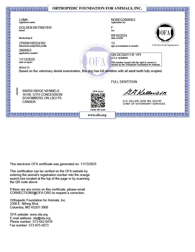 Luma has been fully health tested, and her health certificates are attached for your review. She has also been screened through Embark for over 250 genetic health conditions. At SwissRidge, we complete thorough health testing on all of our dogs, including x-rays, DNA testing, and comprehensive physical exams performed by a licensed veterinarian to ensure we are breeding only the healthiest dogs who will go on to produce strong, healthy puppies.