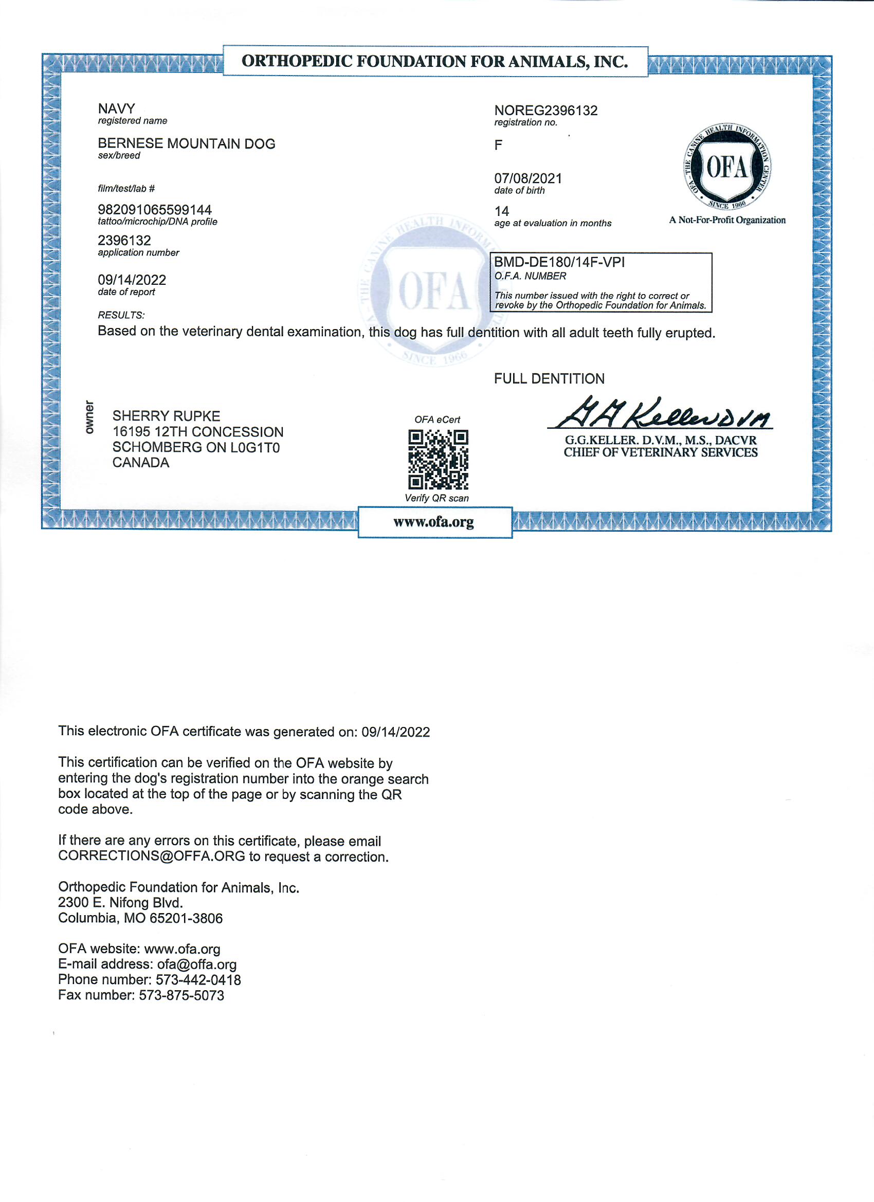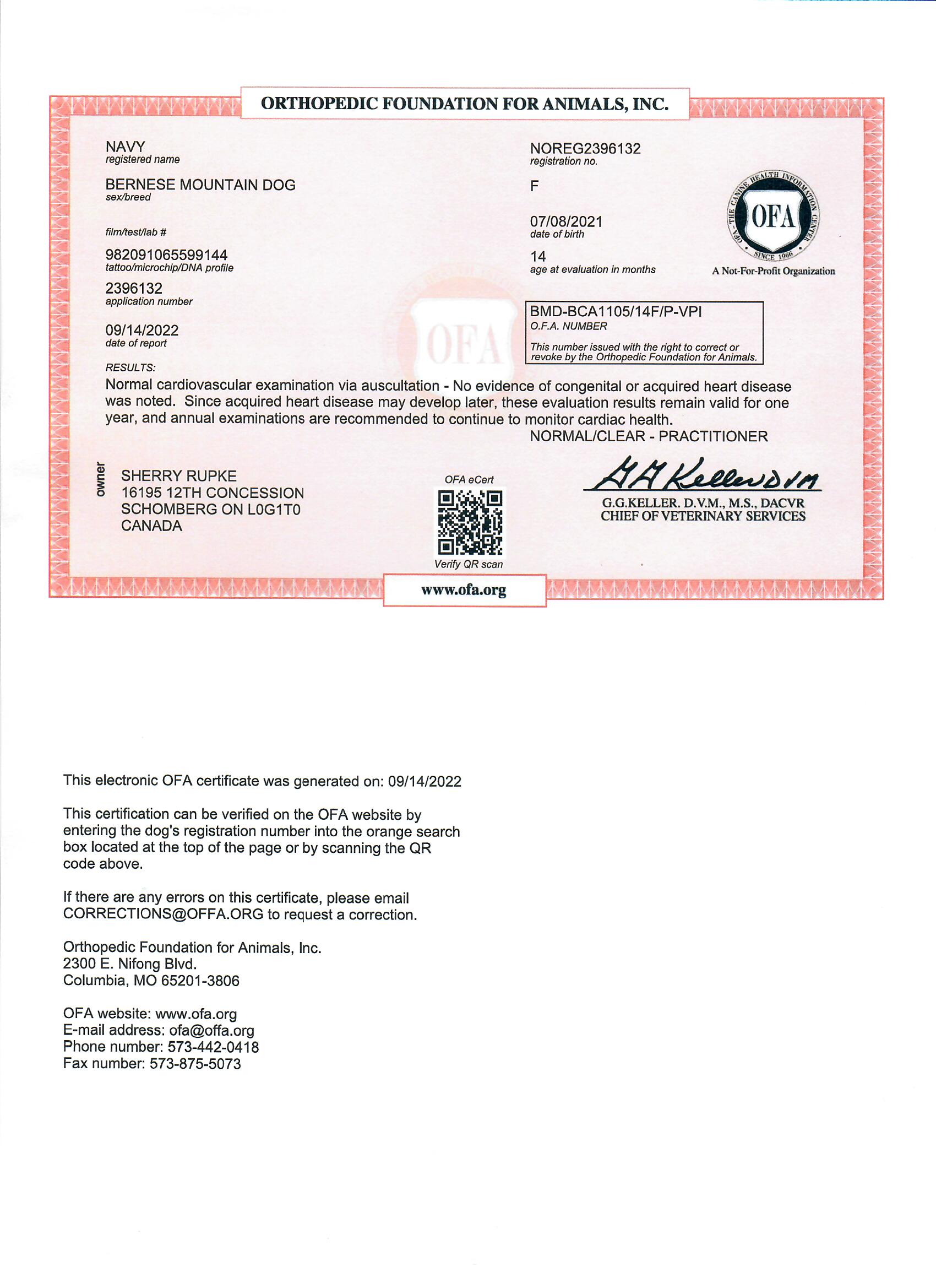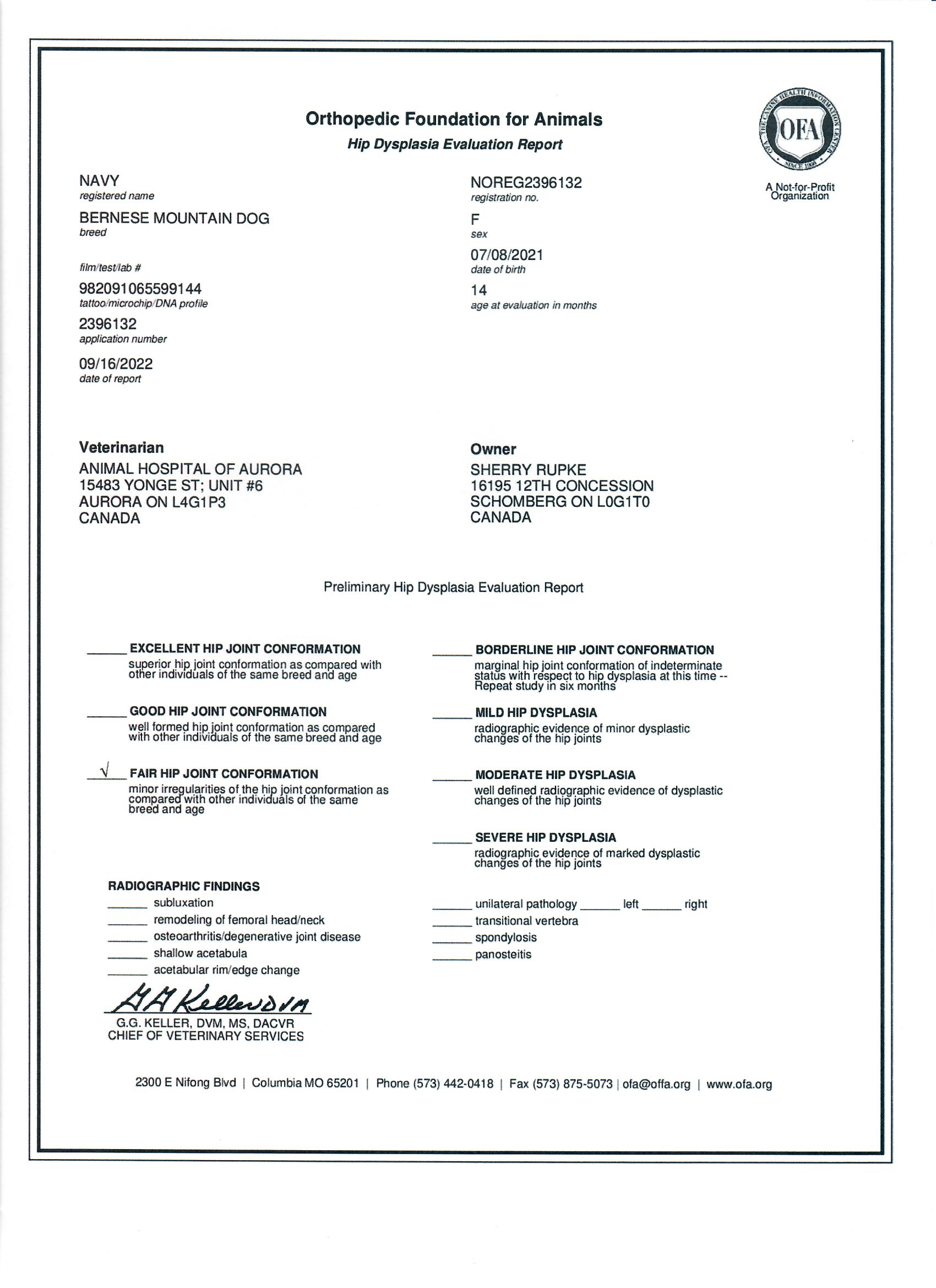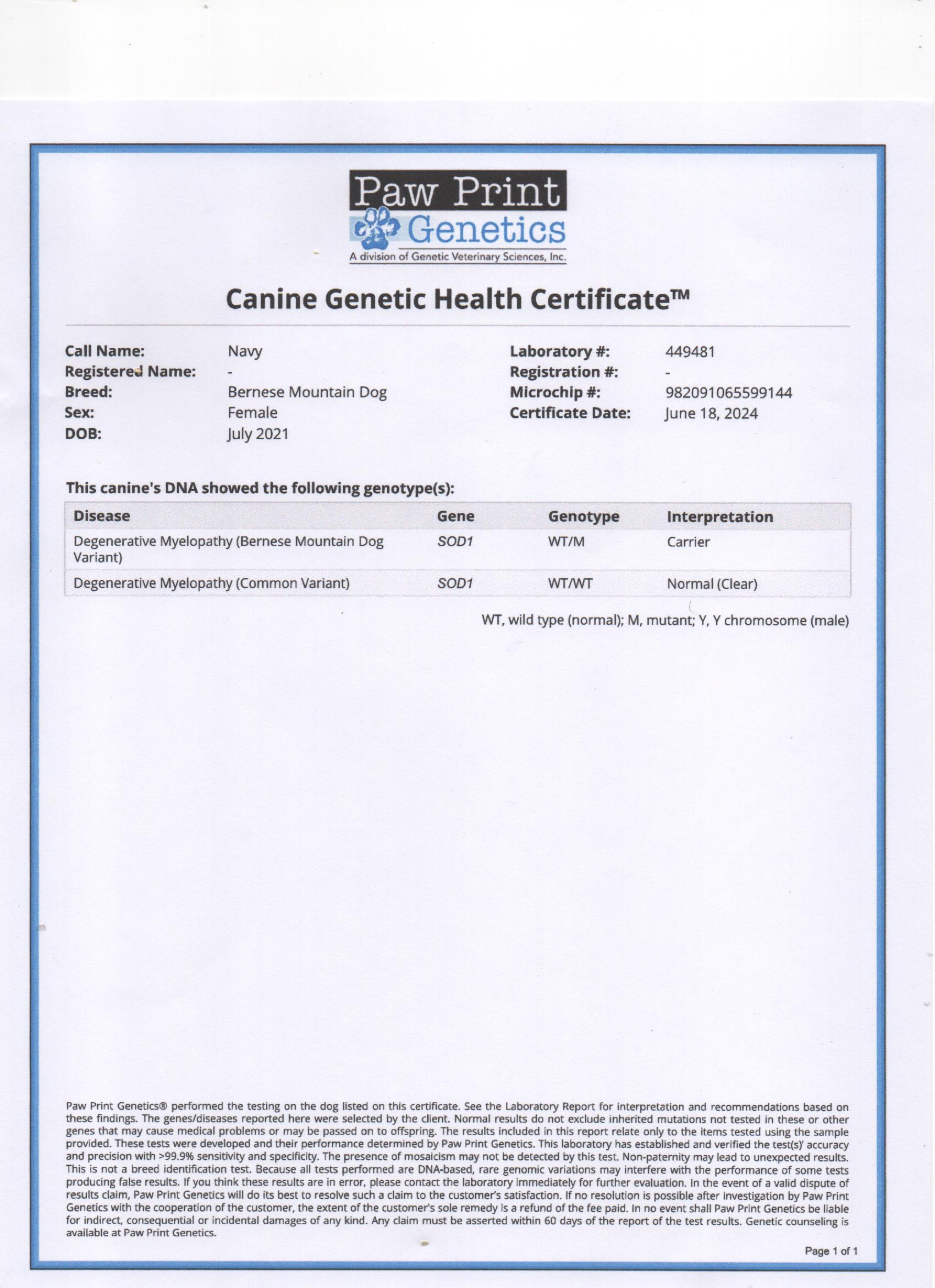 Navy has been fully health tested, and her health certificates are attached for your review. At SwissRidge, we complete thorough health testing on all of our dogs, including x-rays, DNA testing, and comprehensive physical exams performed by a licensed veterinarian to ensure we are breeding only the healthiest dogs who will go on to produce strong, healthy puppies.