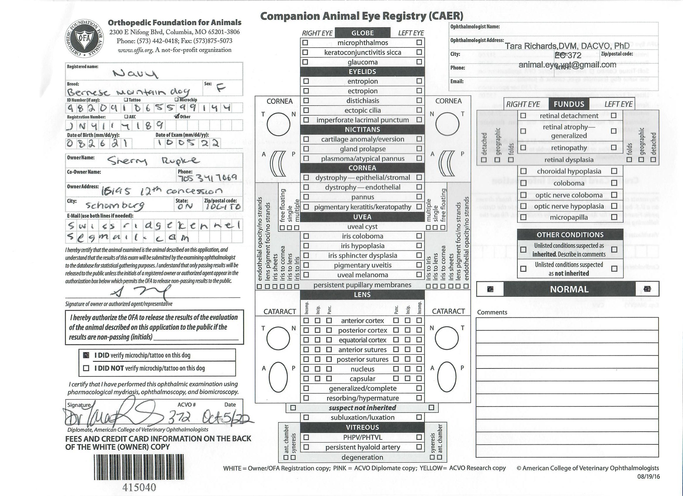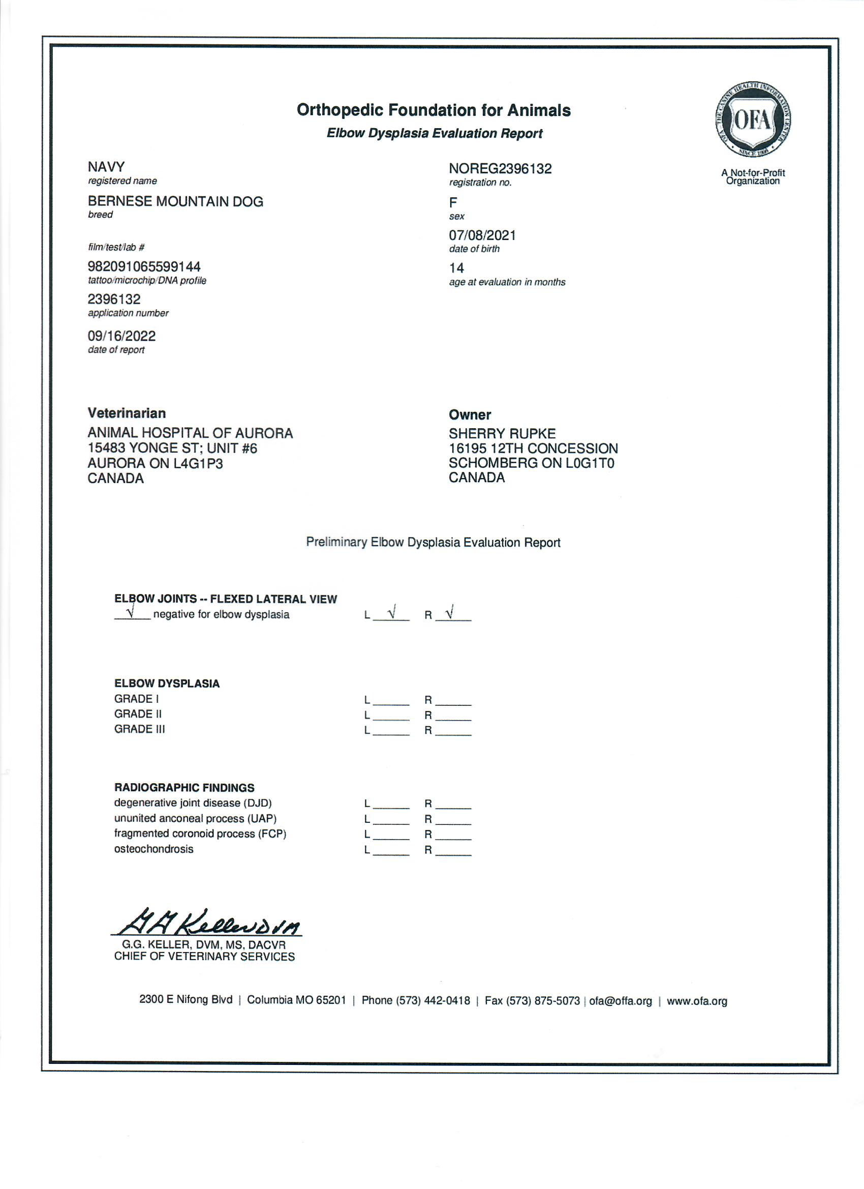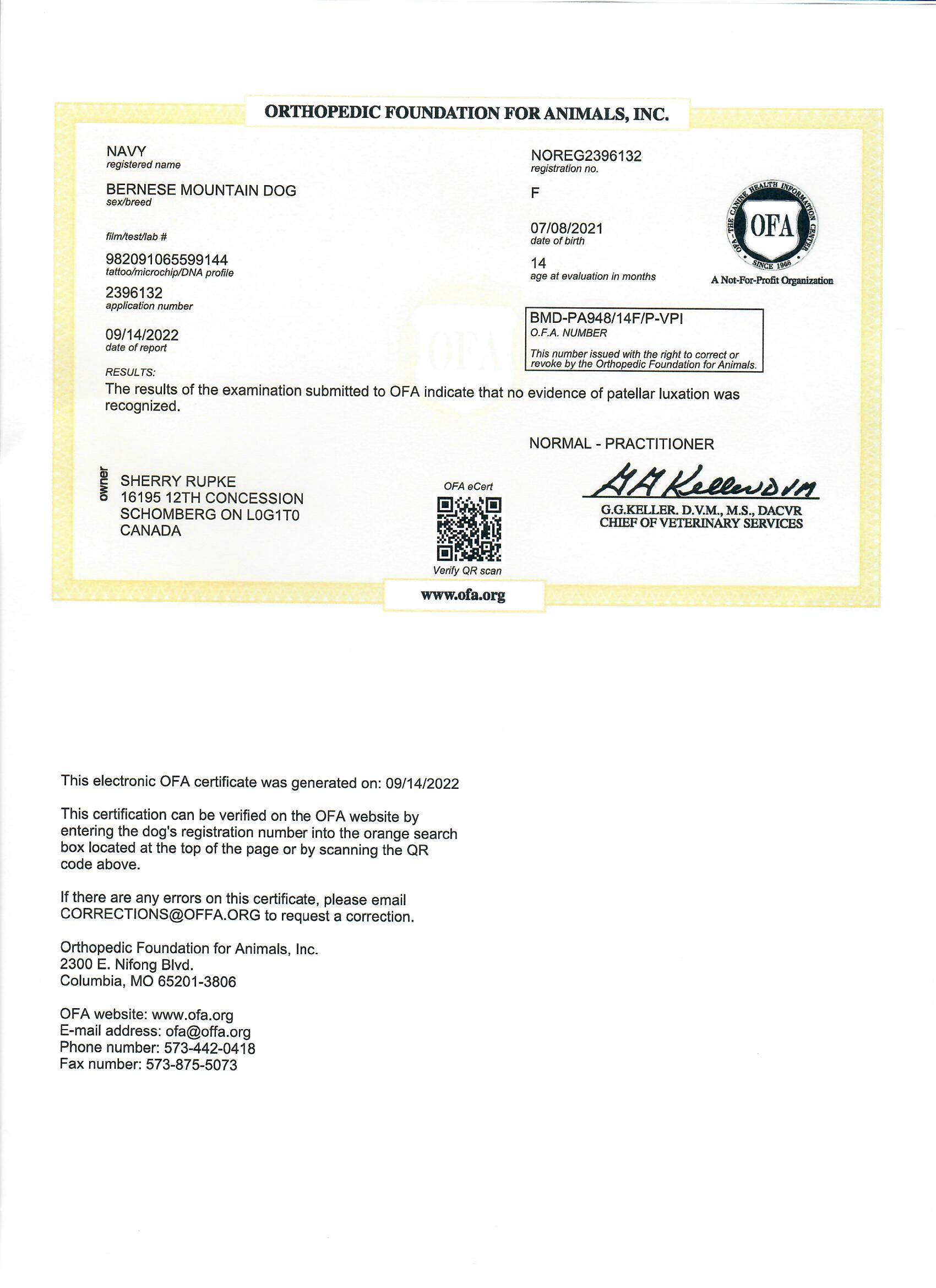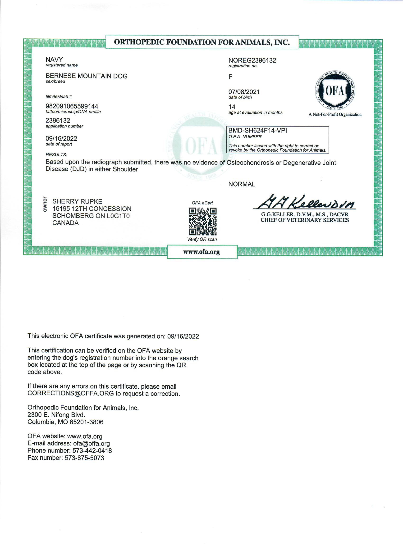 Navy has been fully health tested, and her health certificates are attached for your review. At SwissRidge, we complete thorough health testing on all of our dogs, including x-rays, DNA testing, and comprehensive physical exams performed by a licensed veterinarian to ensure we are breeding only the healthiest dogs who will go on to produce strong, healthy puppies.