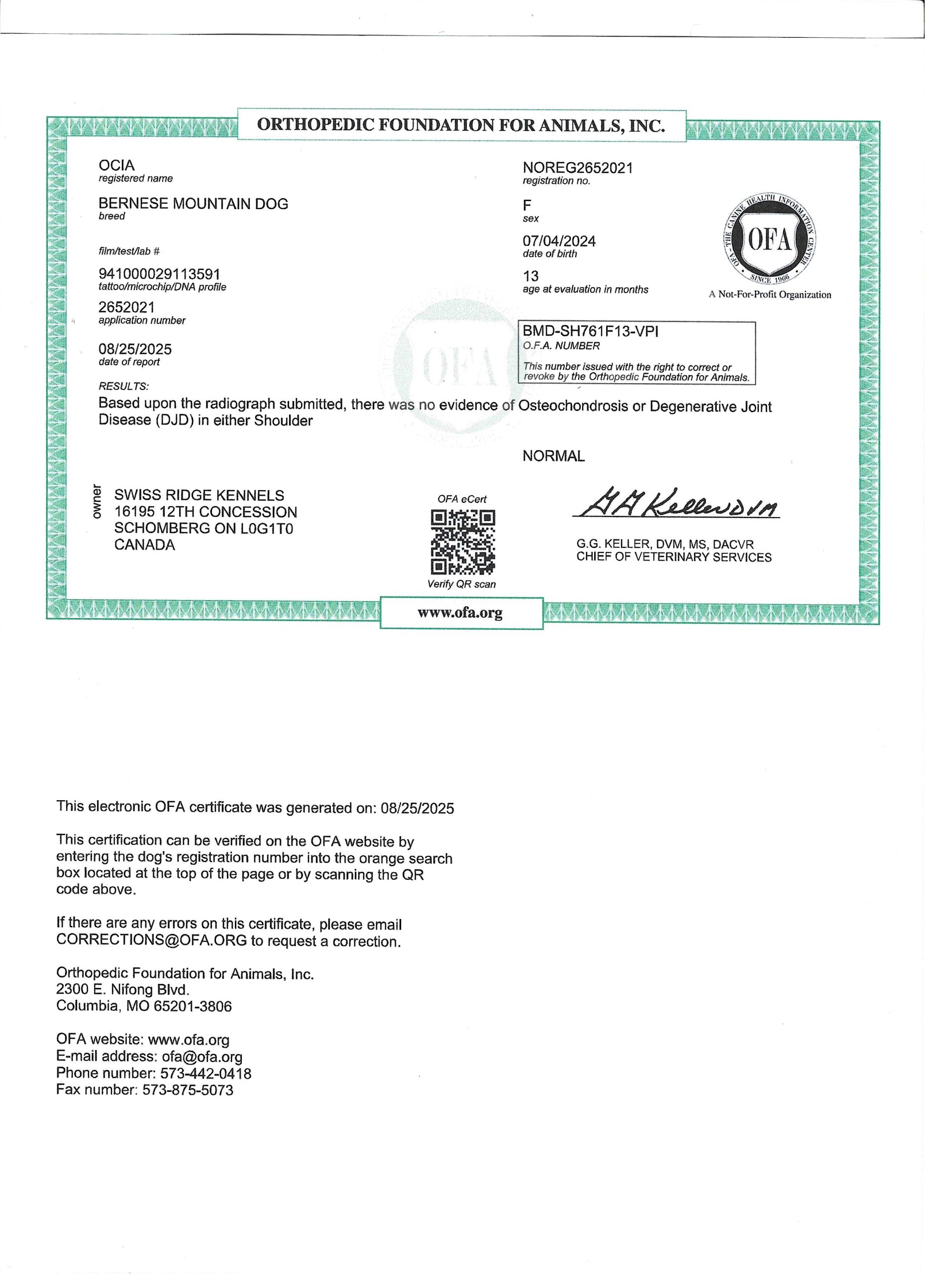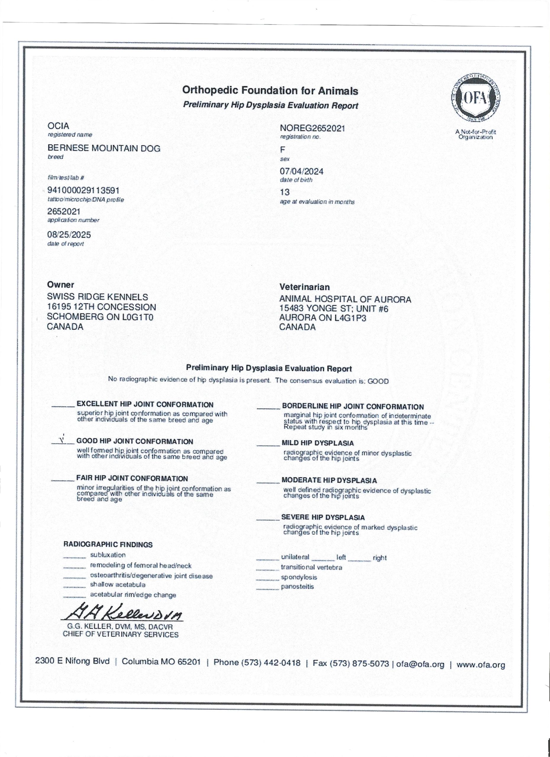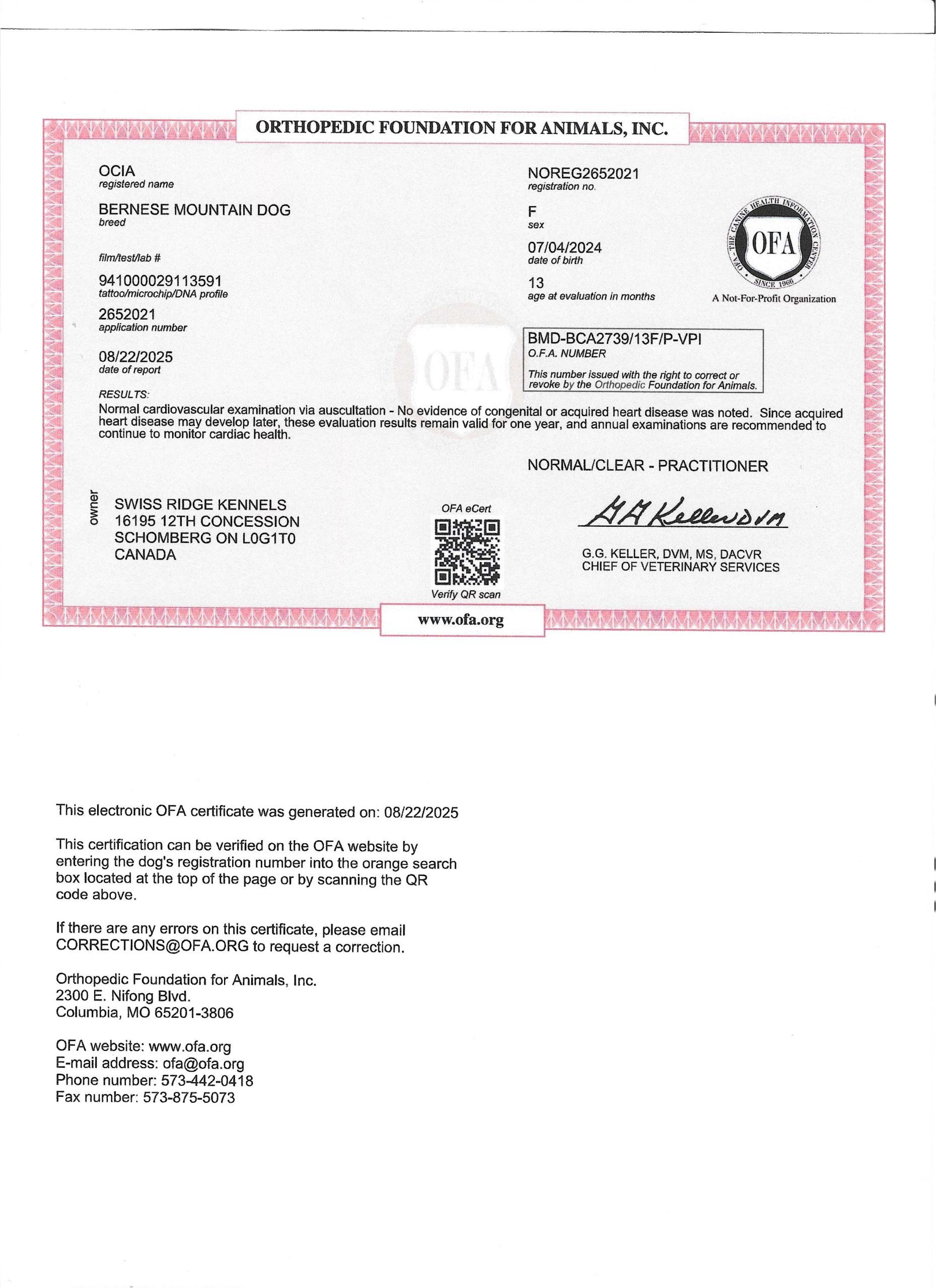 Ocia has been fully health tested, and her health certificates are attached for your review. She has also been screened through Embark for over 250 genetic health conditions. At SwissRidge, we complete thorough health testing on all of our dogs, including x-rays, DNA testing, and comprehensive physical exams performed by a licensed veterinarian to ensure we are breeding only the healthiest dogs who will go on to produce strong, healthy puppies.