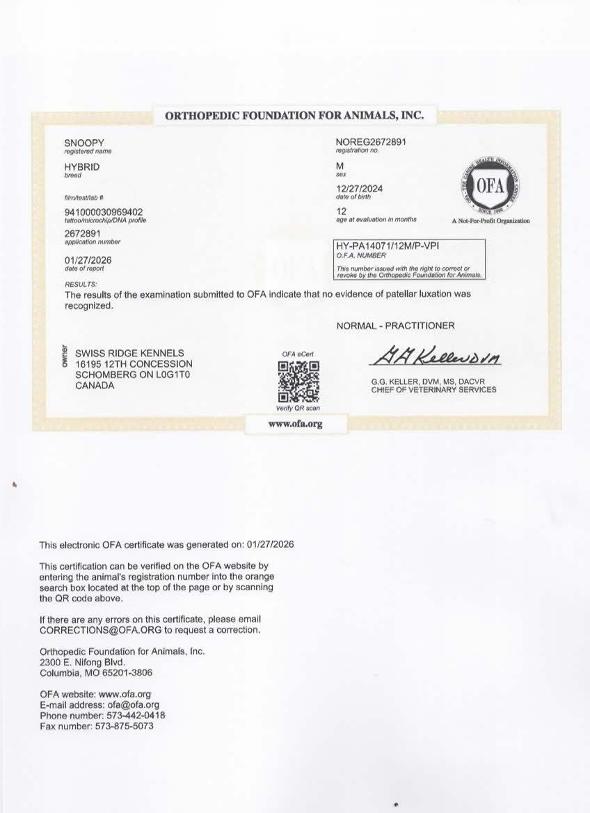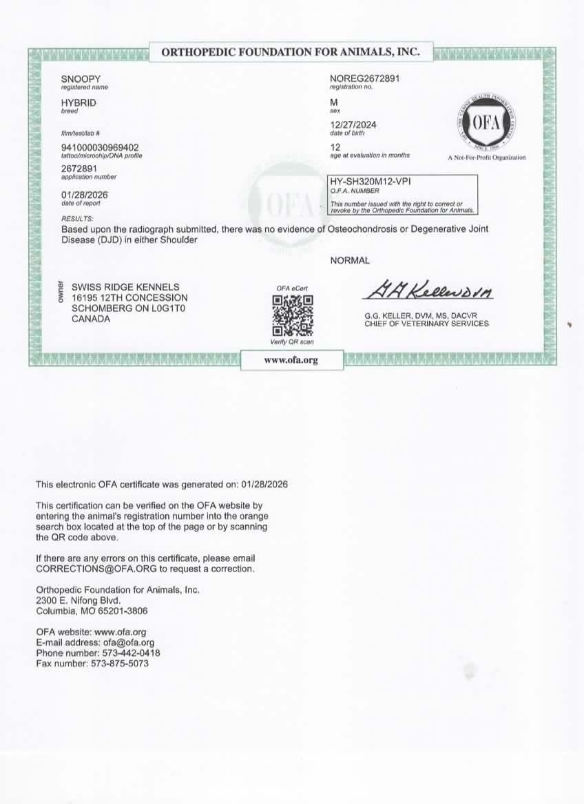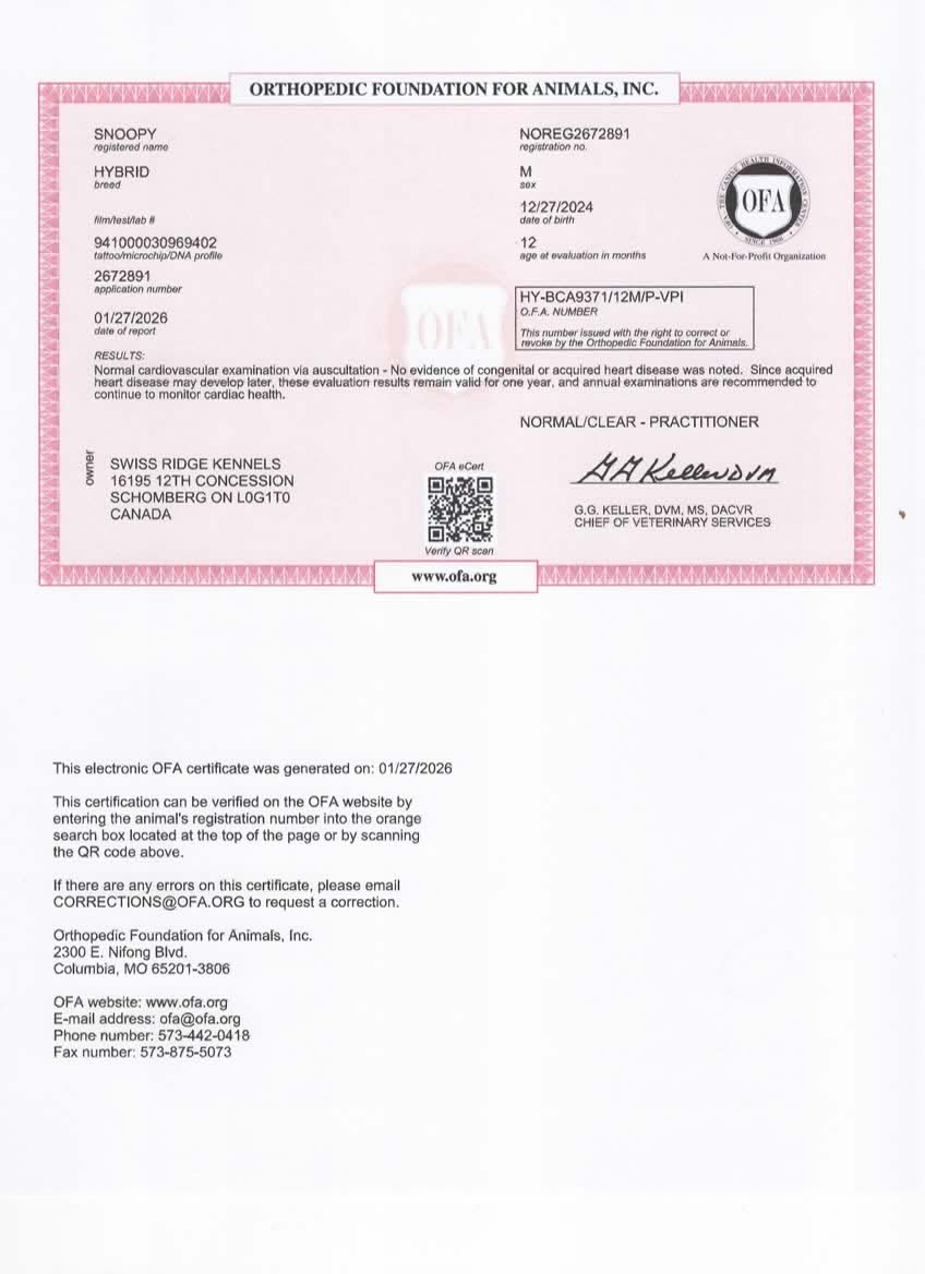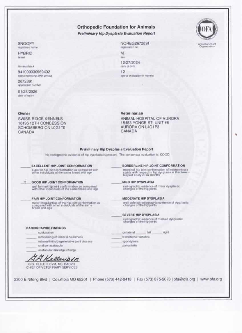Snoopy has been fully health tested, and his health certificates are attached for your review. He has also been screened through Embark for over 250 genetic health conditions (copy available upon request). At SwissRidge, we complete thorough health testing on all of our dogs, including x-rays, DNA testing, and physical exams performed by a licensed veterinarian to ensure we are breeding only the healthiest dogs who will go on to produce strong, healthy puppies.