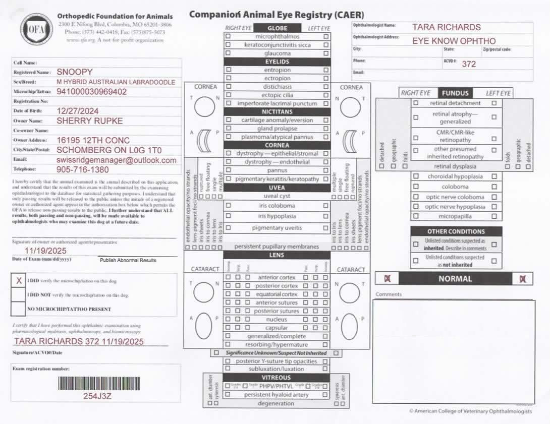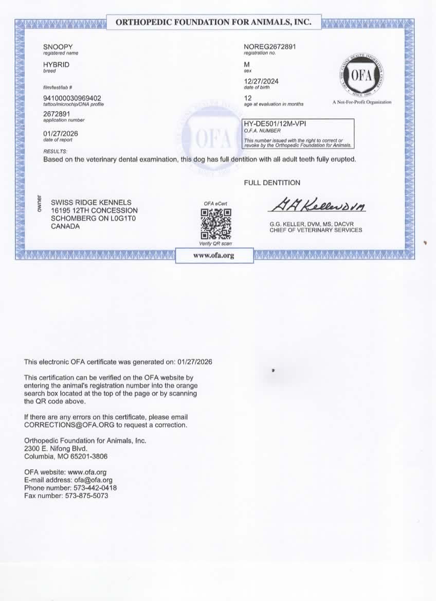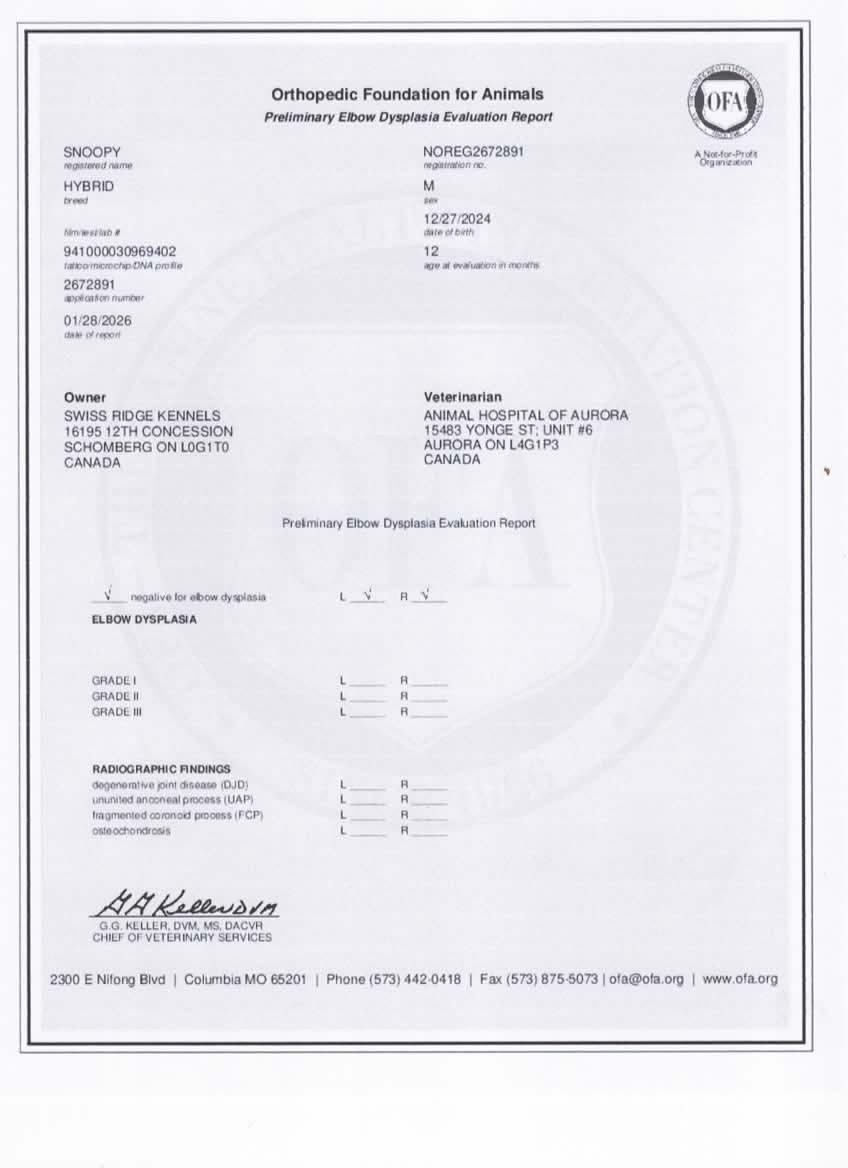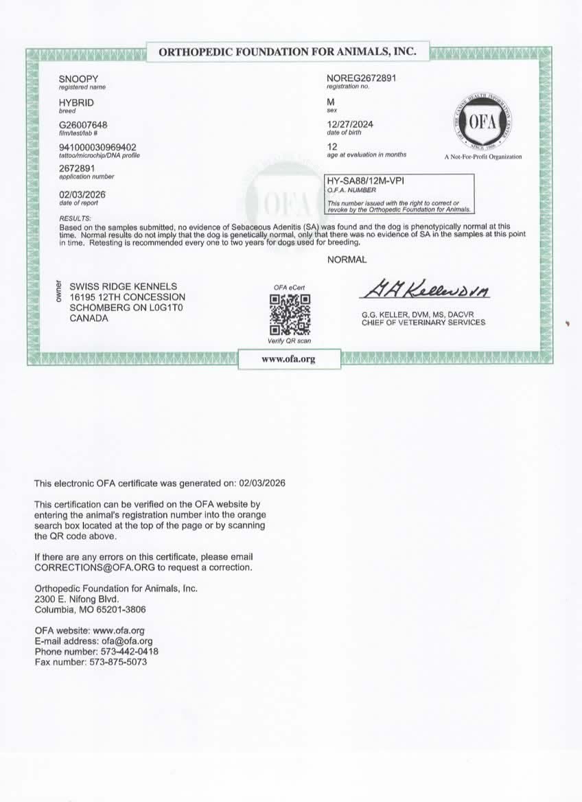 Snoopy has been fully health tested, and his health certificates are attached for your review. He has also been screened through Embark for over 250 genetic health conditions (copy available upon request). At SwissRidge, we complete thorough health testing on all of our dogs, including x-rays, DNA testing, and physical exams performed by a licensed veterinarian to ensure we are breeding only the healthiest dogs who will go on to produce strong, healthy puppies.