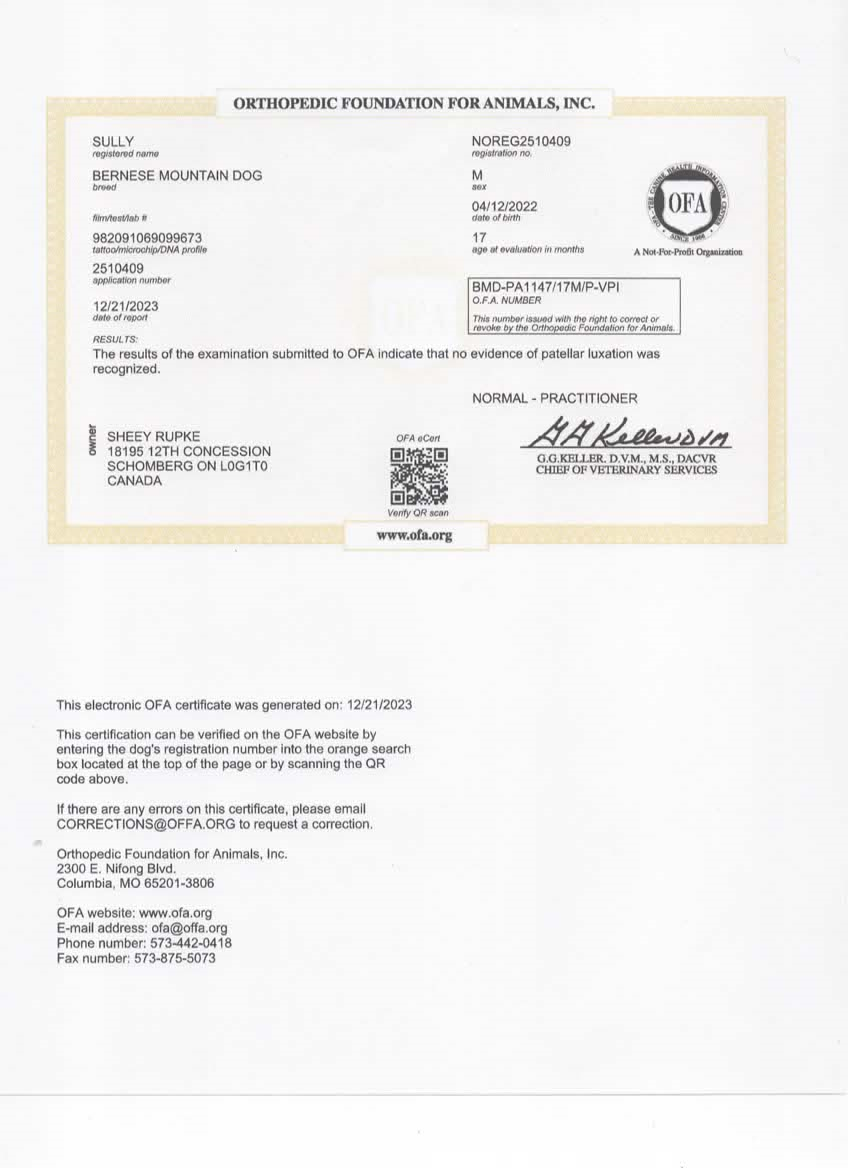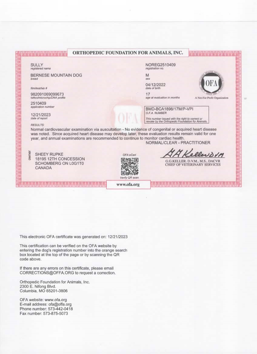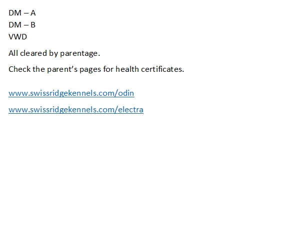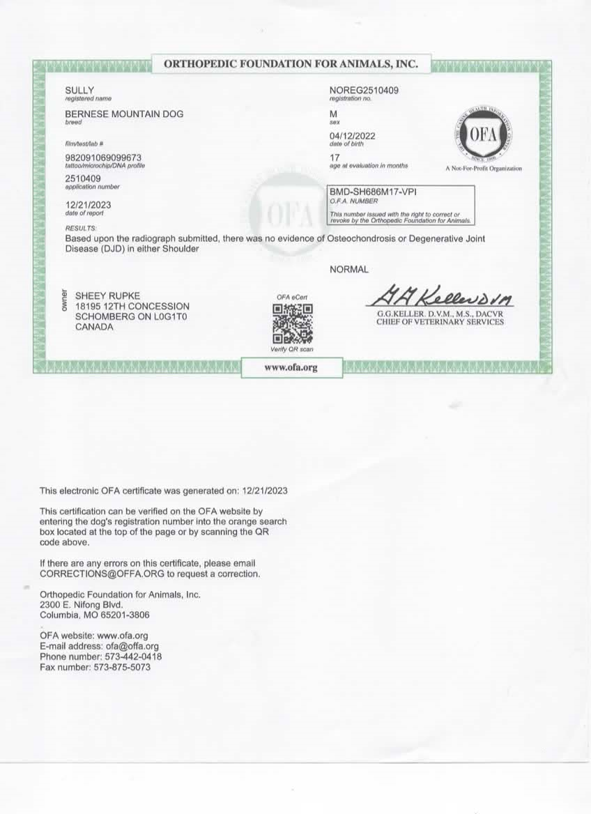 Sully has been fully health tested, and his health certificates are attached for your review. At SwissRidge, we complete thorough health testing on all of our dogs, including x-rays, DNA testing, and comprehensive physical exams performed by a licensed veterinarian to ensure we are breeding only the healthiest dogs who will go on to produce strong, healthy puppies.
