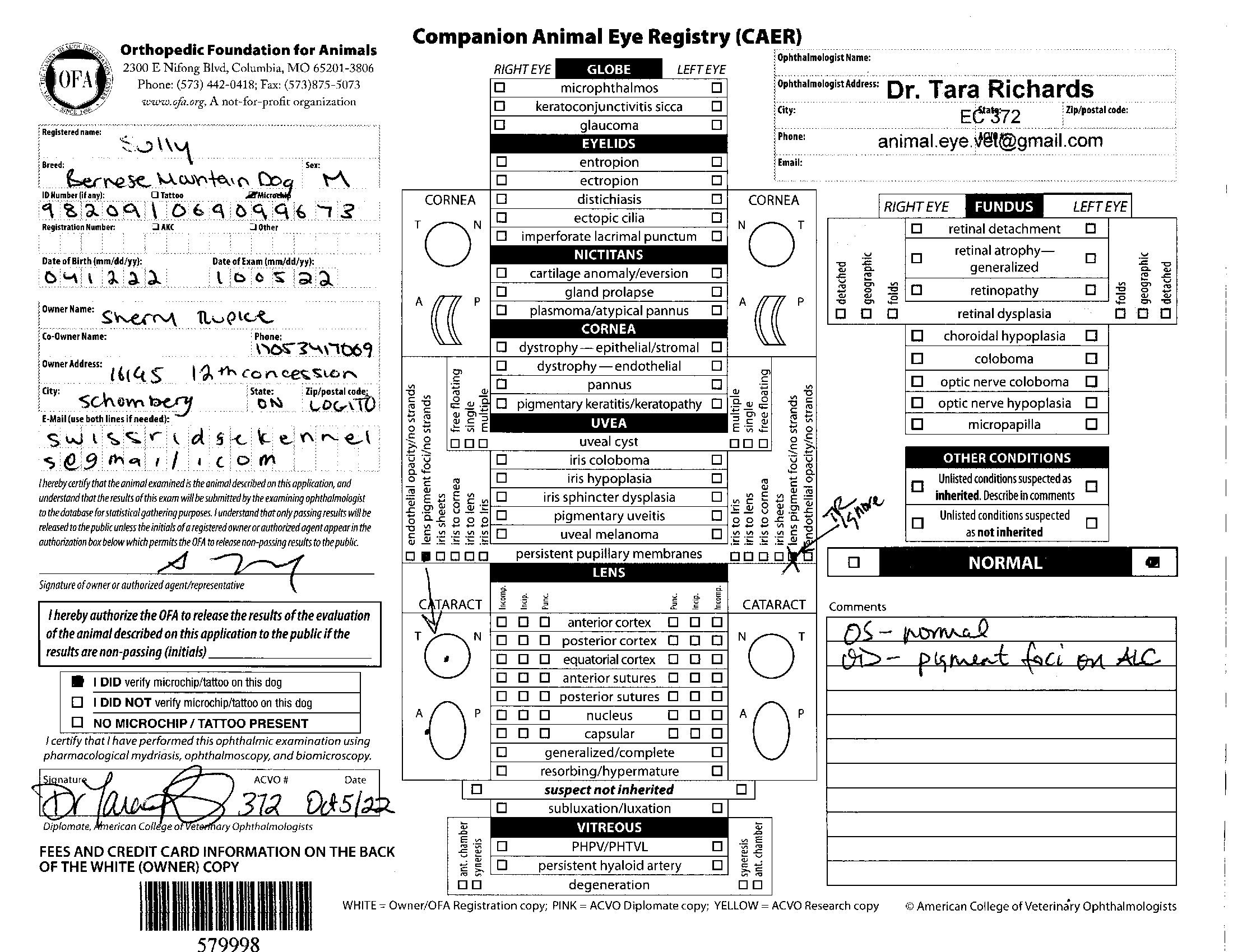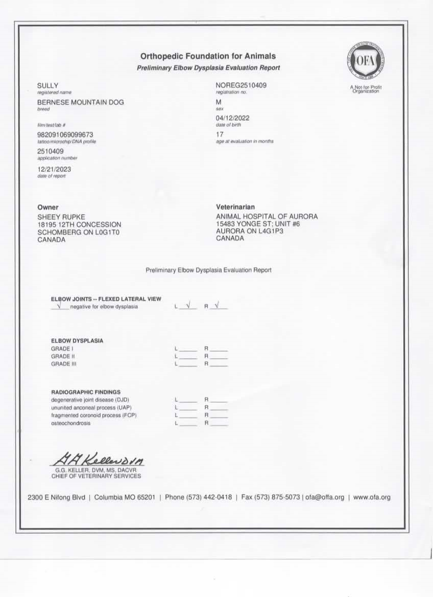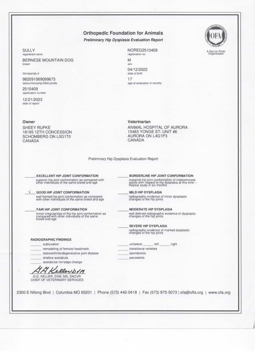 Sully has been fully health tested, and his health certificates are attached for your review. At SwissRidge, we complete thorough health testing on all of our dogs, including x-rays, DNA testing, and comprehensive physical exams performed by a licensed veterinarian to ensure we are breeding only the healthiest dogs who will go on to produce strong, healthy puppies.