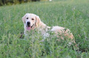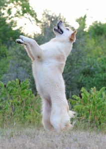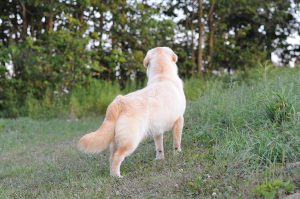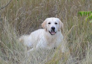 She is an outgoing dog. She is brave, confident, energetic, and always ready for adventure. Compared to other Golden Retrievers in my kennel, she is on the more active side. Vienna needs her daily trail walks and loves to play in the yard with toys and her friends. She lives for her walks, running through the forest and exploring. On the way to the trails, we leash the dogs as we pass through the parking lot before giving them off-leash access. Vienna loves to carry the leashes in her mouth and “help” walk the others. She is excellent off-leash, wandering ahead but coming immediately when called. Once she has burned off her energy, she settles quickly, but everyone at the kennel knows she needs her daily exercise.