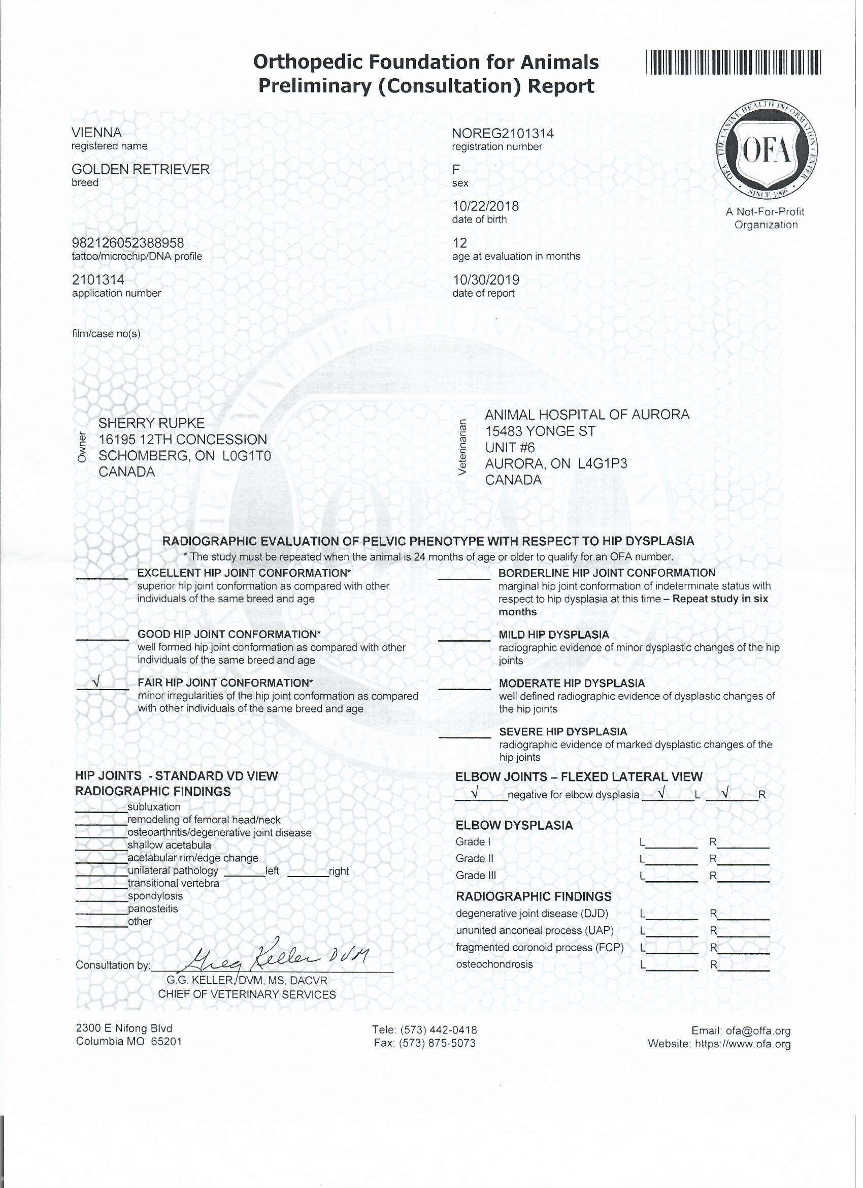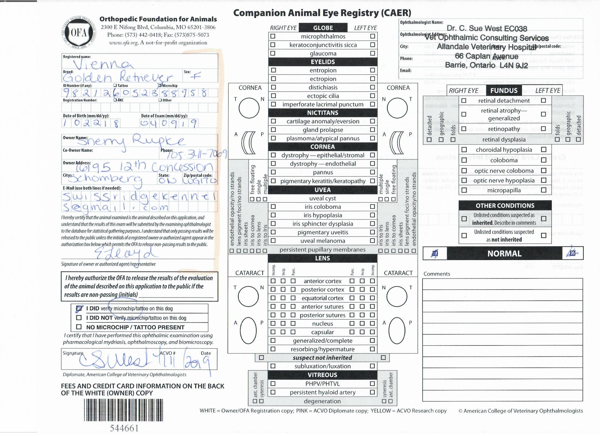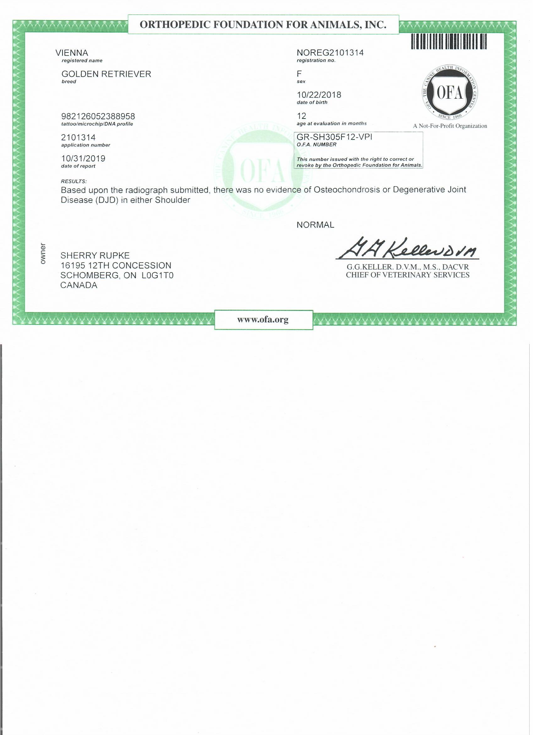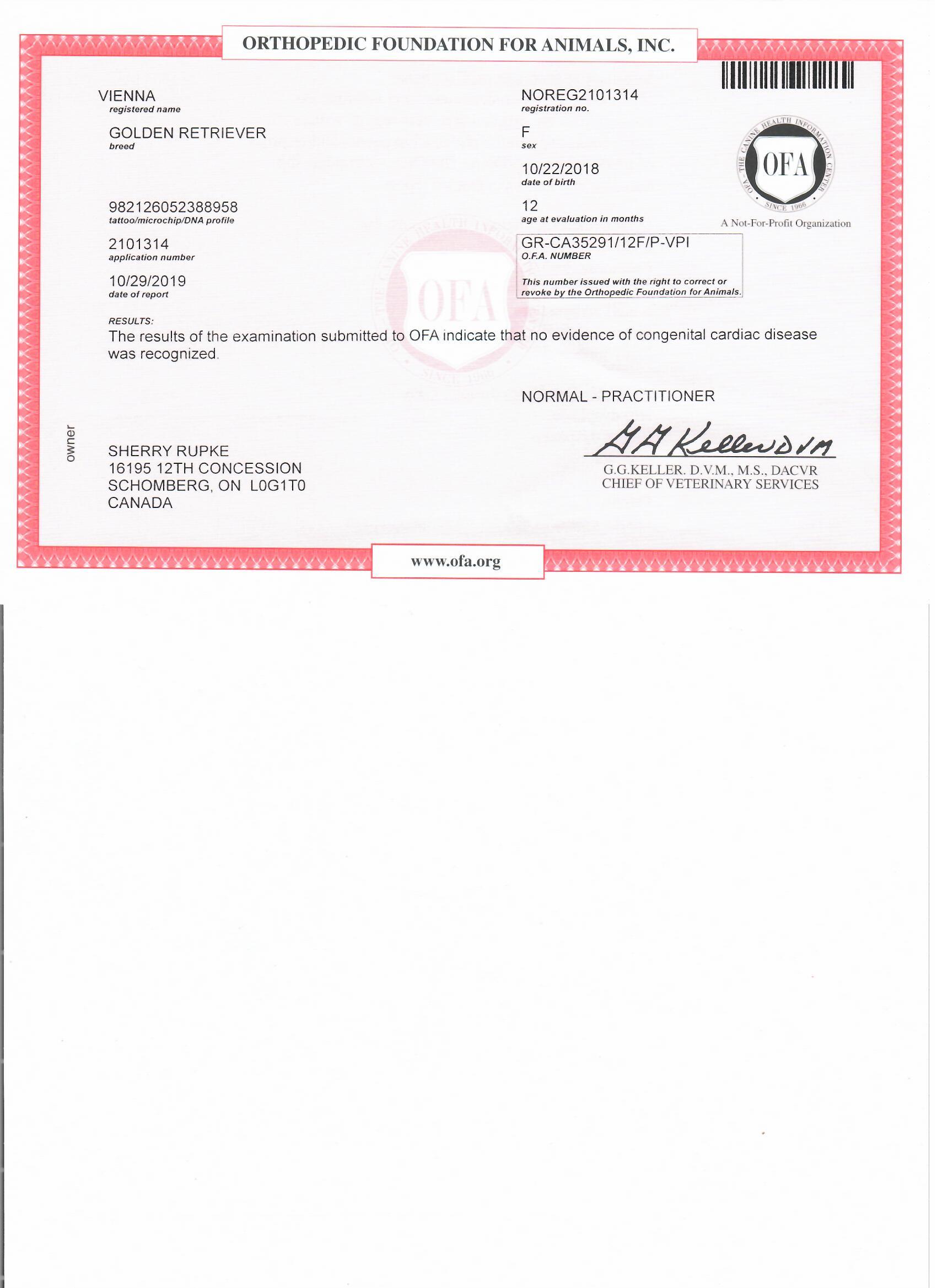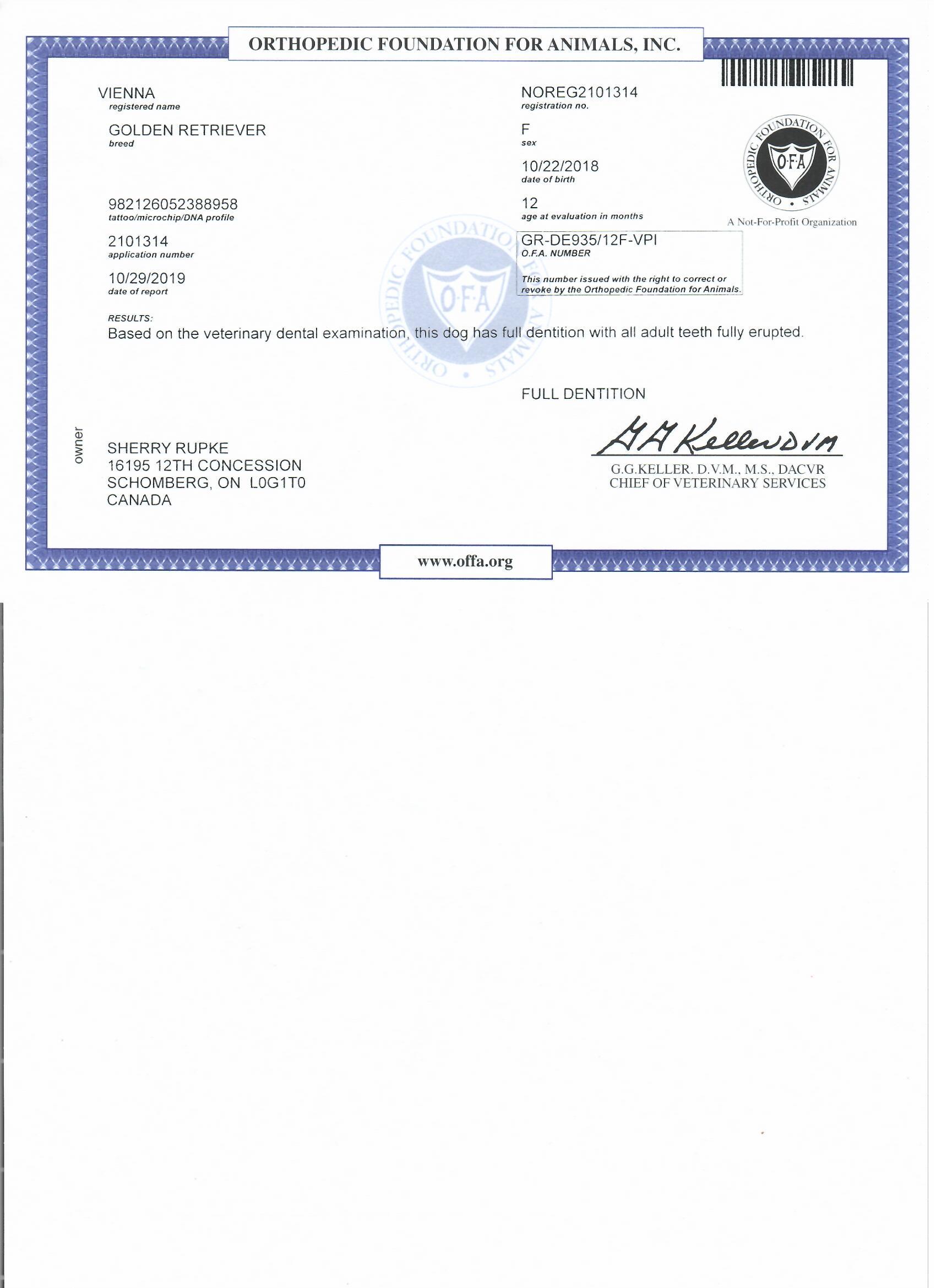 Vienna has been fully health tested, and her health certificates are attached for your review. At SwissRidge, we complete thorough health testing on all of our dogs, including x-rays, DNA testing, and physical exams performed by a licensed veterinarian to ensure we are breeding only the healthiest dogs who will go on to produce strong, healthy puppies.