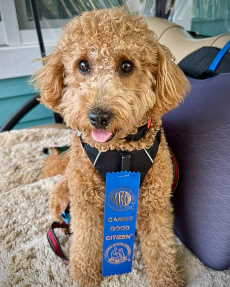 We adopted Maisie (from Nelson and Dior’s litter born 11/2023) in March 2024. We took her home when she was 16 weeks old, so she had been in the imprinting program for 8 weeks. I cannot recommend this program enough. She arrived at our home and was almost fully housebroken, walked well on a leash, was well-socialized with other dogs and people, and had a good grasp on basic commands. We have continued with training, which has been seamless thanks to the imprinting she received as a puppy. She now joins us for trail walks off-leash, enjoys playing with other dogs in the dog park, and is overall a calm, happy, obedient member of our family. She is definitely bonded to us (and me specifically, who is with her the majority of the day) – she is often not further than 10 feet from my side in the house!