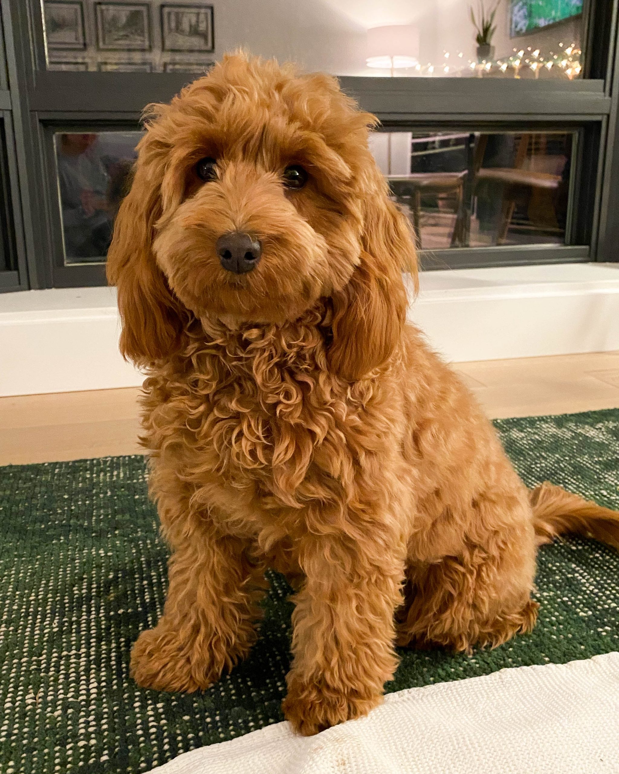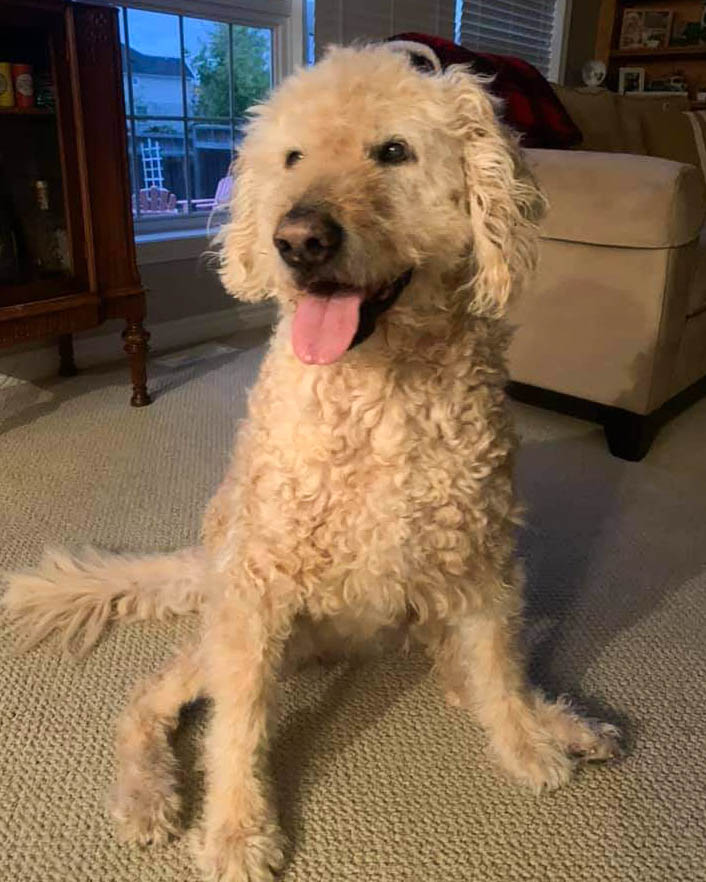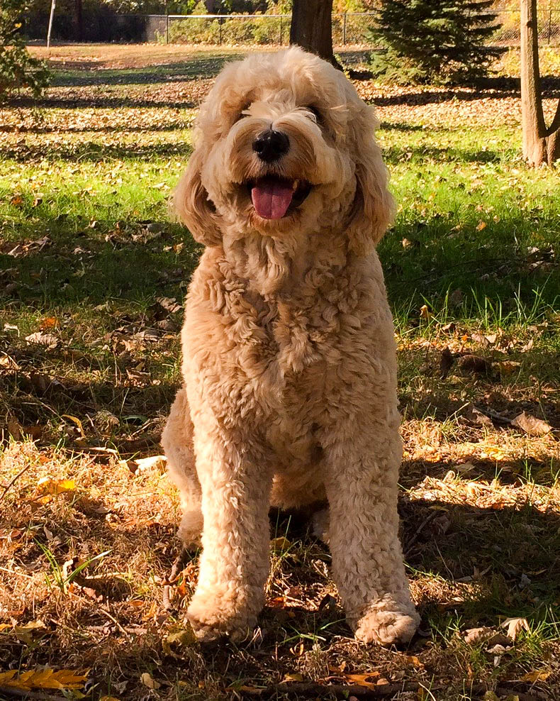 Bumble is an a Standard English Goldendoodle from Aurora (mom, english golden retriever) and Hendrix (standard poodle)