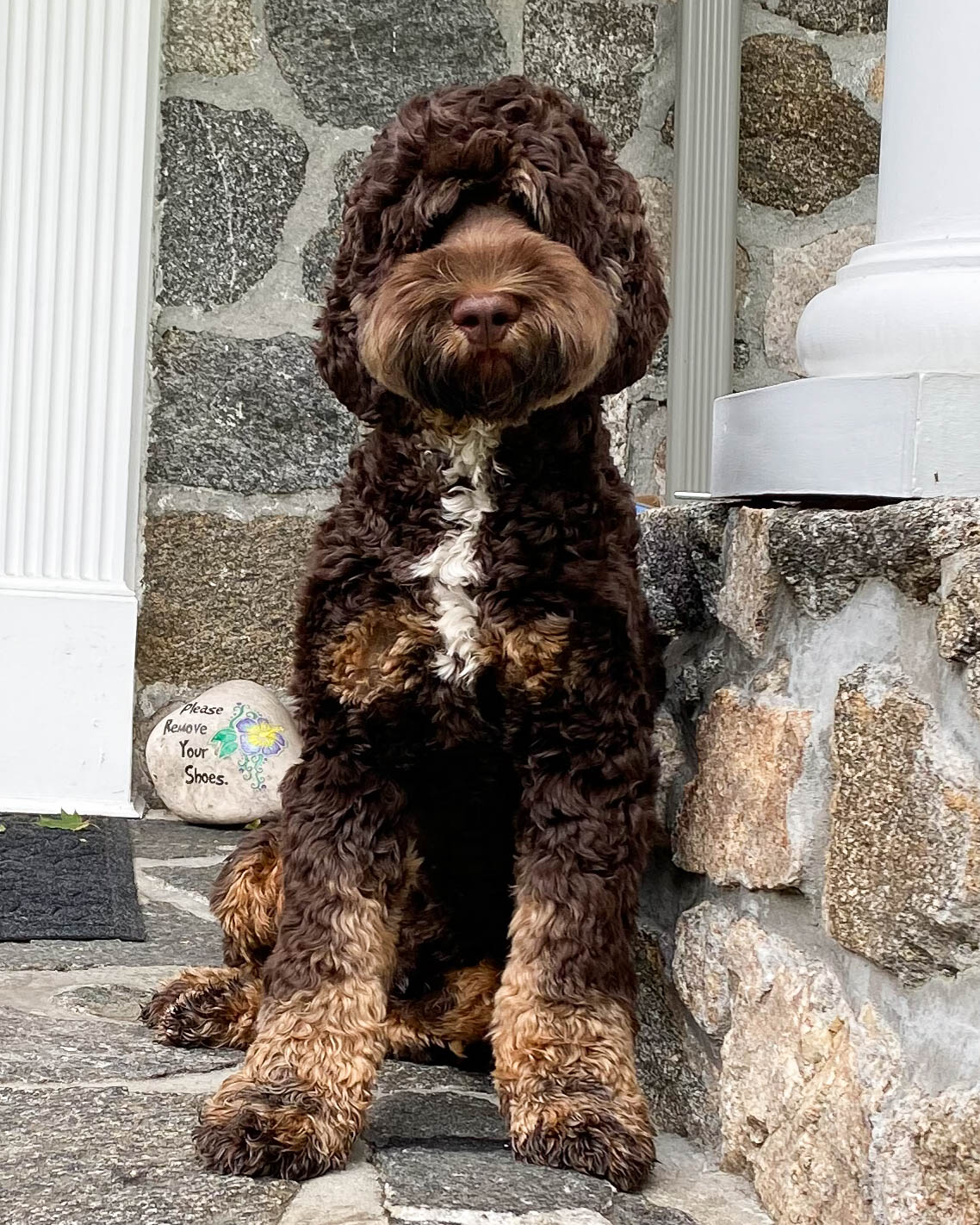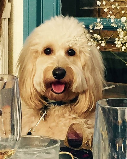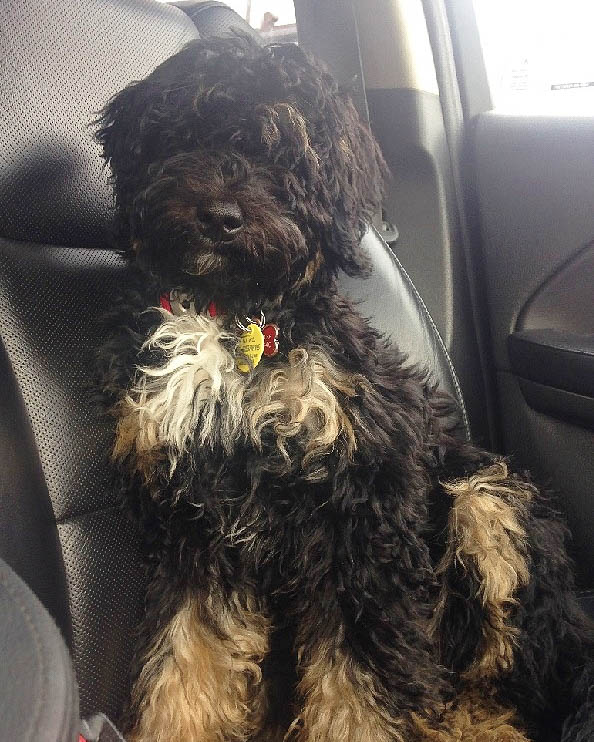 Sula is a mini doodle from Juno, a Bernese mountain dog, and Eddie, a poodle, born January 2, 2012. She is a total love and attention hound. Throughout my day I always have the feeling that sometimes I am being watched. As I take a glance around, Sula’s eyes are directly focused on me. If I leave the house she will assume her position in the front bay window and wait for my return. Sula loves everything and everyone. She always wants to know what is going on. Whether you are driving a car, sitting on the couch, or yes, even sitting at the kitchen counter, Sula is right by your side. She is very vocal and opinionated and will express her opinion any chance she gets! We only wish we knew what she was trying to say.