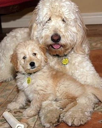 Beverly has many more stories about Luna and how great she is! This is only the start of it, lol! Beverly was so happy with Luna that she also purchased Maggie from me. This is what she has to say about Maggie: “Miss Maggie Muggins!!! She is such a cuddly and loving dog and so very smart. When I signed her up for training classes, the instructor decided to move her to level two as she already knew all the commands from level one. She is learning to play soccer right now…Luna is her teacher!!! She plays hard with Luna and then flops down and falls asleep. She recently discovered how much fun the water can be and is splashing around in the lake like a pony but not quite brave enough yet to swim. I expect that will happen within a week as she is watching Luna and I can see she wants to go in. She is 45 pounds right now at five months and, based on the size of her paws, I expect will be a big girl. She is losing her puppy coat and starting to wave up really nicely and David and I expect she will look very much like Luna. She is a really social dog (show me a doodle that isn’t) and people want to cuddle her and play with her whenever they see her. A little girl and boy in our neighborhood come to the door every few days to ask if they can play in the backyard with Maggie and Luna. Once again, Sherry, you have matched us with the perfect puppy. I’m so glad I found you because there are too many unethical breeders out there. Keep producing the best dogs in the world!!!” ~Beverly McConney