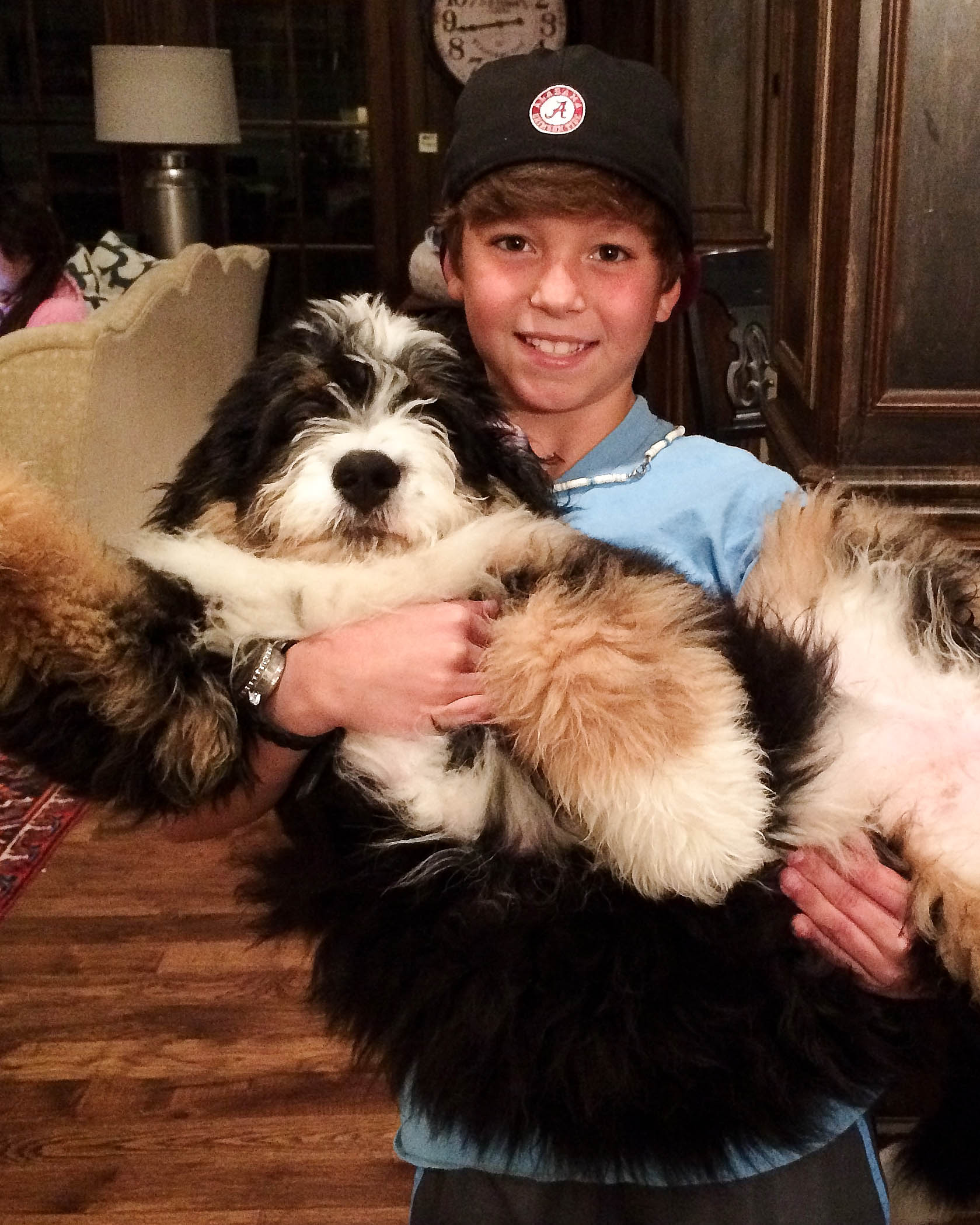 My family has begged for a dog for years. Everyone was on board except me as I did not grow up with dogs and did not think our on-the-go family could take on such a responsibility. My children are now 14 (Gracie), 13 (Hannah), and 11 (TJ), and I started to realize I didn’t have a baby anymore to nurture. A friend emailed me a picture of a puppy a couple of years ago that I always held on to because I knew if the family ever won out on the puppy debate, THAT would be the puppy I would want! Turns out it was a Bernedoodle from SwissRidge! I finally caved in, and I emailed Sherry and inquired about this breed. She suggested I read her book, which is all about Bernedoodles. So I read it, twice! I did lots of research and asked lots of questions. I became one of the many fanatical stalkers on the SwissRidge Facebook page and that is where I learned just how beautiful, smart and awesome Sherry’s Bernedoodles really are.
